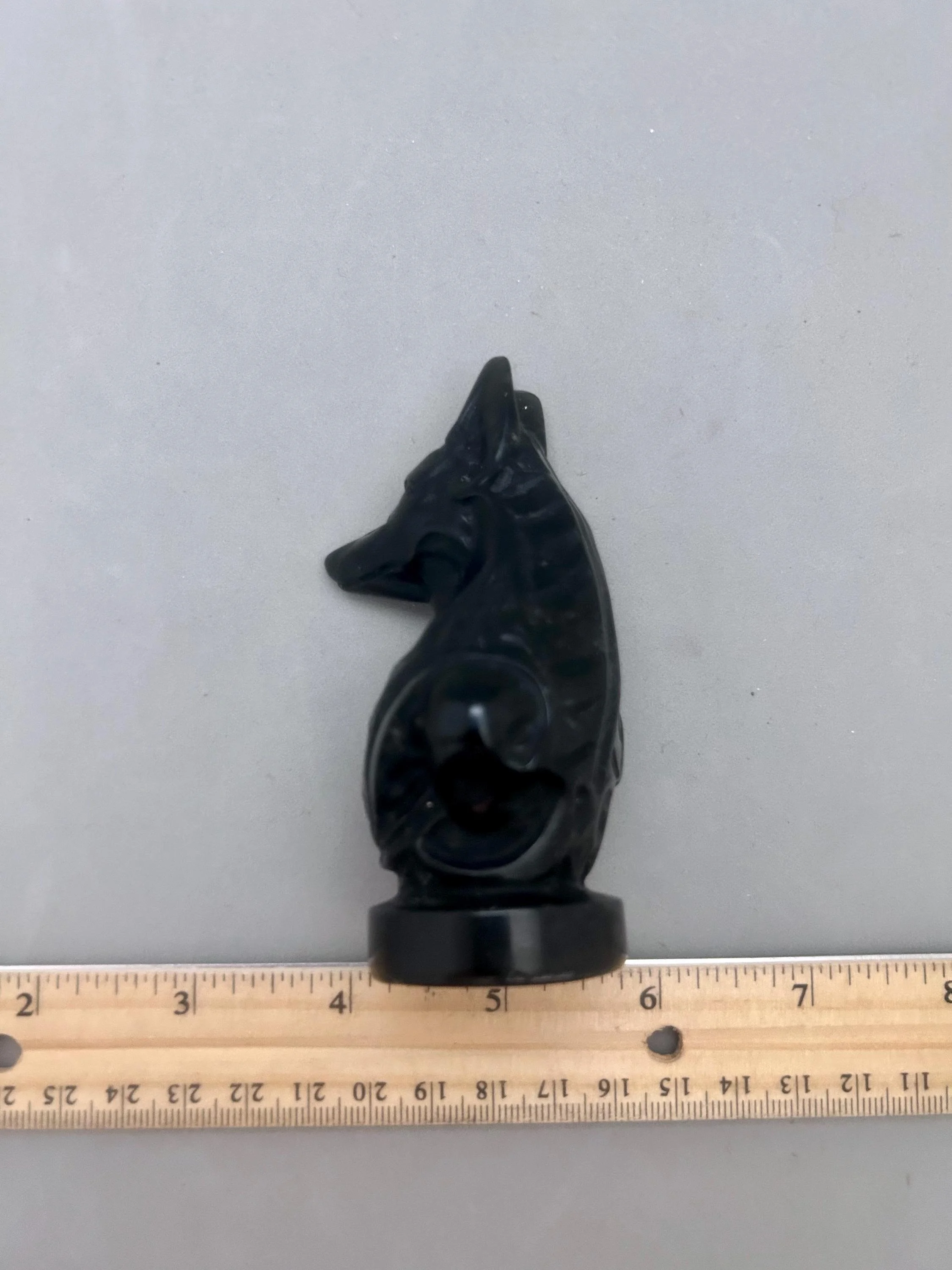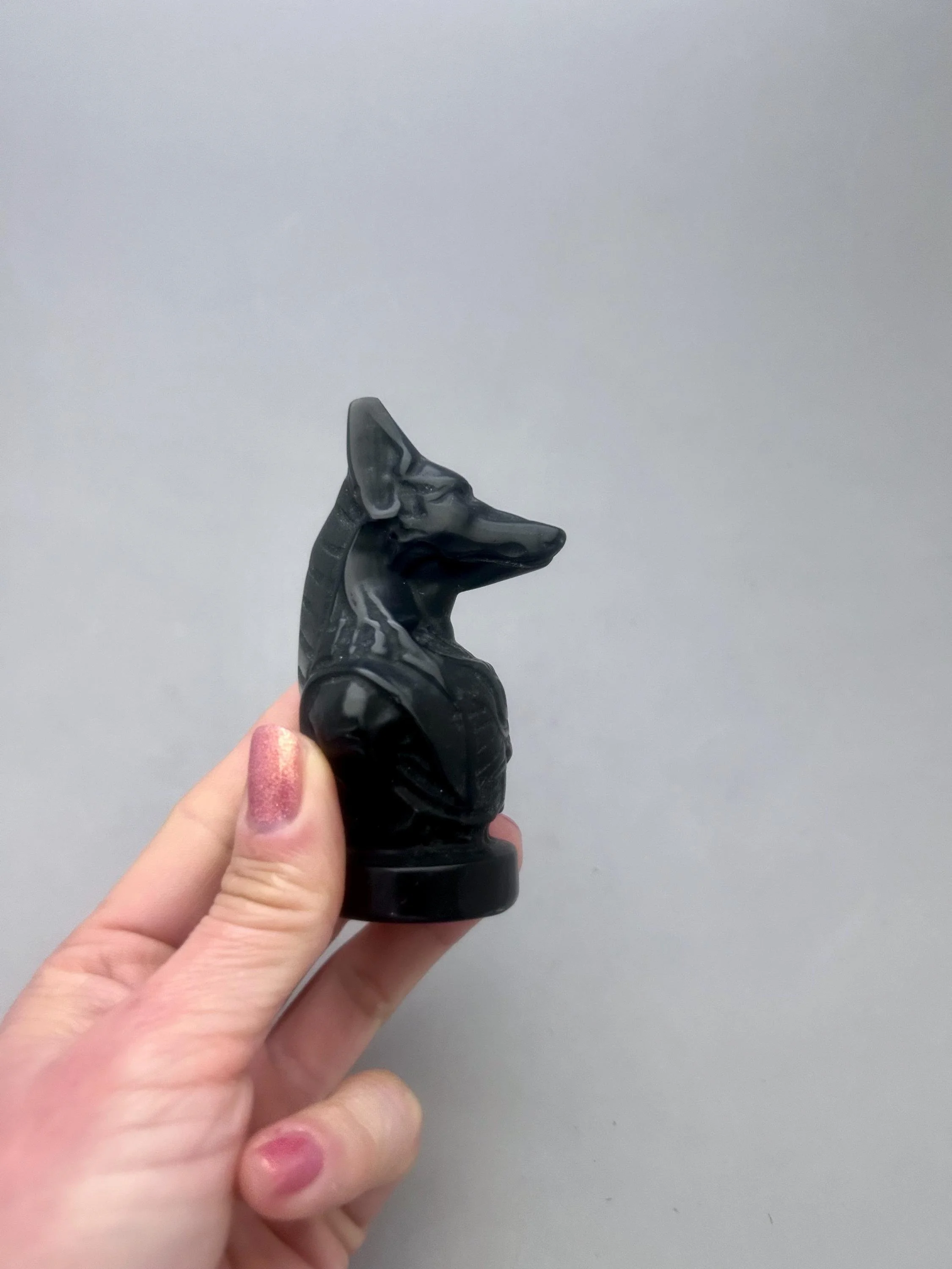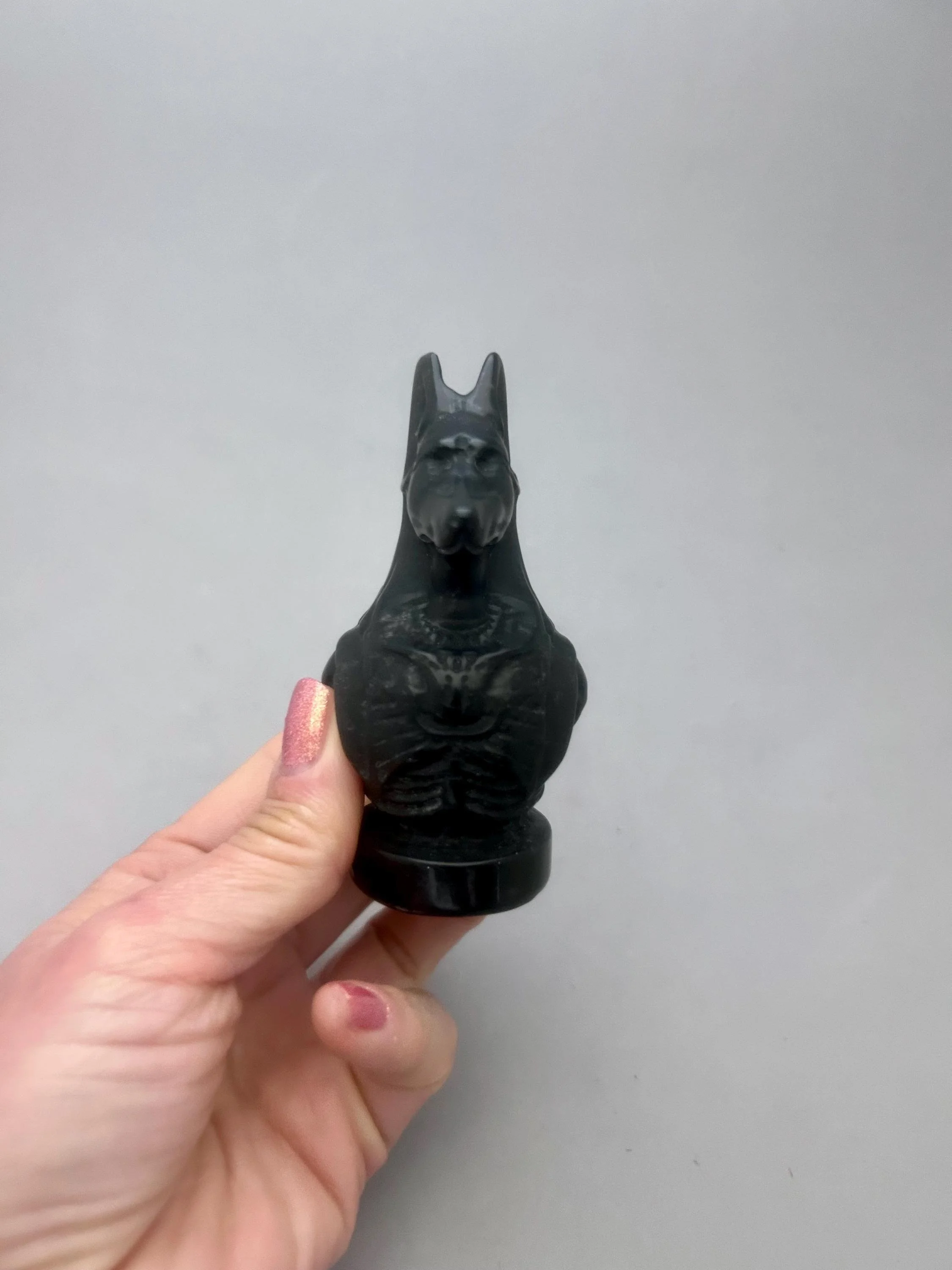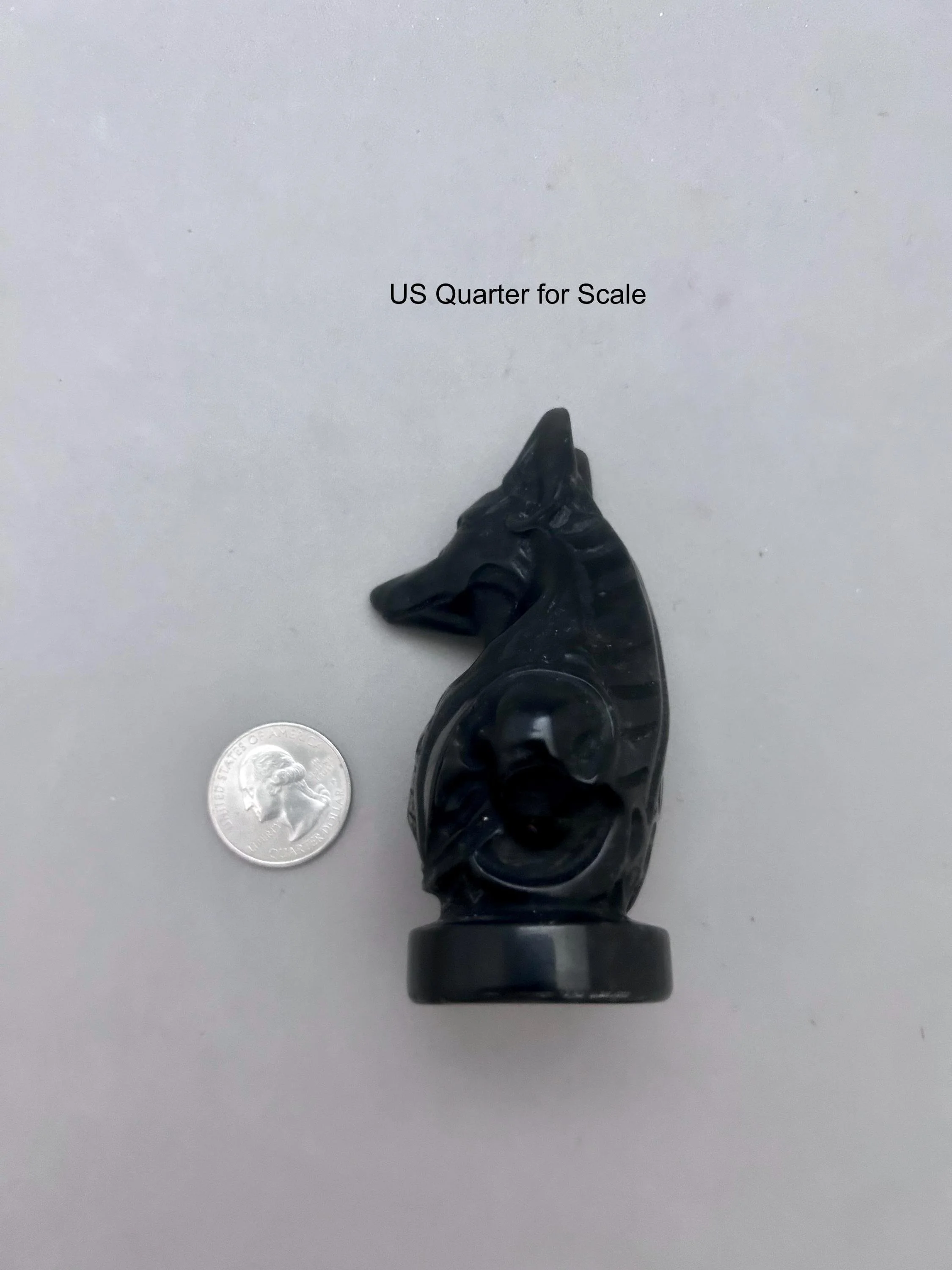 Anubis is an Egyptian god, known as the God of the Dead. He is depicted with the head of a jackal, and helped guide souls into the afterlife. It's thought that he is depicted with the jackal head as many jackals were seen roaming the areas of the tombs in Ancient Egypt. This carving is made from black obsidian and you will receive the exact piece as shown in the photos/video. It measures about 3 5/8" x 2 1/16" x 1 15/16" and weighs about 5.38 oz.