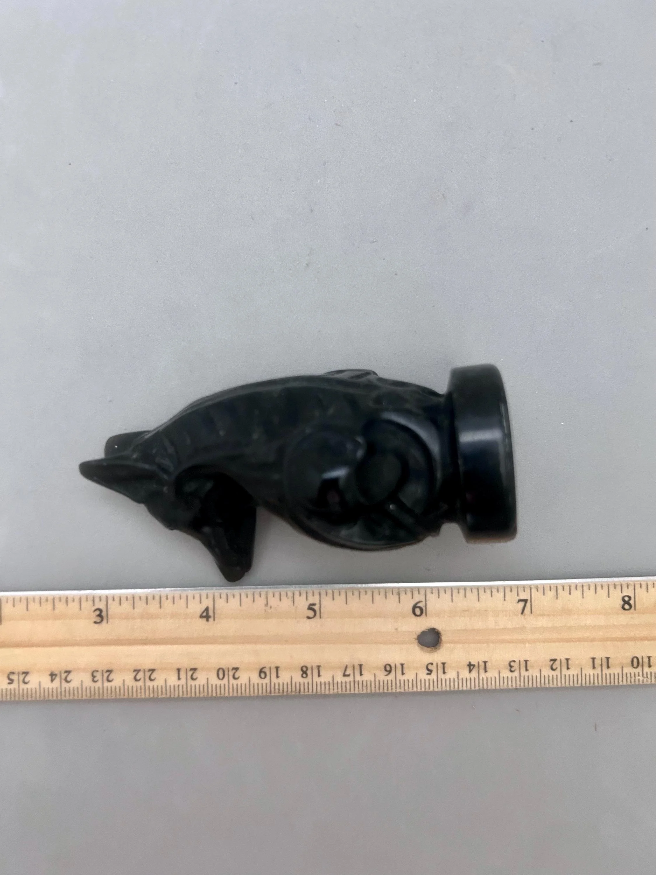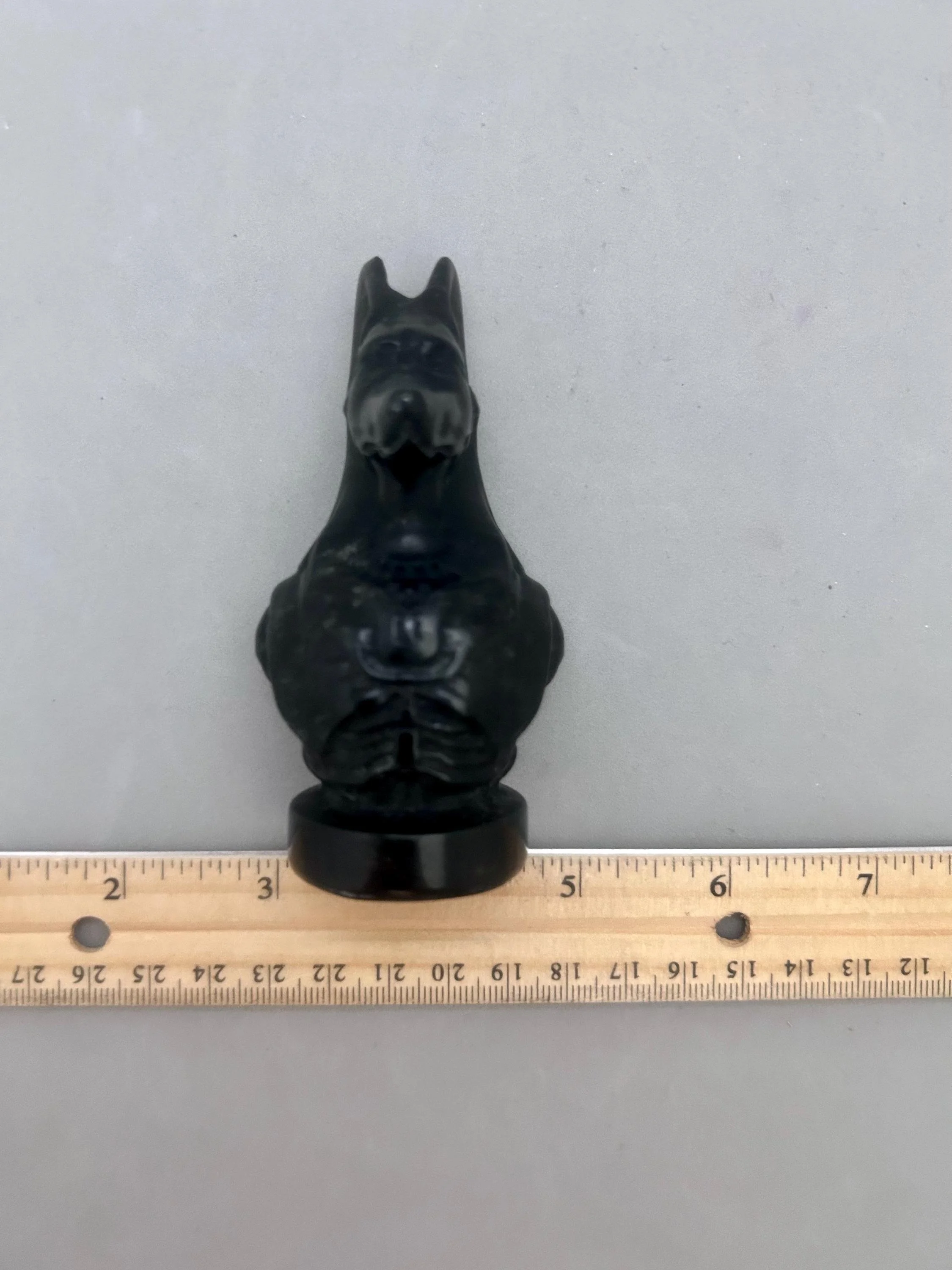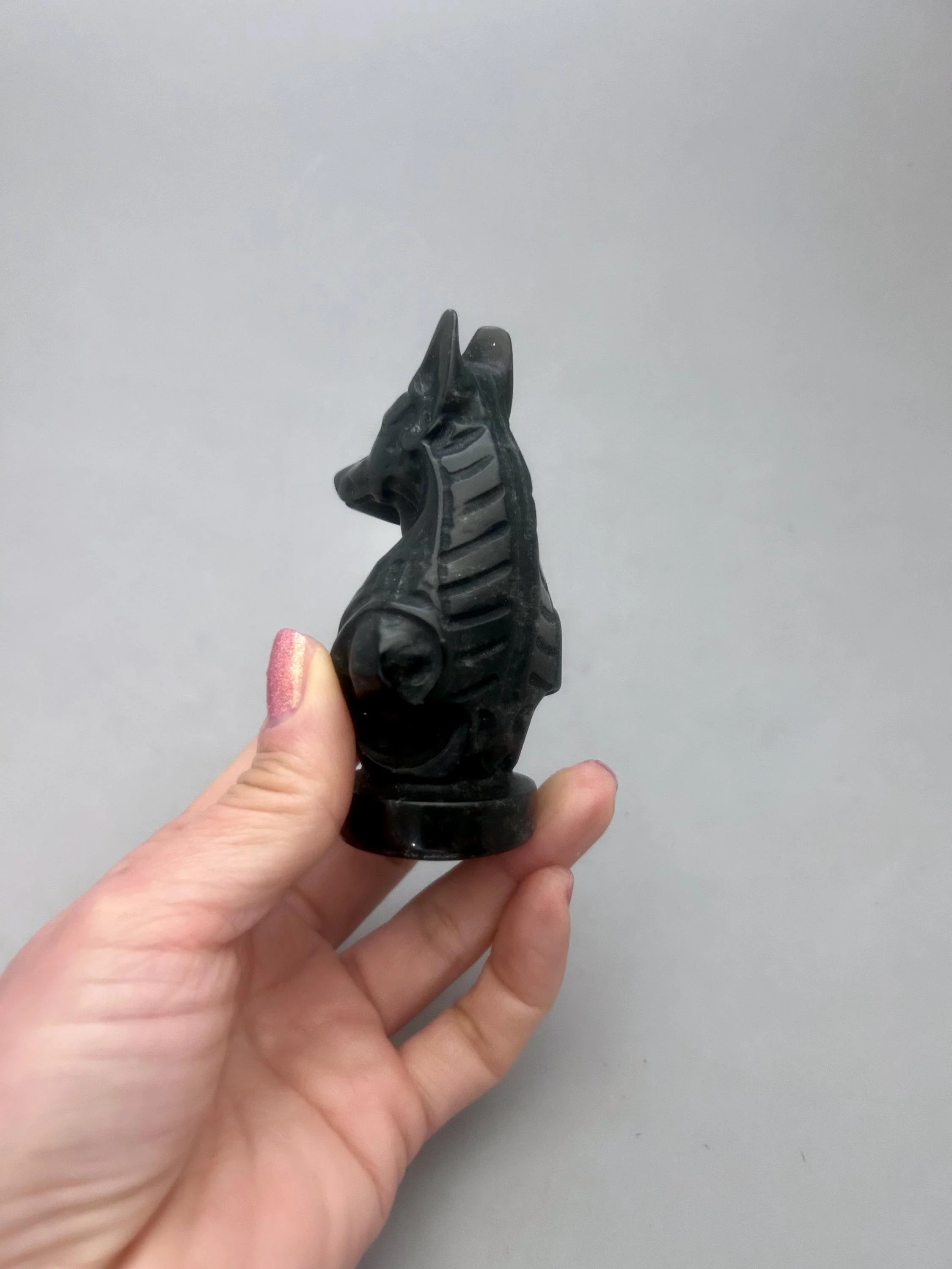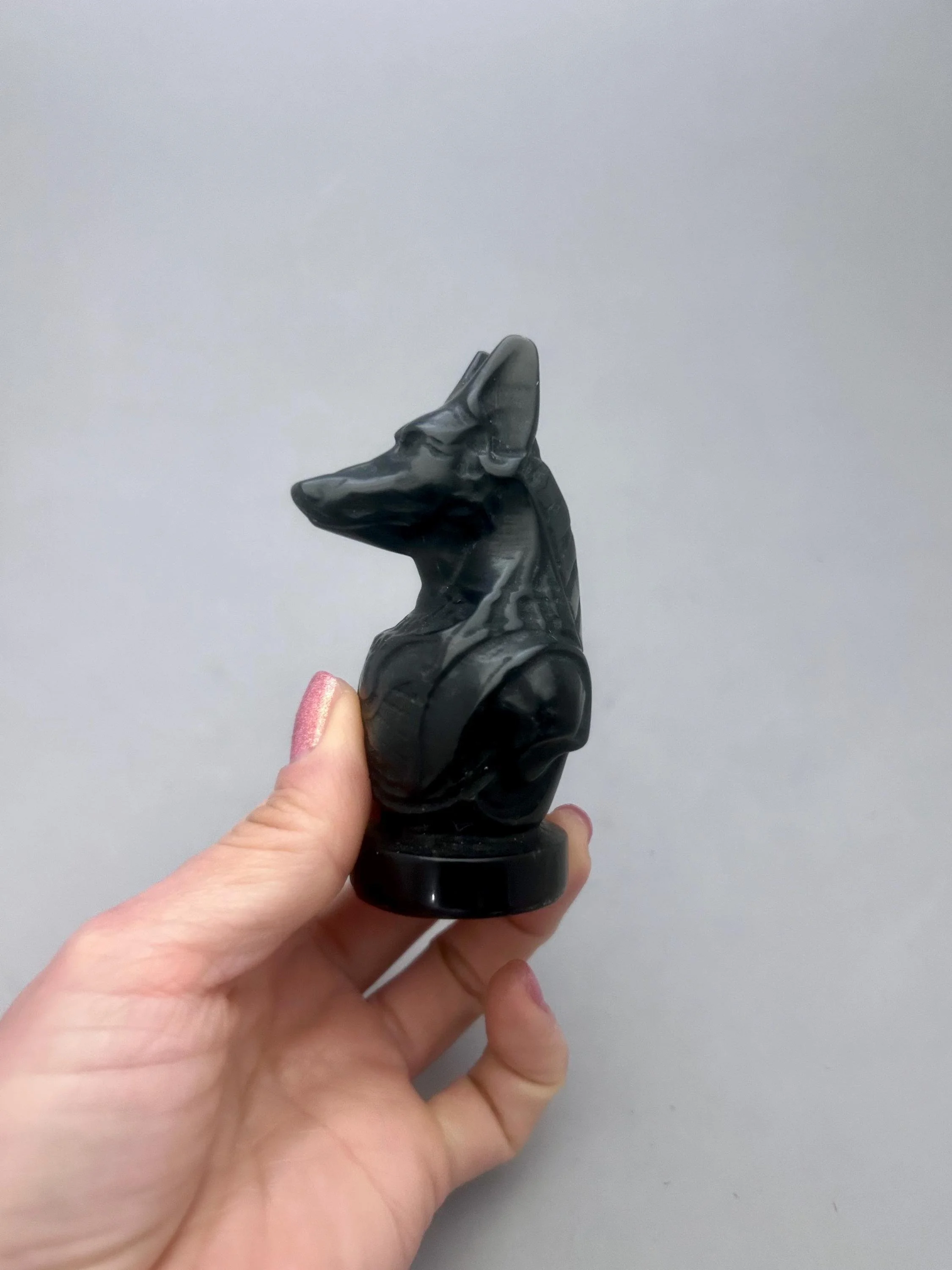 Anubis is an Egyptian god, known as the God of the Dead. He is depicted with the head of a jackal, and helped guide souls into the afterlife. It's thought that he is depicted with the jackal head as many jackals were seen roaming the areas of the tombs in Ancient Egypt. This carving is made from black obsidian and you will receive the exact piece as shown in the photos/video. It measures about 3 5/8" x 2 1/16" x 1 15/16" and weighs about 5.38 oz.