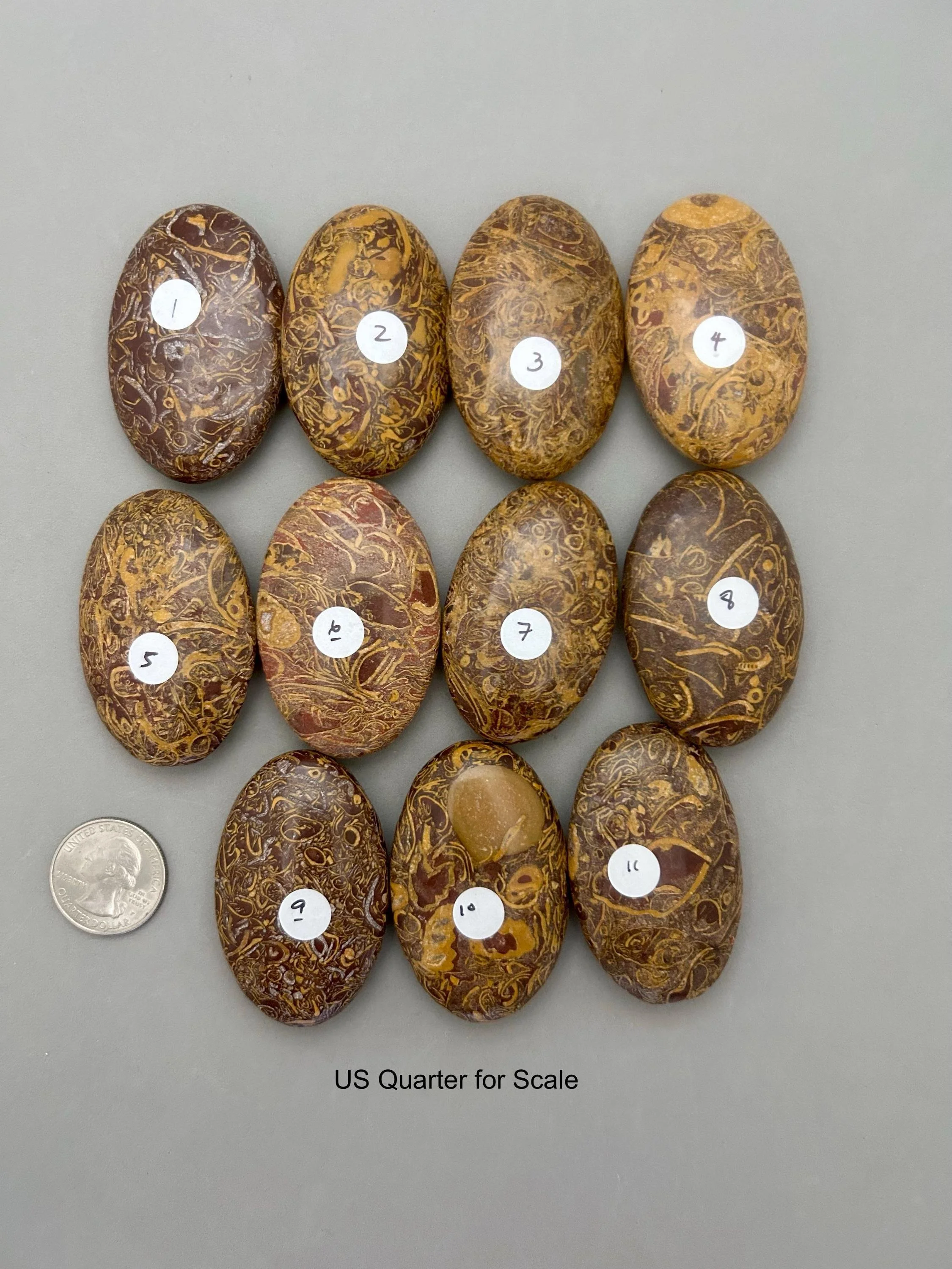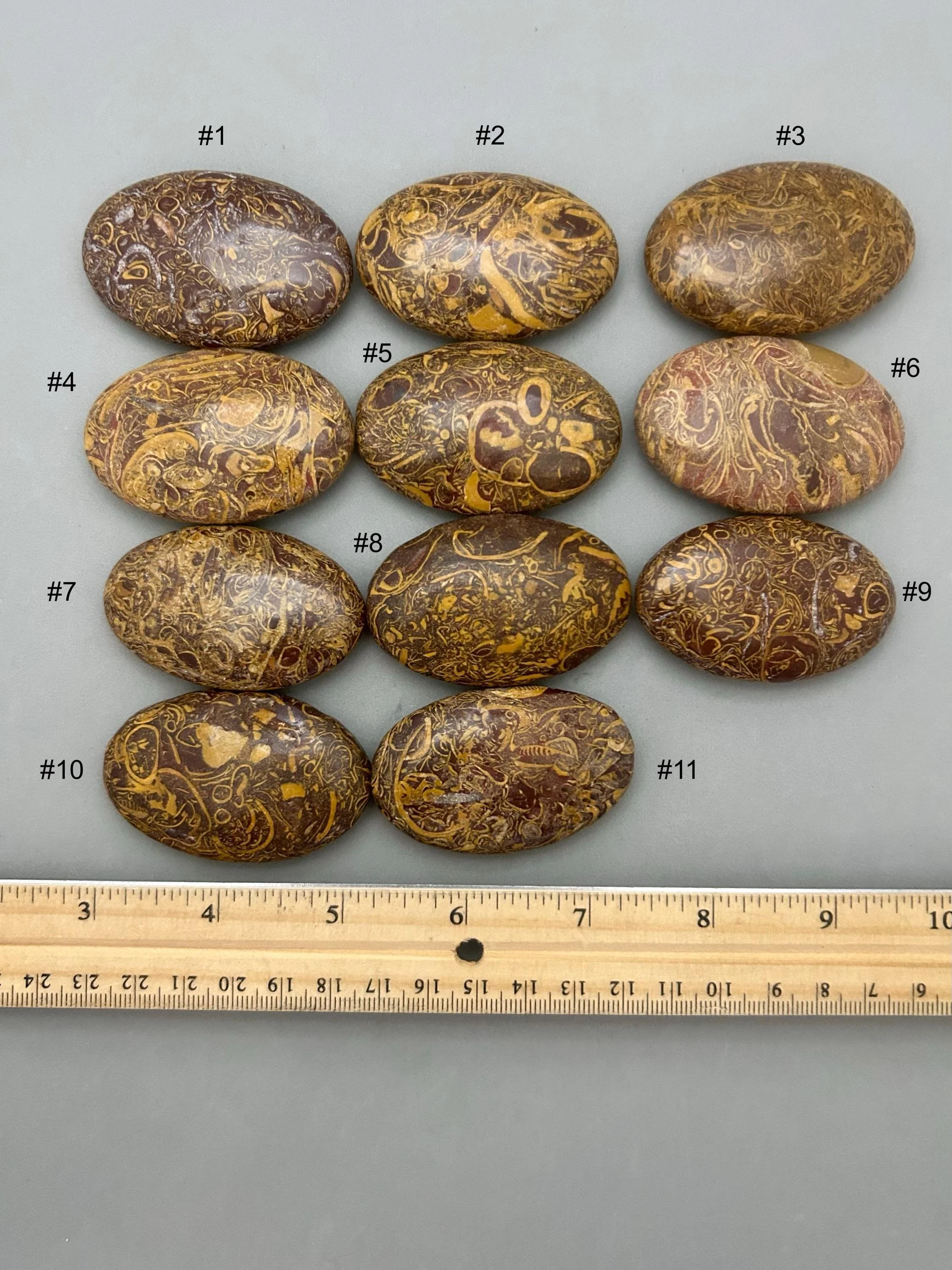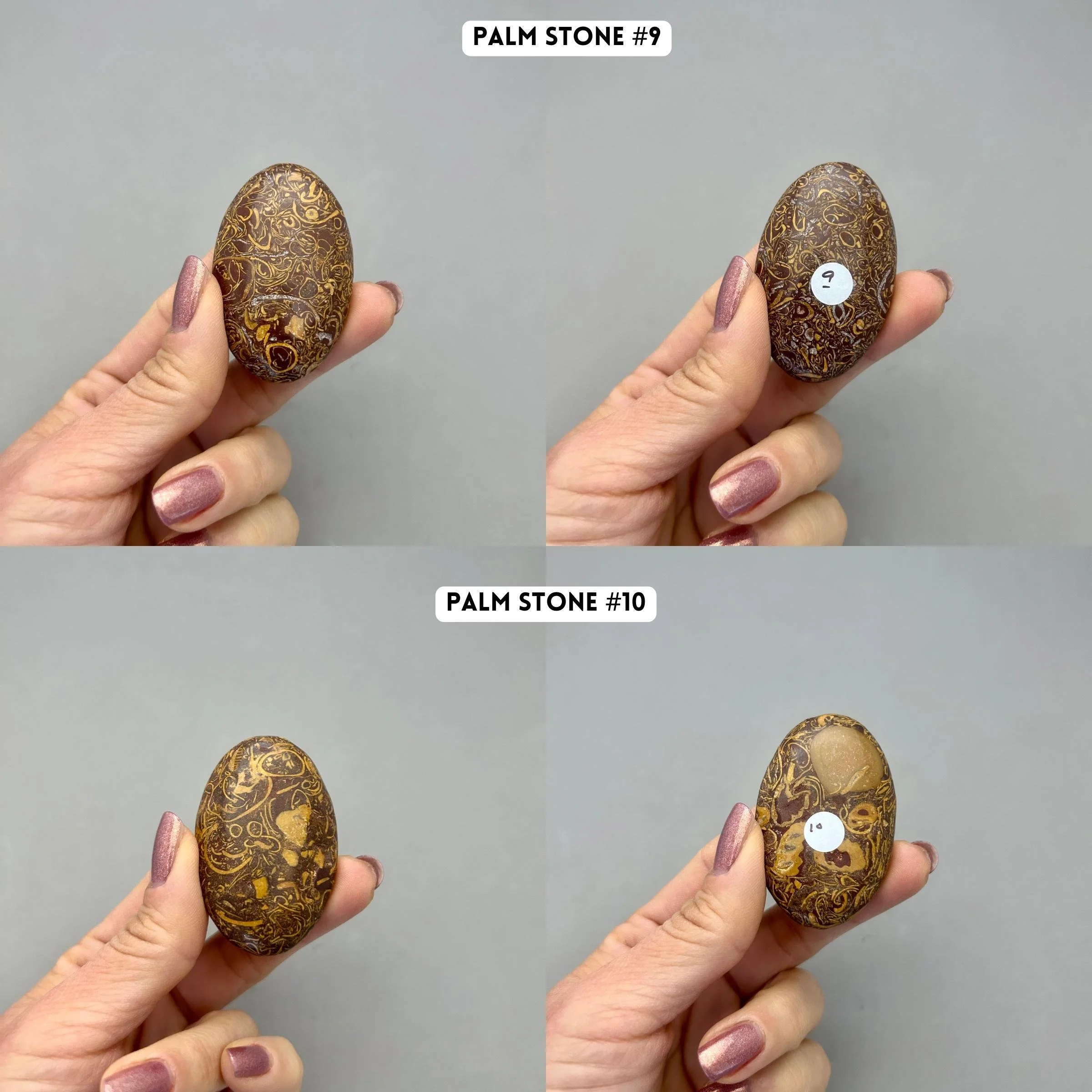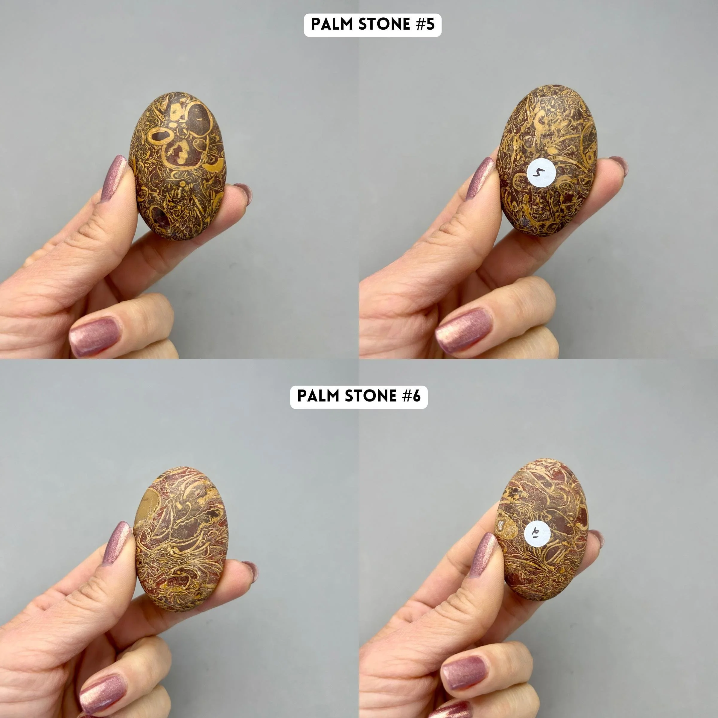 Calligraphy stone is a type of jasper that has inclusions of hematite and shell fossils. It is also known as Miriam Stone, Elephant Skin Jasper or Rubberstone, and even some other names! This listing is for one palm stone, which you'll choose upon checkout. Here are more details for each piece: