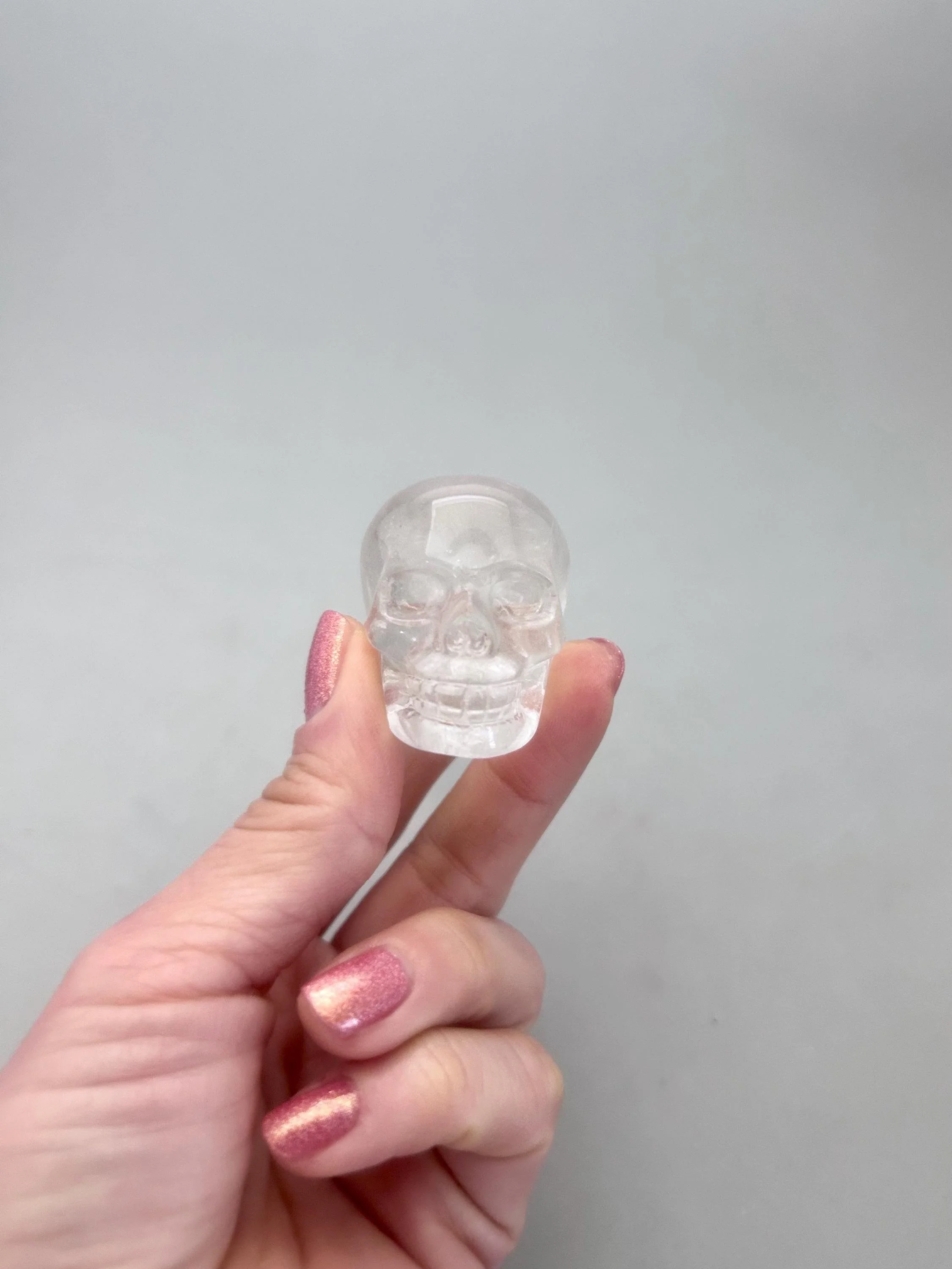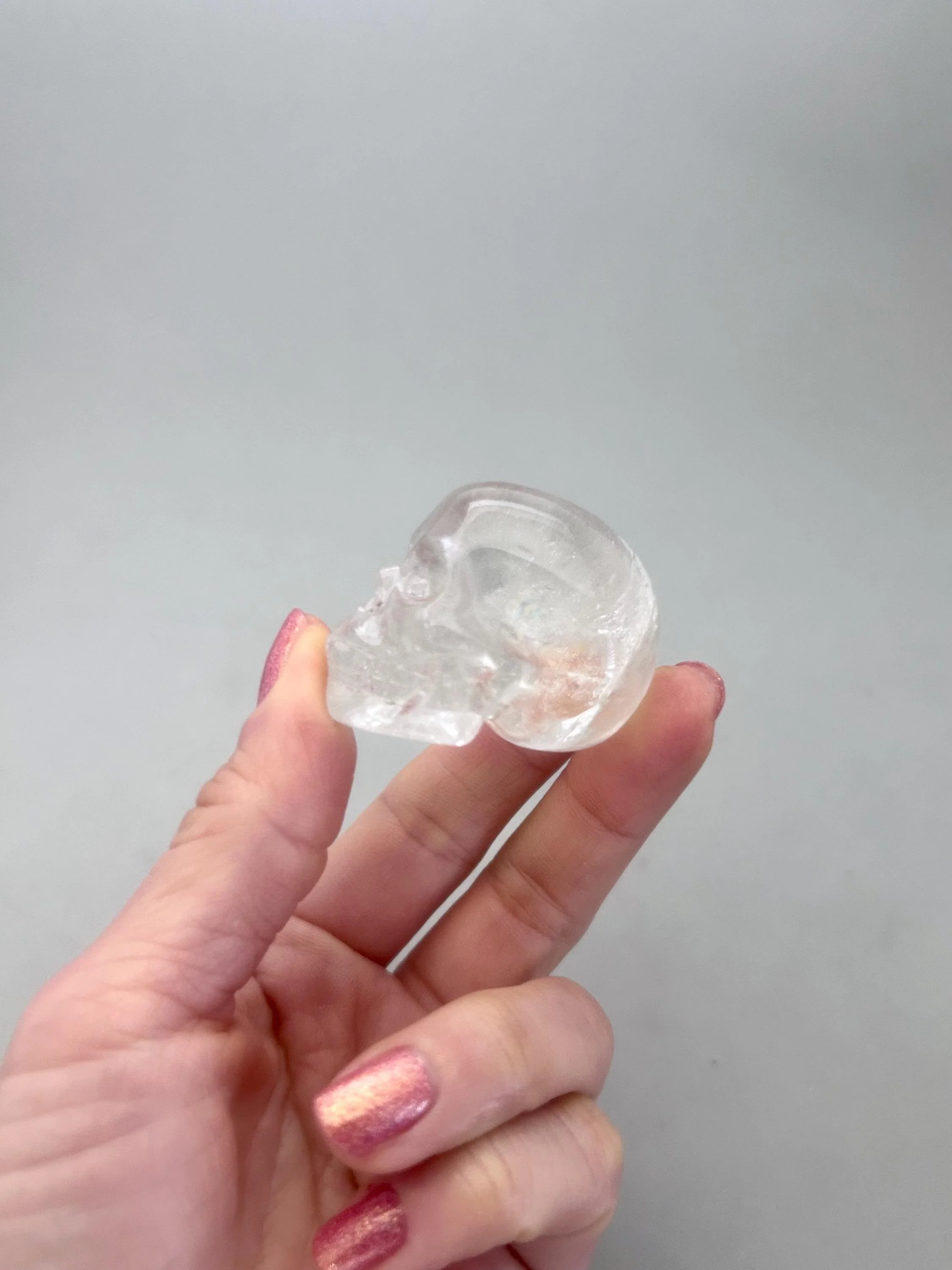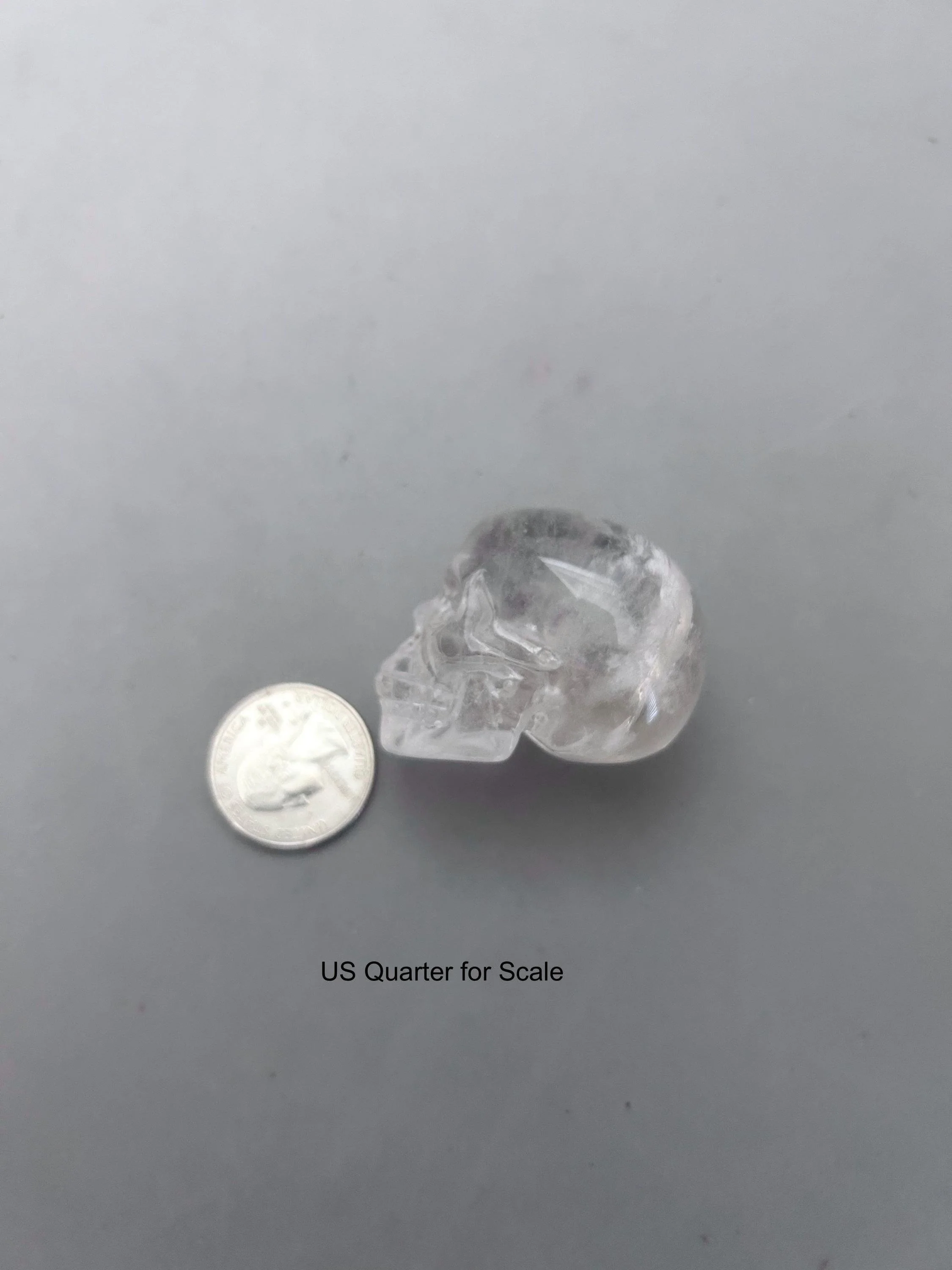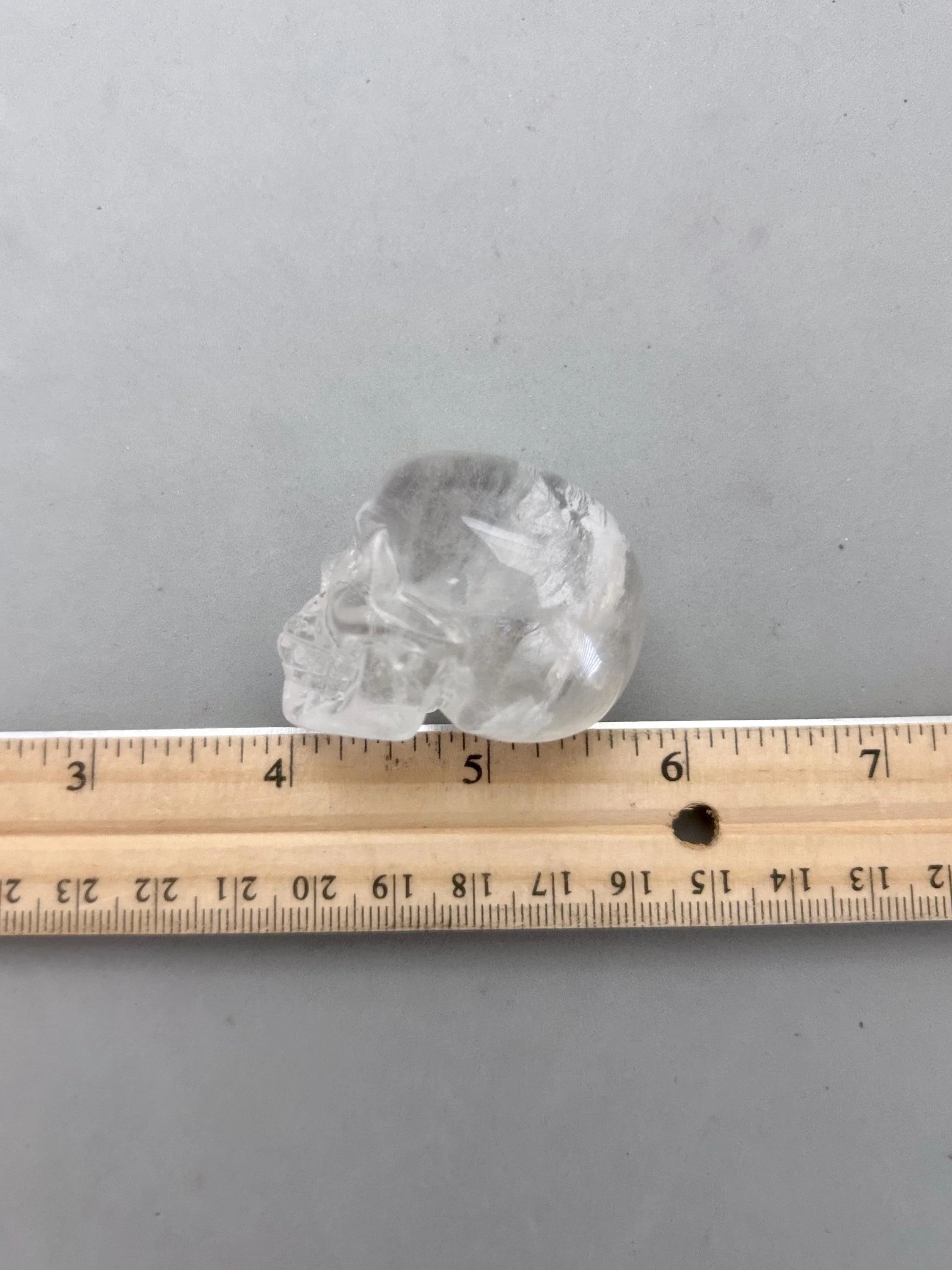 This listing is for a small clear quartz skull, measuring about 1 13/16" x 1 1/4" x 1 3/8" and weighing around 2.43 ounces. It has some inclusions at the base of the skull, and I can see rainbows inside! I like that on this piece the jaw has been hollowed out on the bottom. A nice detail that is usually overlooked.