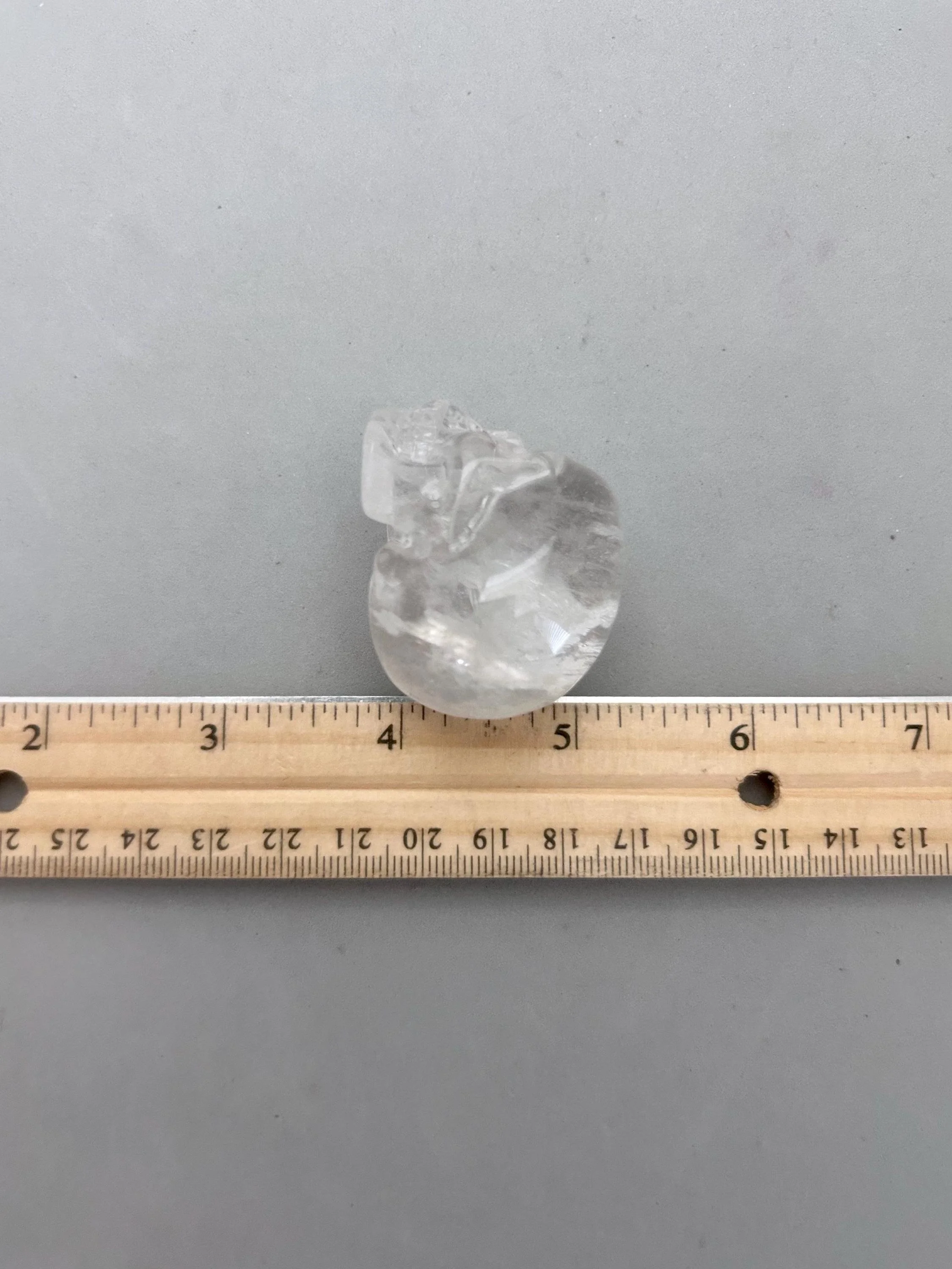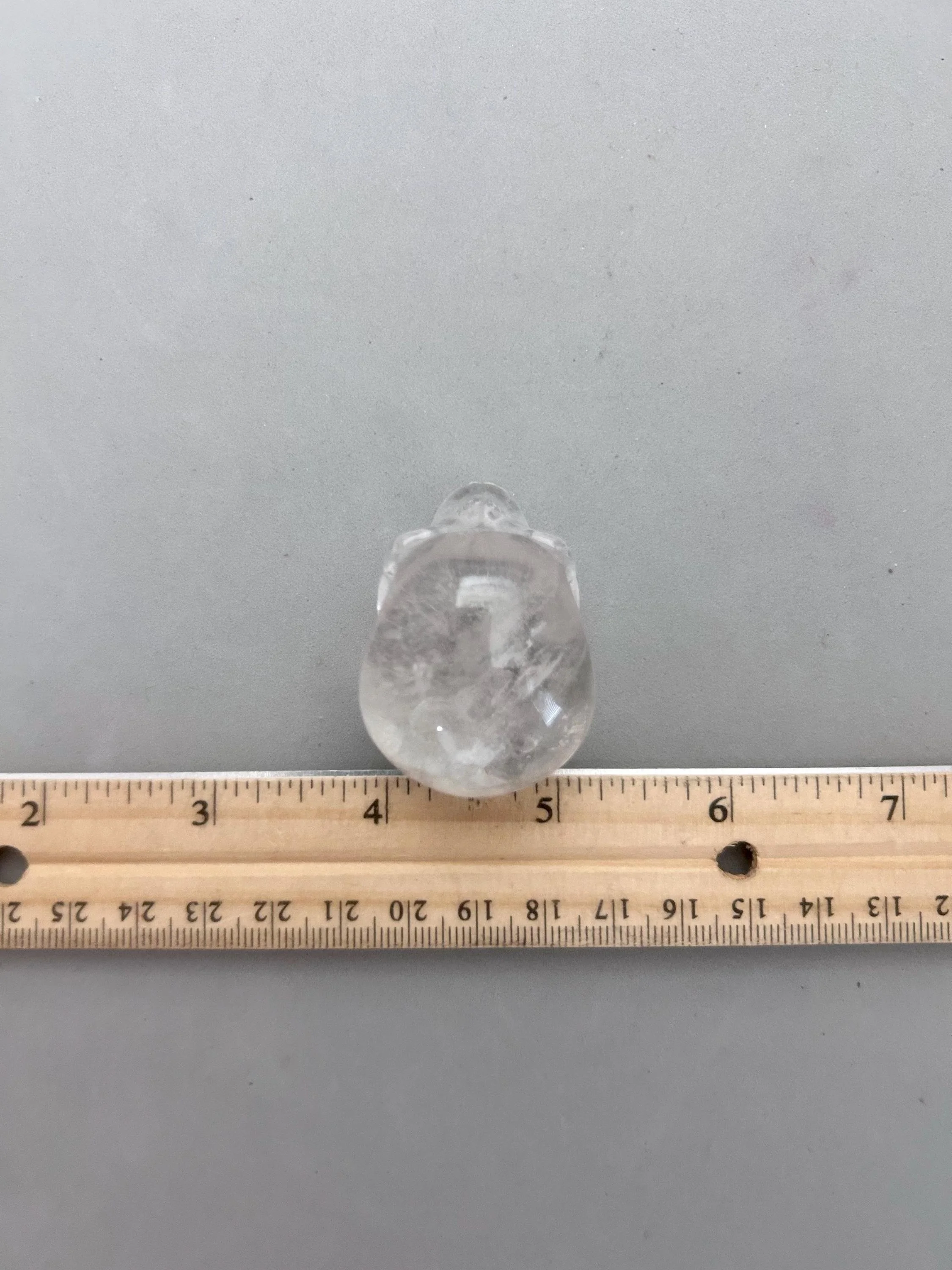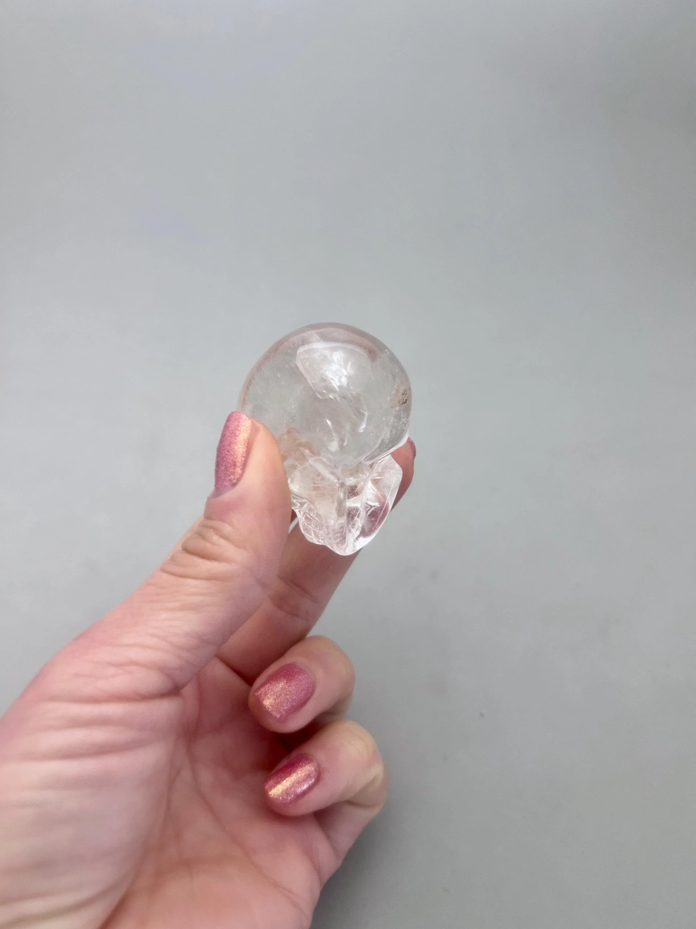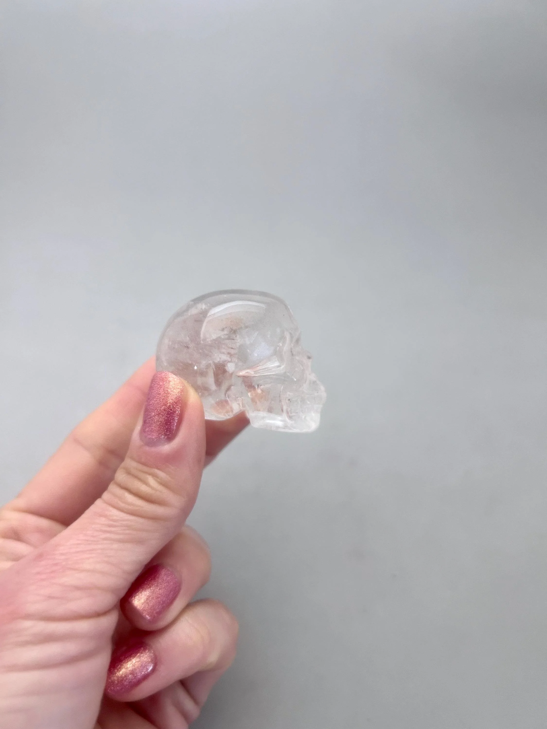 This listing is for a small clear quartz skull, measuring about 1 13/16" x 1 1/4" x 1 3/8" and weighing around 2.43 ounces. It has some inclusions at the base of the skull, and I can see rainbows inside! I like that on this piece the jaw has been hollowed out on the bottom. A nice detail that is usually overlooked.