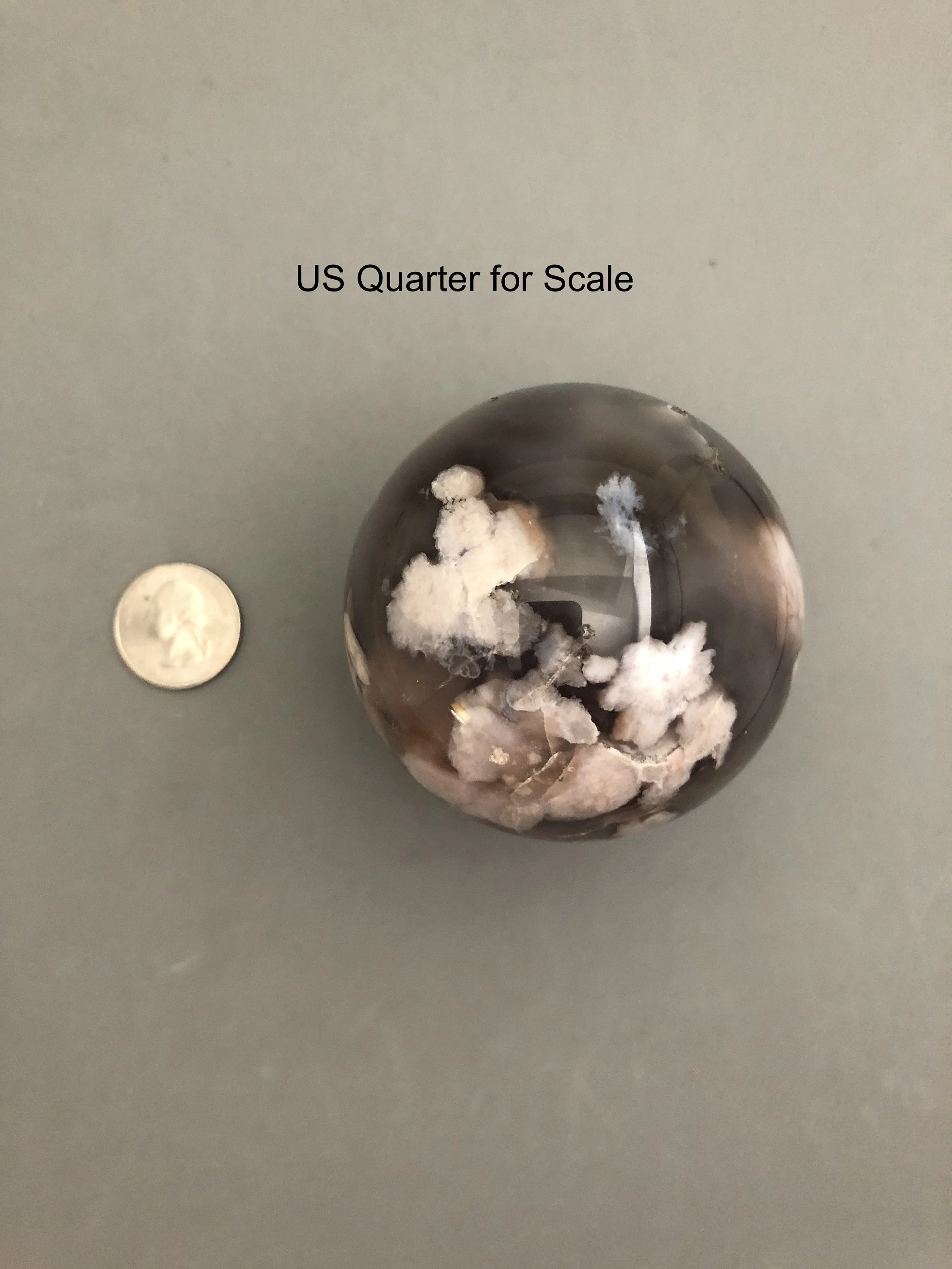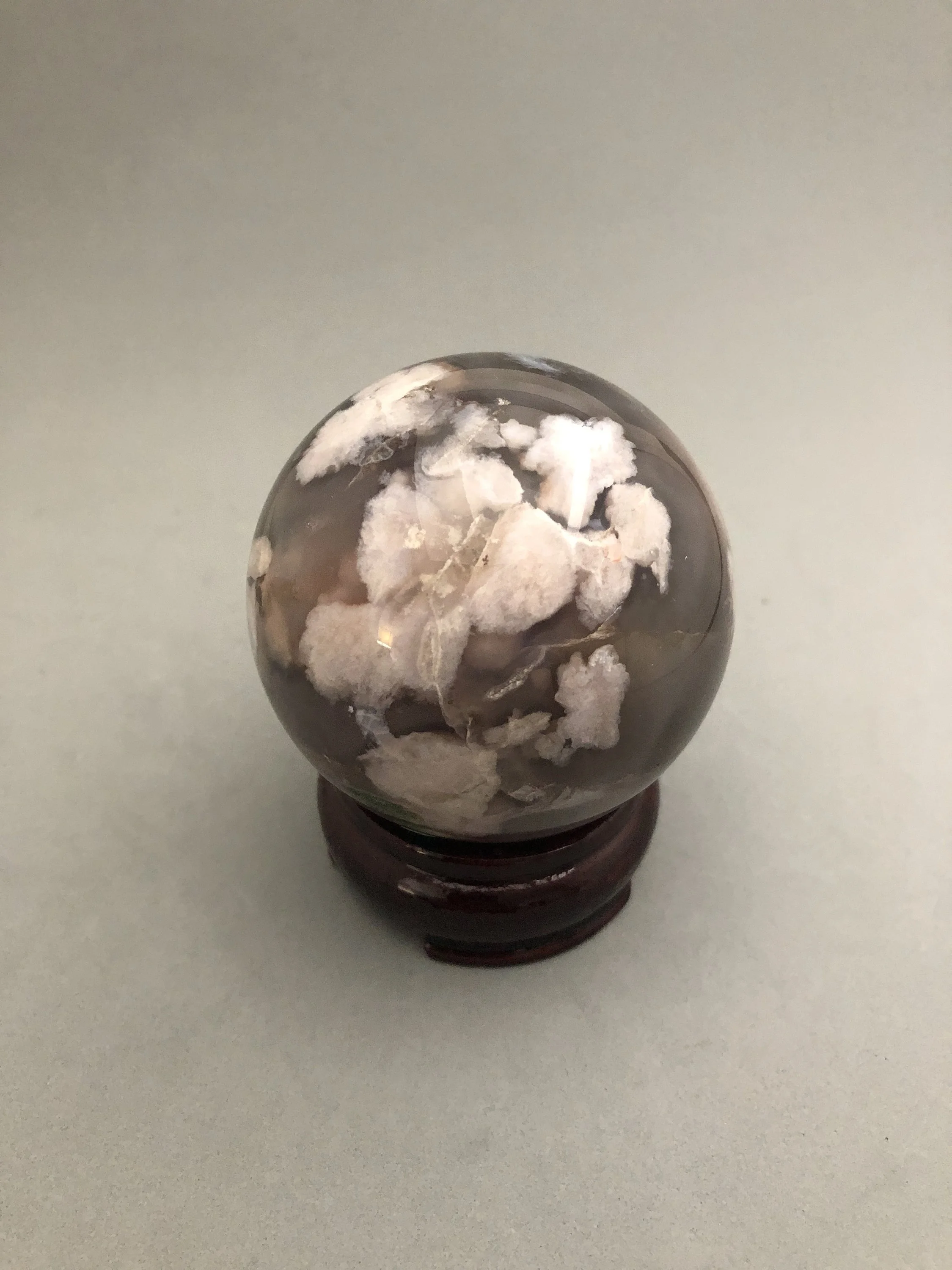 Flower agate is a beautiful variation of chalcedony with plumes, with colors ranging from almost black to beige and variation of pink and orange. This sphere is on the darker side, with an area of banding, a small vug with the tiniest druzy growth and a natural crack that does not compromise the structure of the piece. It weighs about 13.79 ounces and is about 2.5" in diameter. It will come with the wood stand.