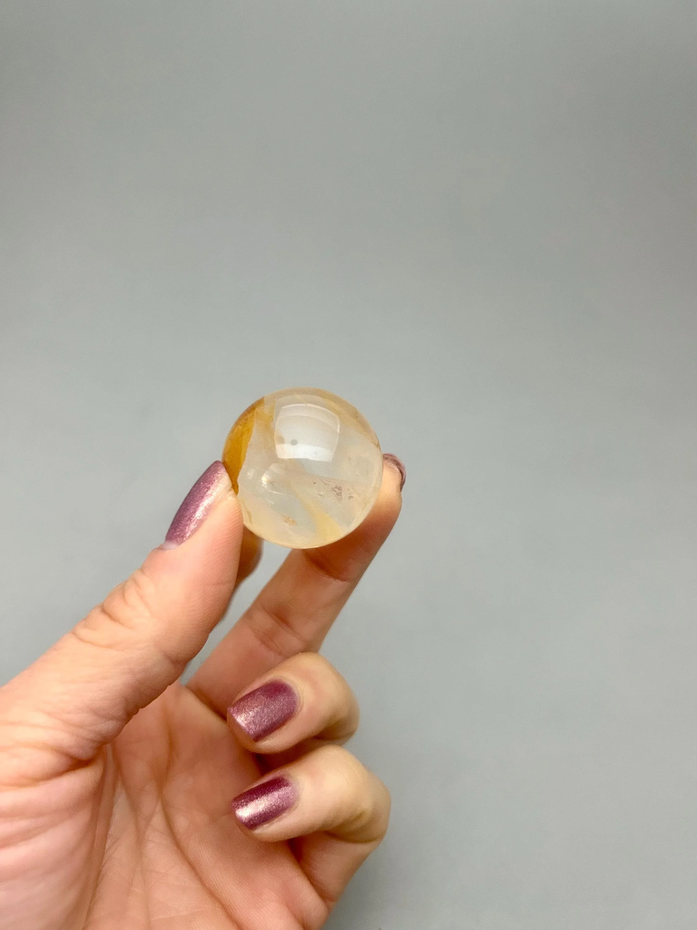 Flower agate is a beautiful variation of chalcedony with plumes, with colors ranging from almost black to beige and variation of pink and orange. The plumes in this fairly new material add more depth & interest and often resemble cherry blossoms or sakura. The coloration on this particular piece is very soft and delicate, with a mix of beige-pink and some darker areas. This sphere is about 3" in diameter and weighs 1 lb and 6 oz. The main photo shows the most "active" area of the sphere with the flowers and what I think looks like an actual tree. There is one area that is "rough" to the touch, and where you can see the bubbly like formation of the rough stone. That area has a ring of flowers around it. This listing is for the exact piece you see in the photos and will come with the wooden stand.