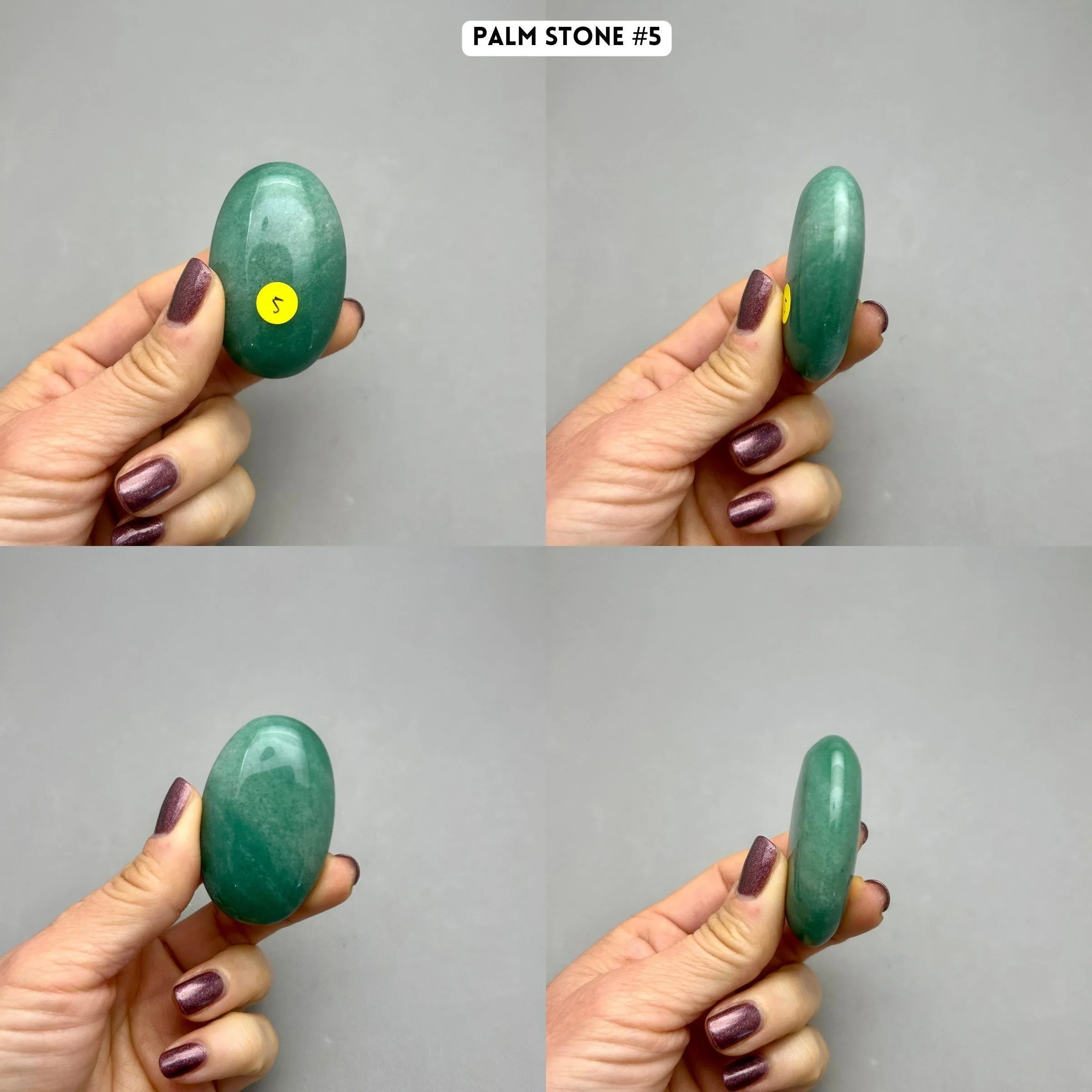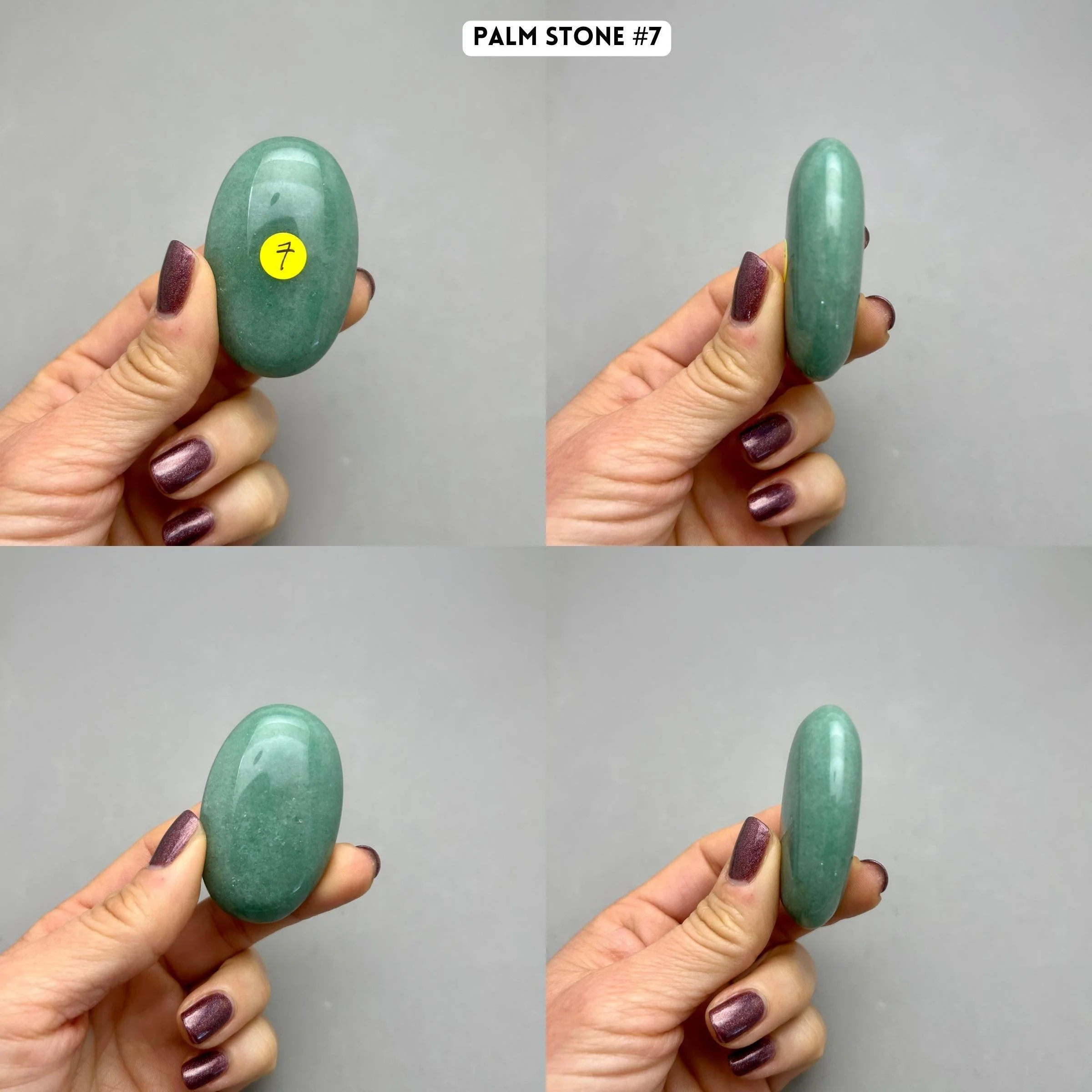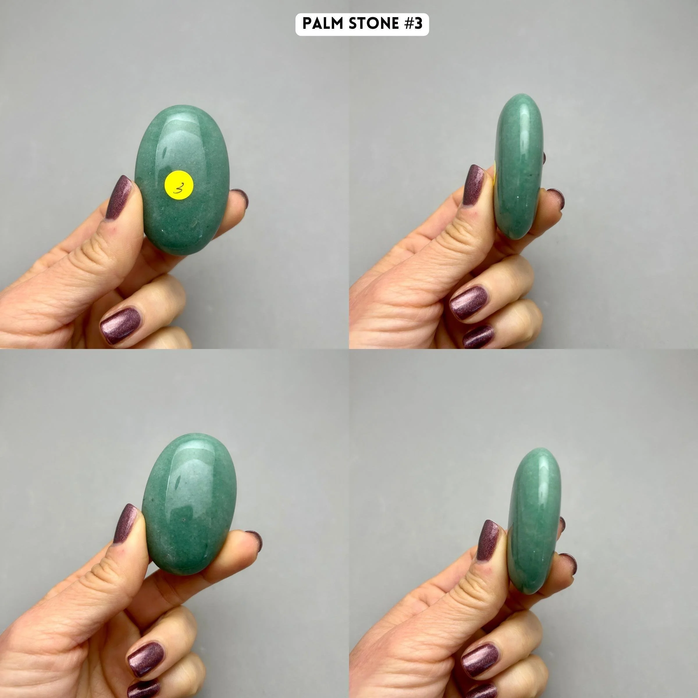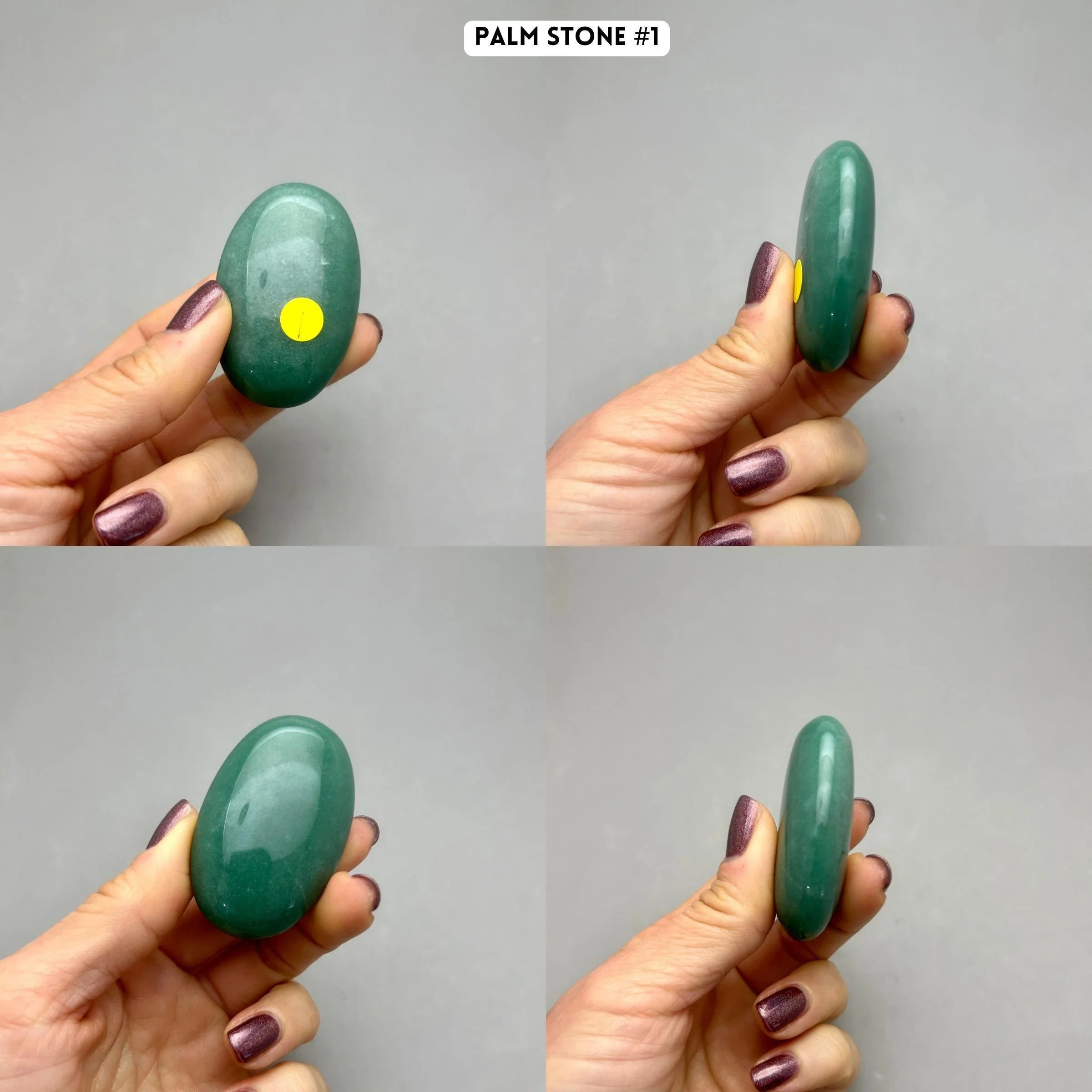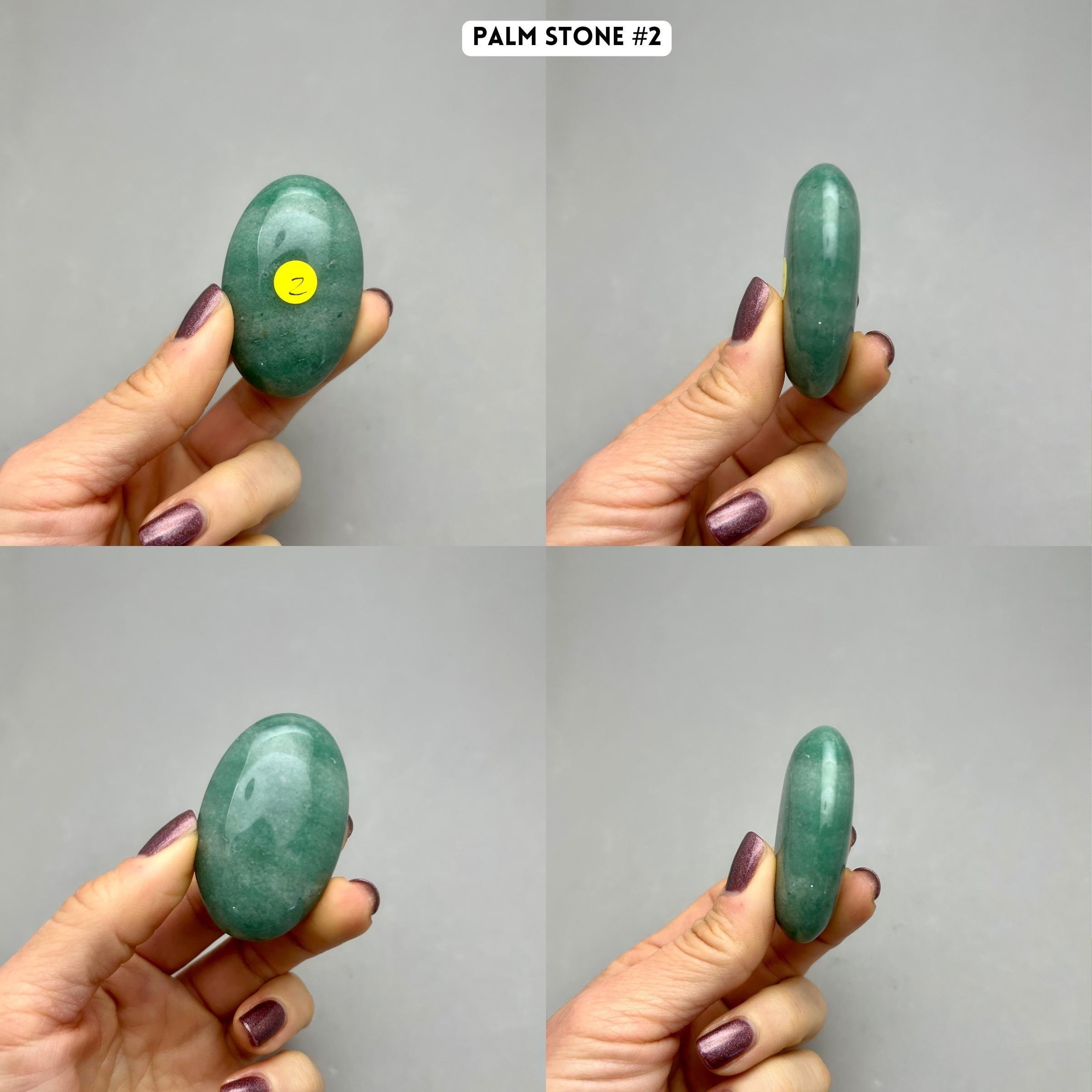 This listing is for one green aventurine palm stone, which you'll choose upon checkout. They all measure roughly 2 3/16" x 1 3/8" x 11/16" and have beautiful color saturation. Here are the individual weights of each palm stone: