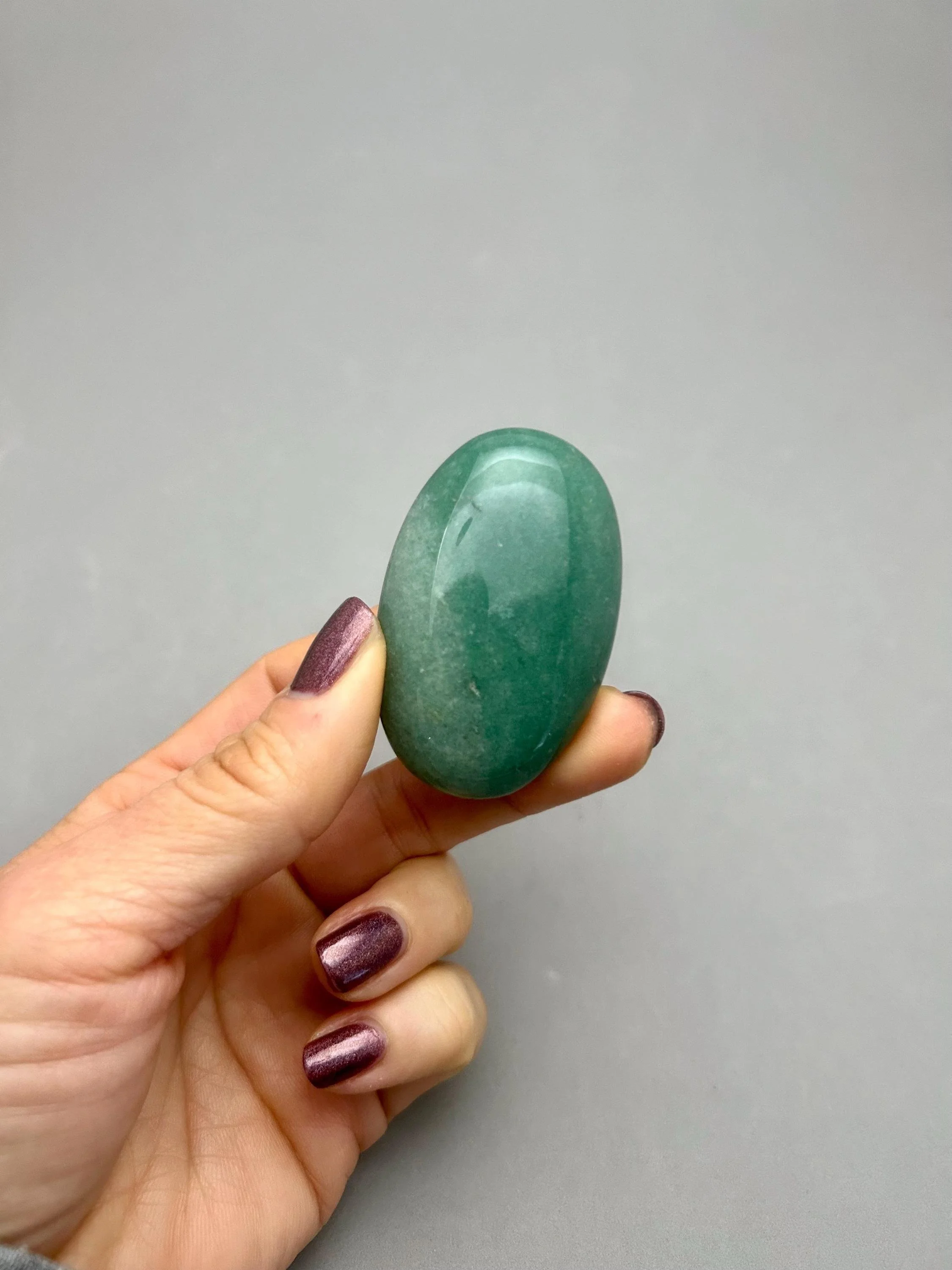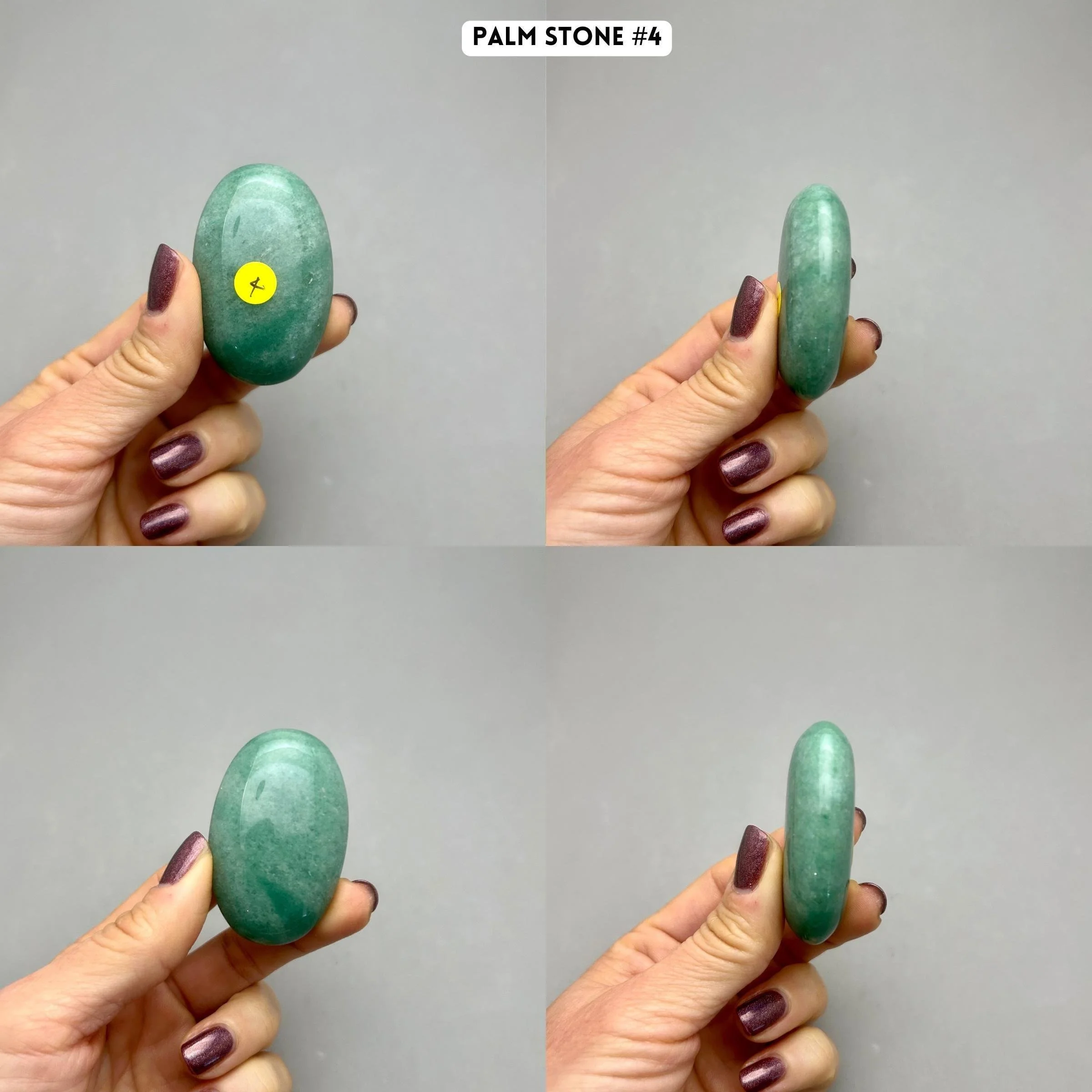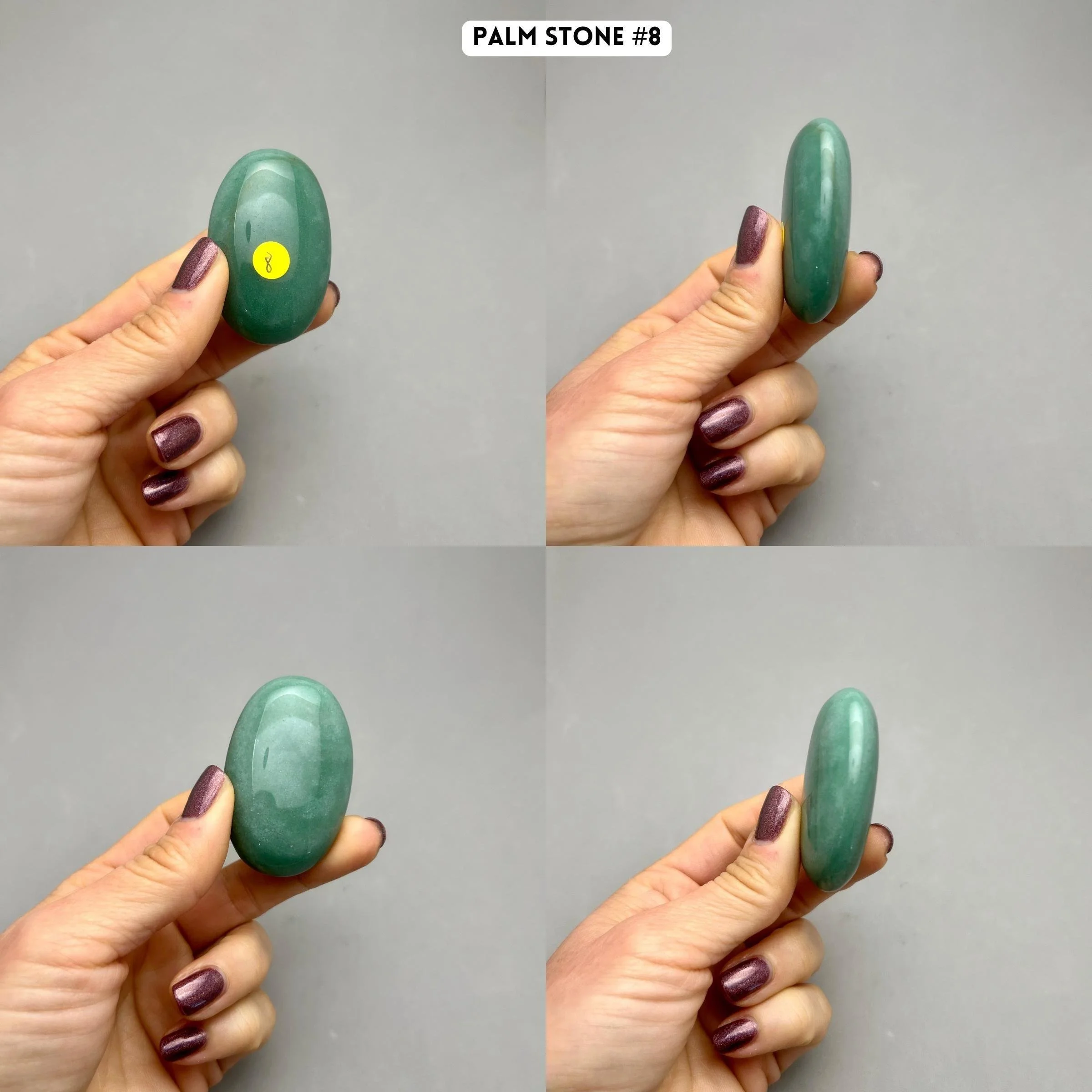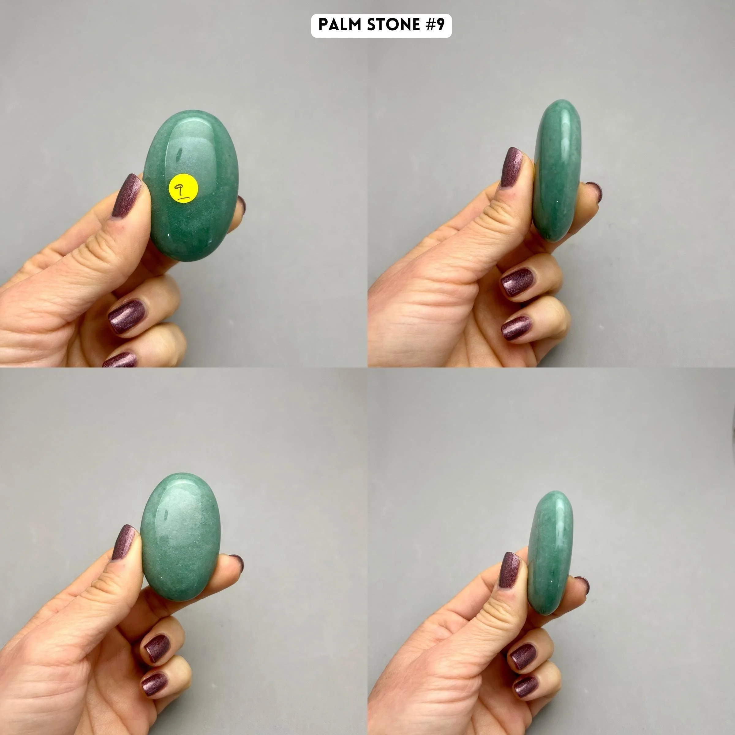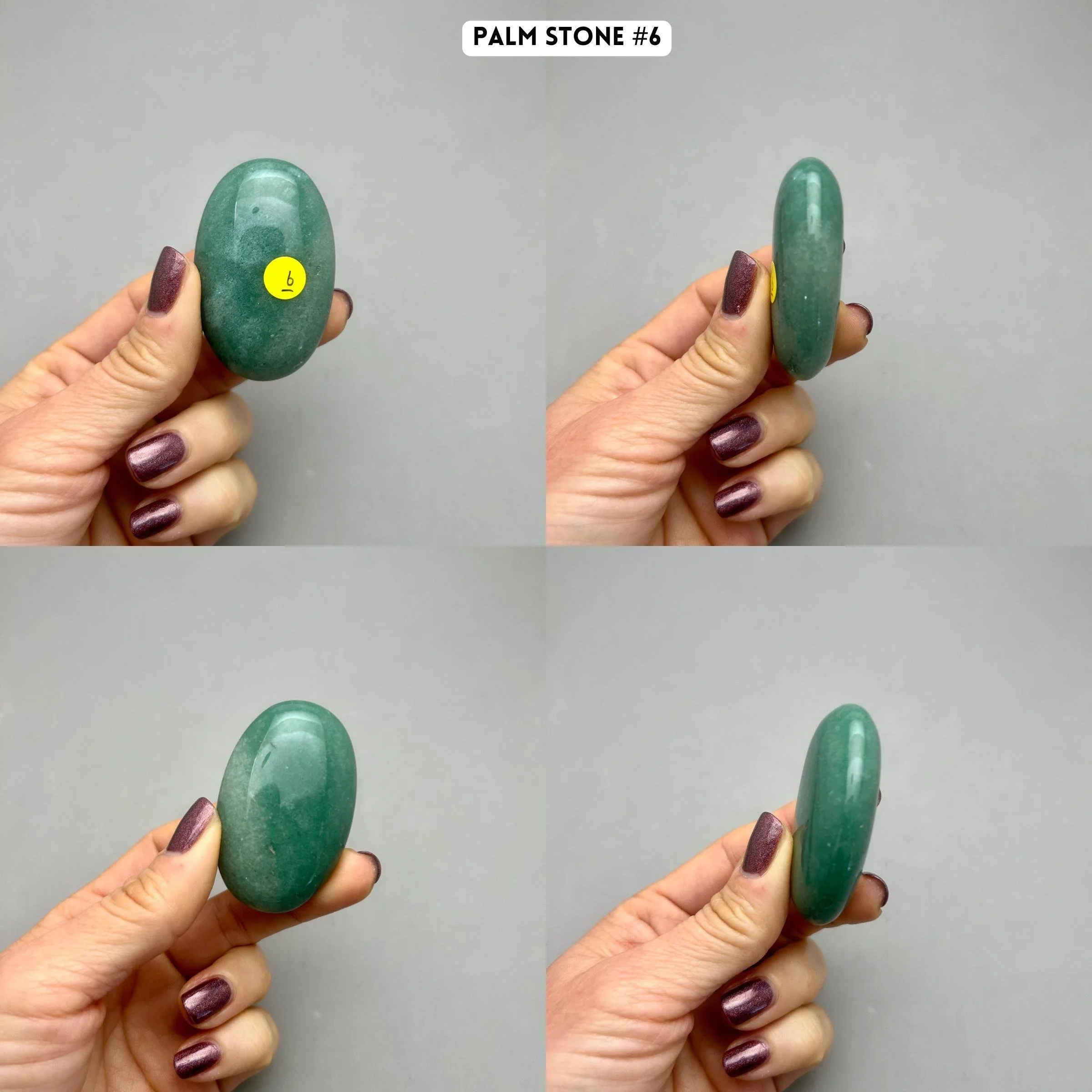 This listing is for one green aventurine palm stone, which you'll choose upon checkout. They all measure roughly 2 3/16" x 1 3/8" x 11/16" and have beautiful color saturation. Here are the individual weights of each palm stone:
