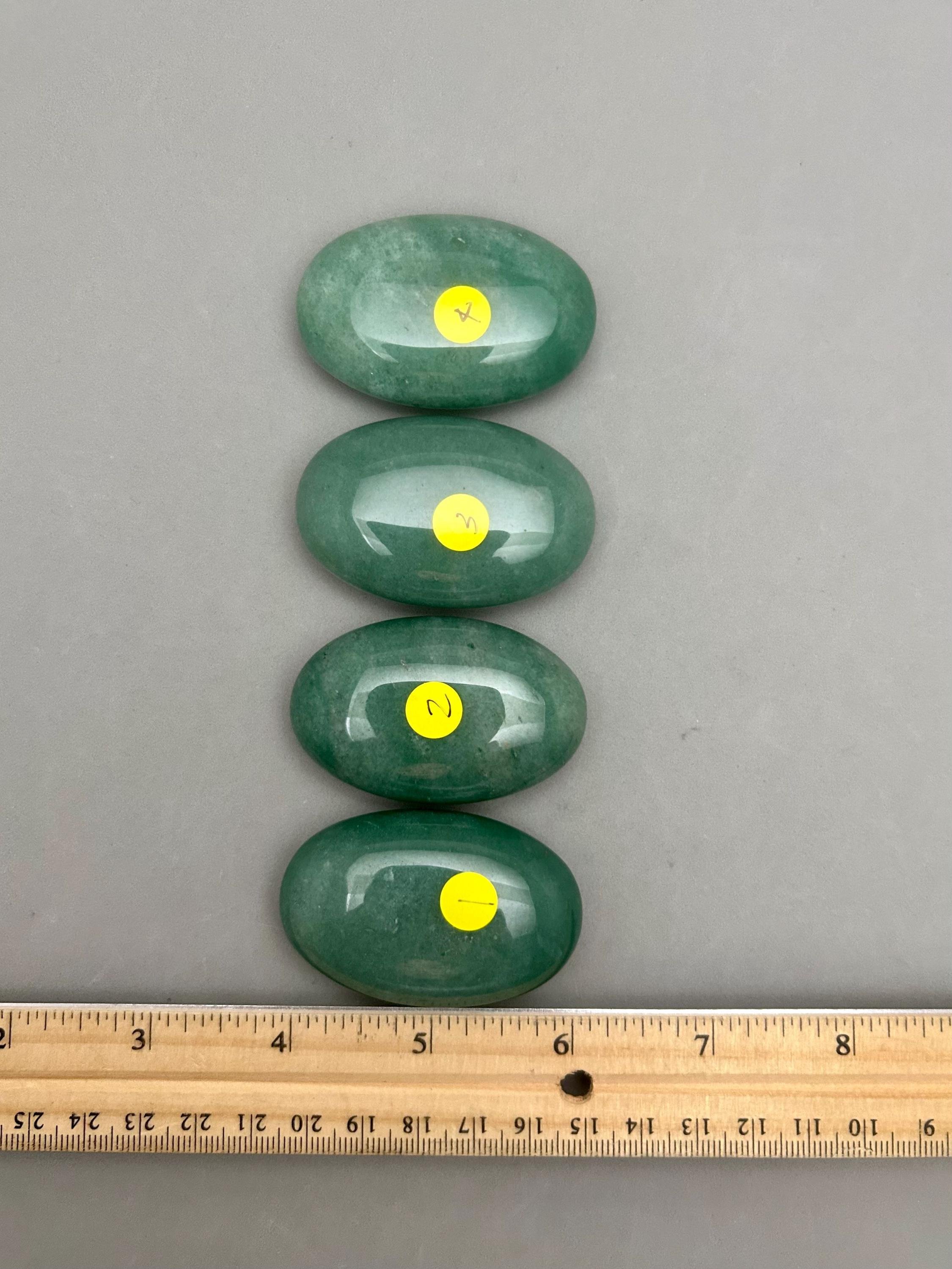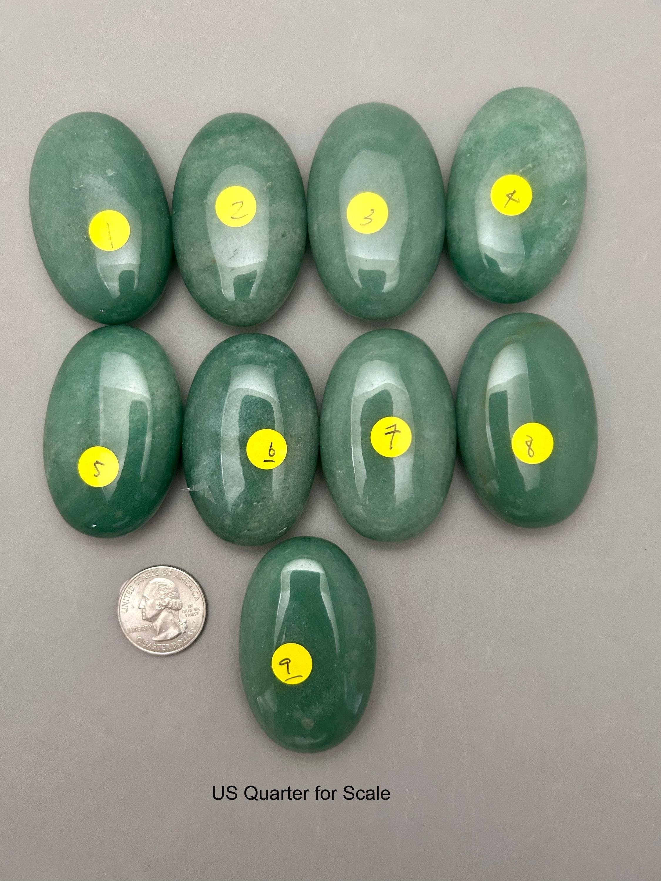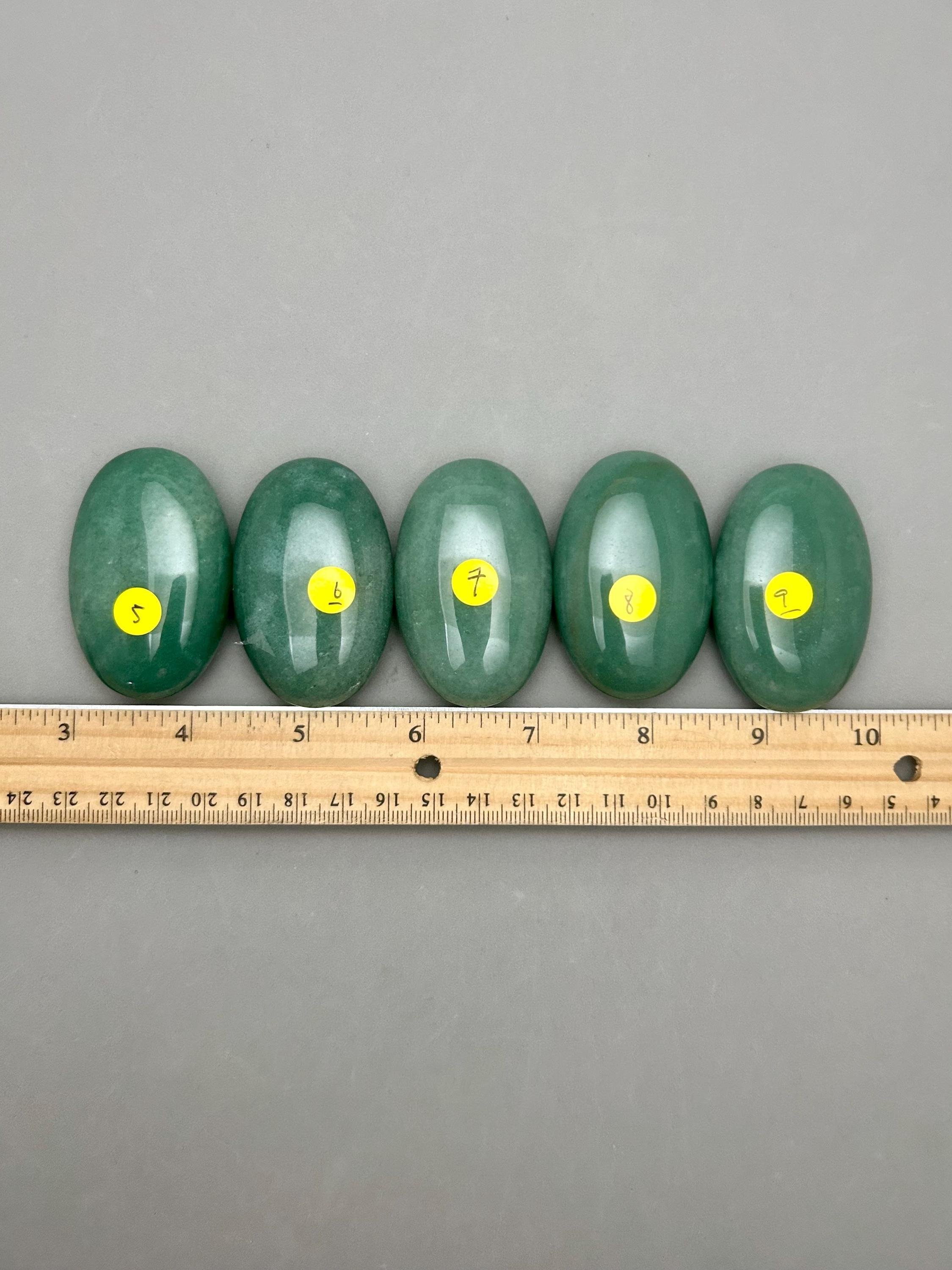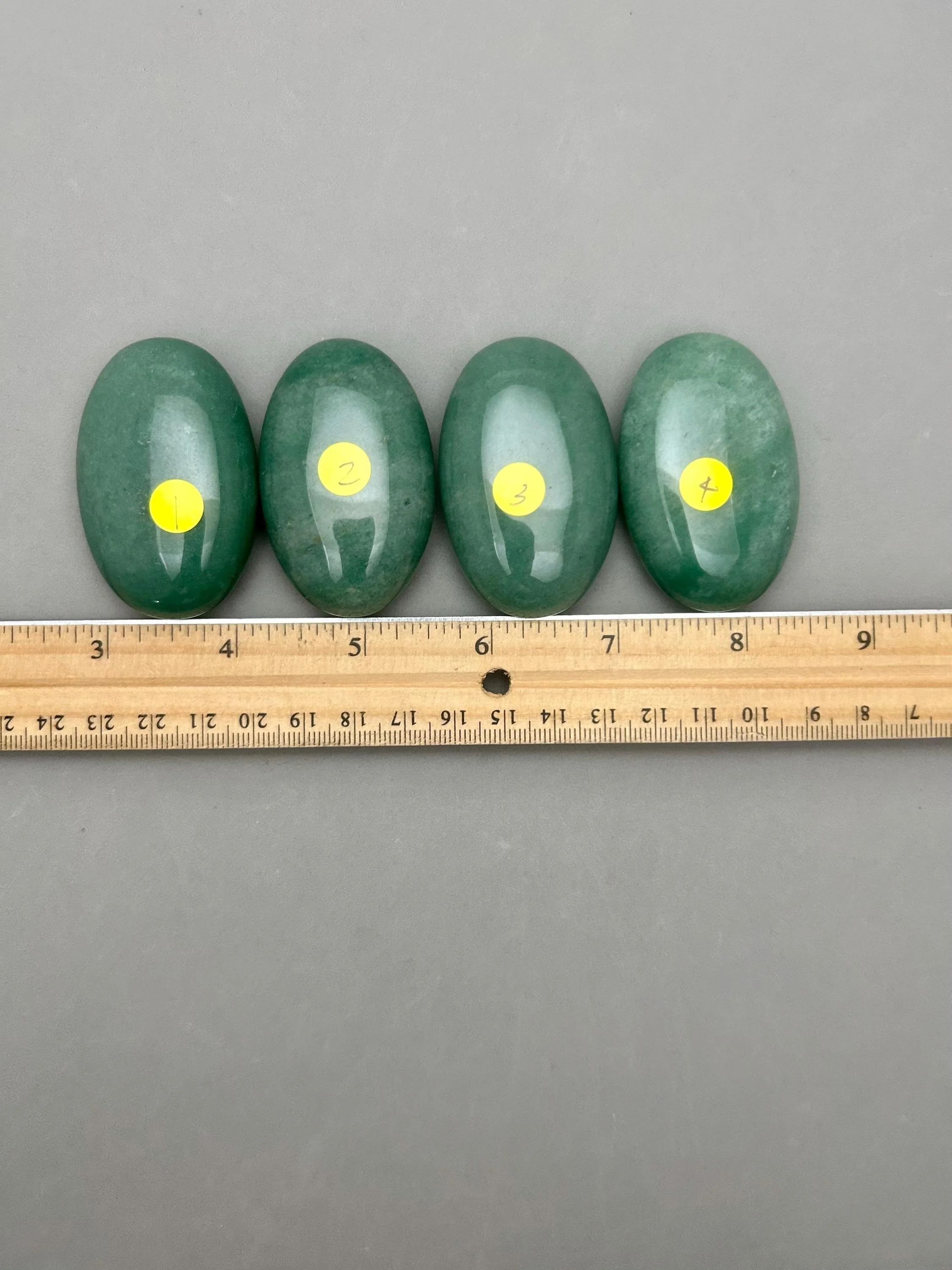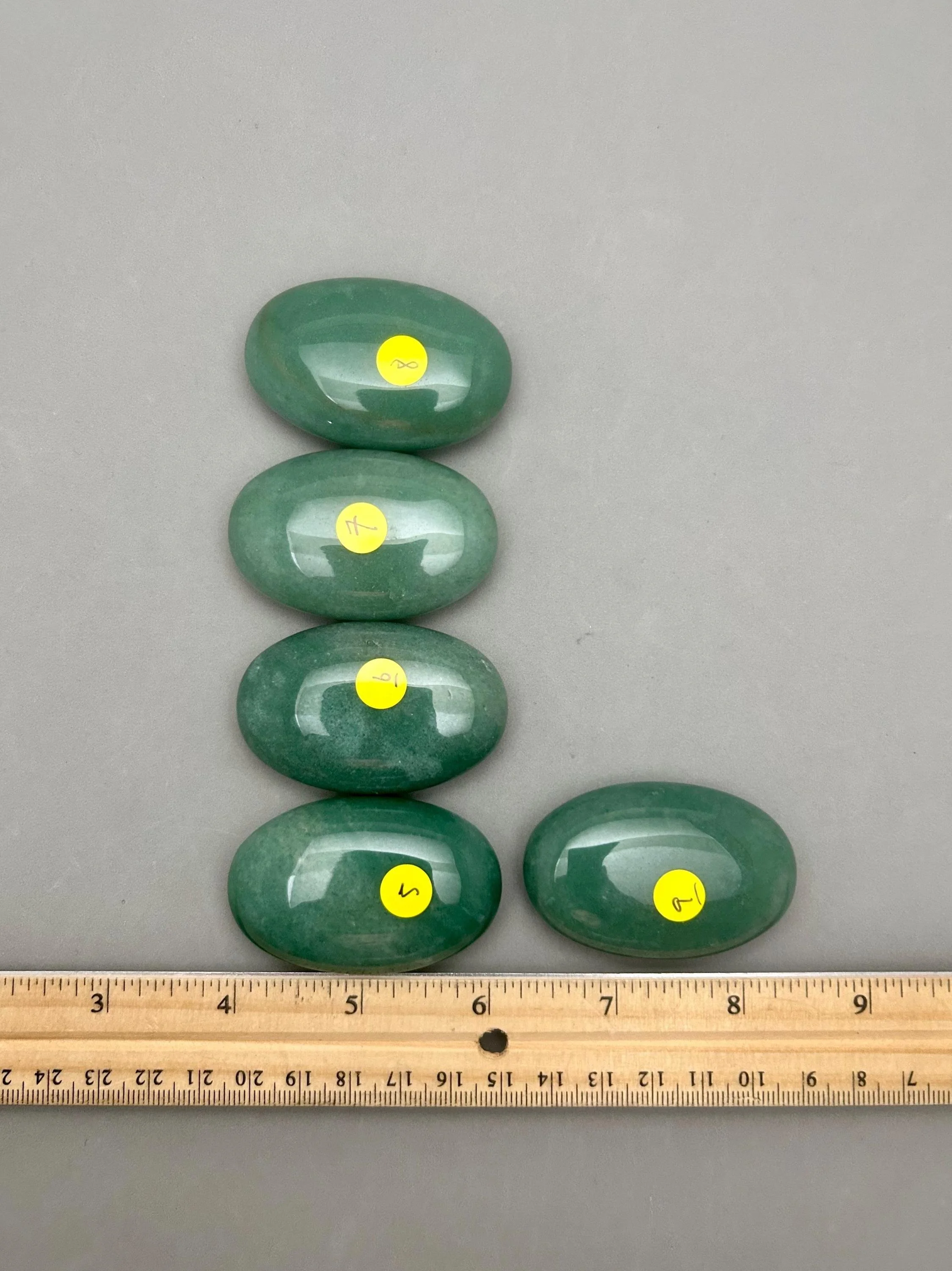 This listing is for one green aventurine palm stone, which you'll choose upon checkout. They all measure roughly 2 3/16" x 1 3/8" x 11/16" and have beautiful color saturation. Here are the individual weights of each palm stone: