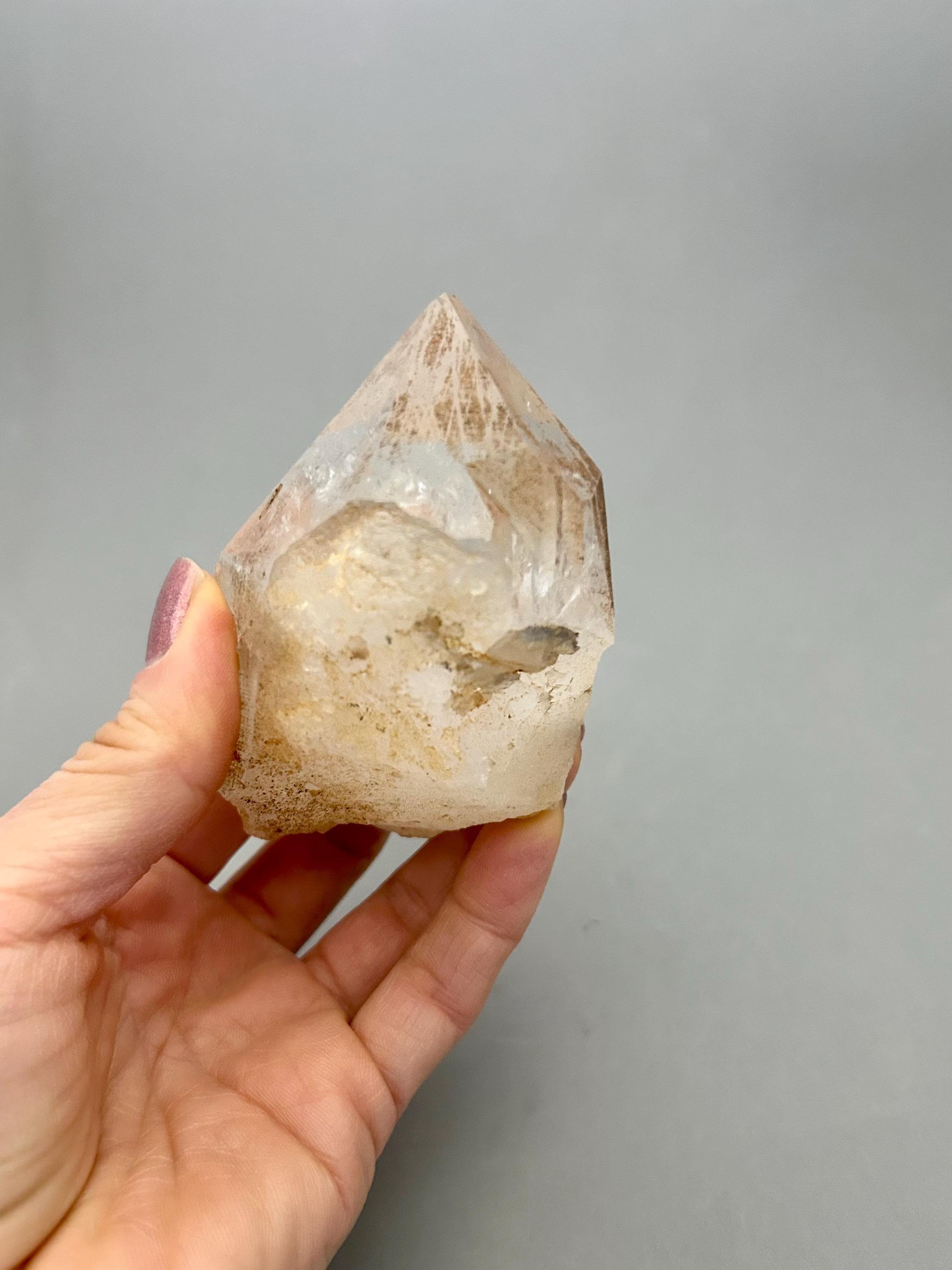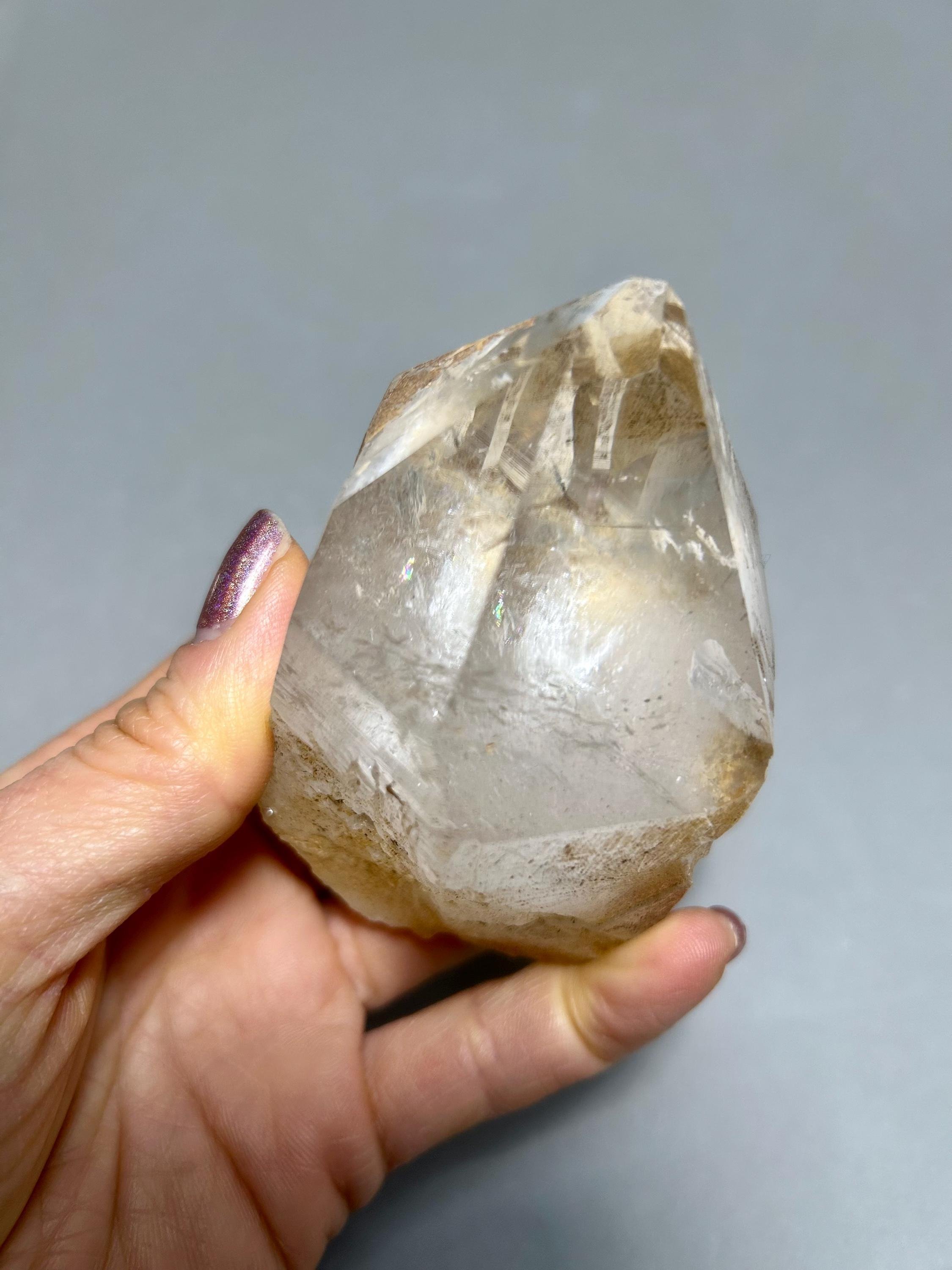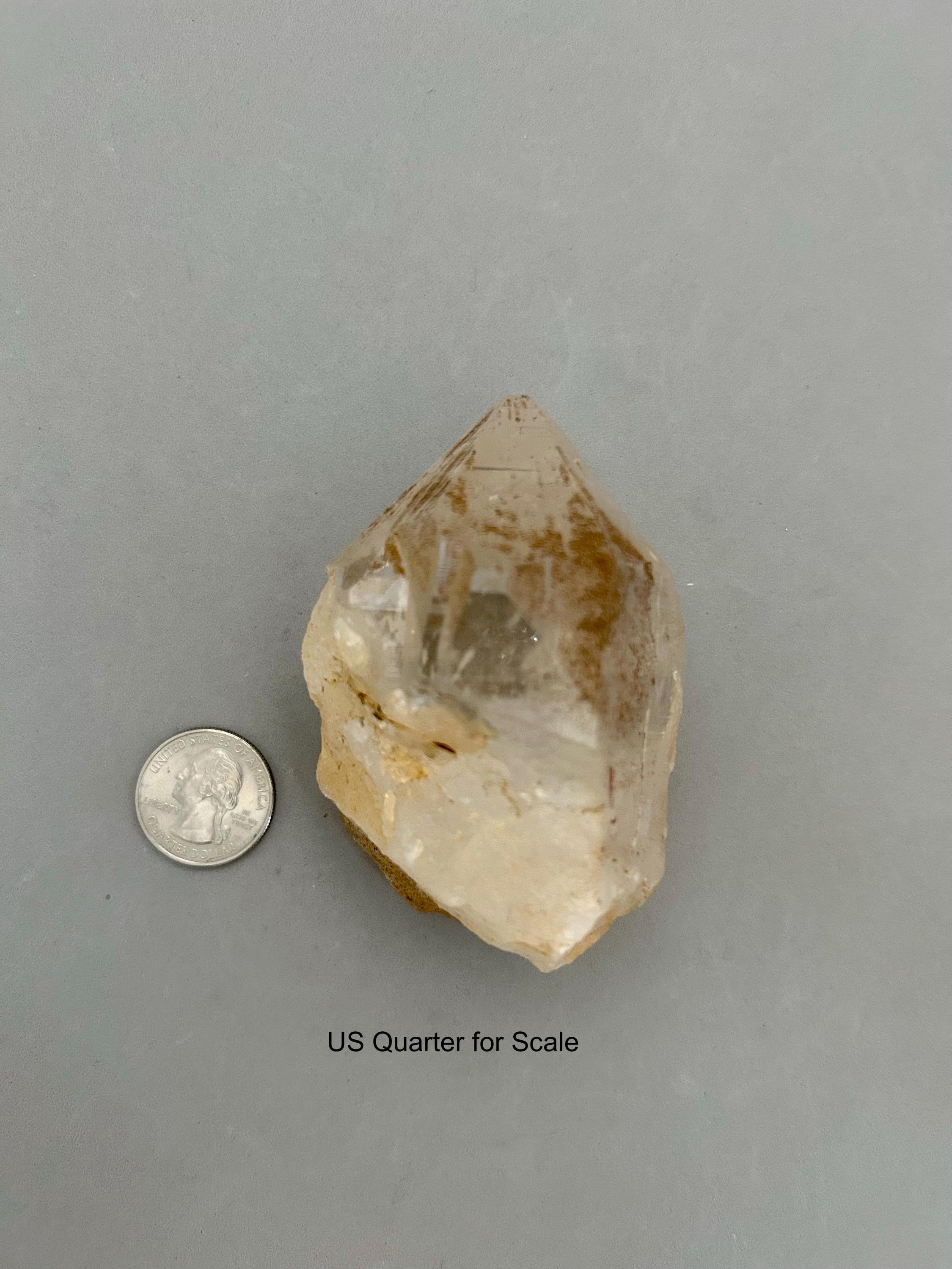 While citrine is one of the most popular stones every year, most of it is heat treated. Kundalini citrine is one of the few examples of naturally occurring citrine, so this is considered quite rare in some circles. This listing is for one kundalini citrine piece, which measures approximately 1 7/8" x 1 3/8" x 1 1/4" and the approximate weight is 2.06 ounces. You will receive the exact piece shown in the photos and video. It is basically one big point with a smaller barnacle on one side. This piece does have one prominent rainbow and please note the tip with some slight damage, which is common in rough specimens. As with many rough specimens this also has some "dirt" looking material on it, which is probably some type of iron deposit.