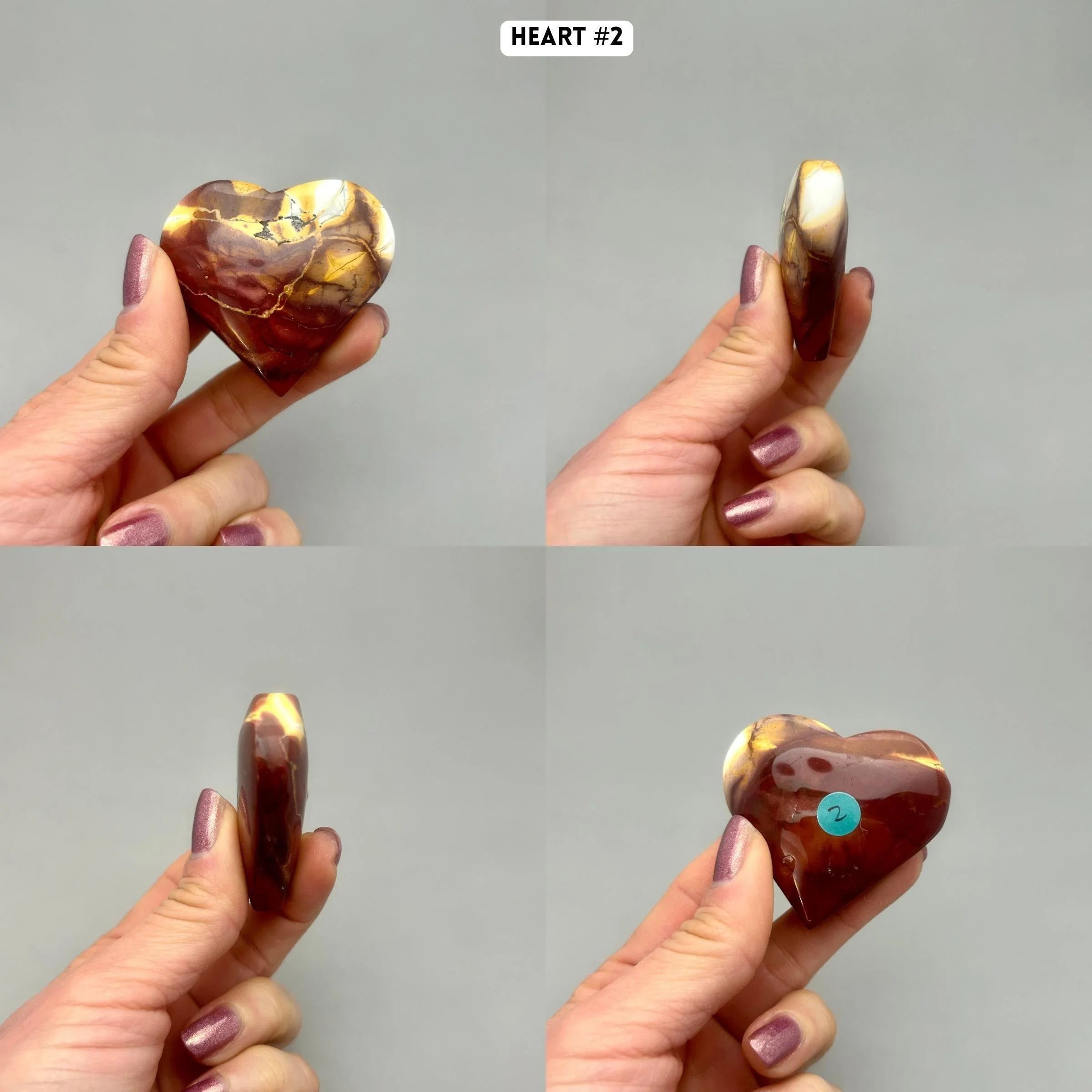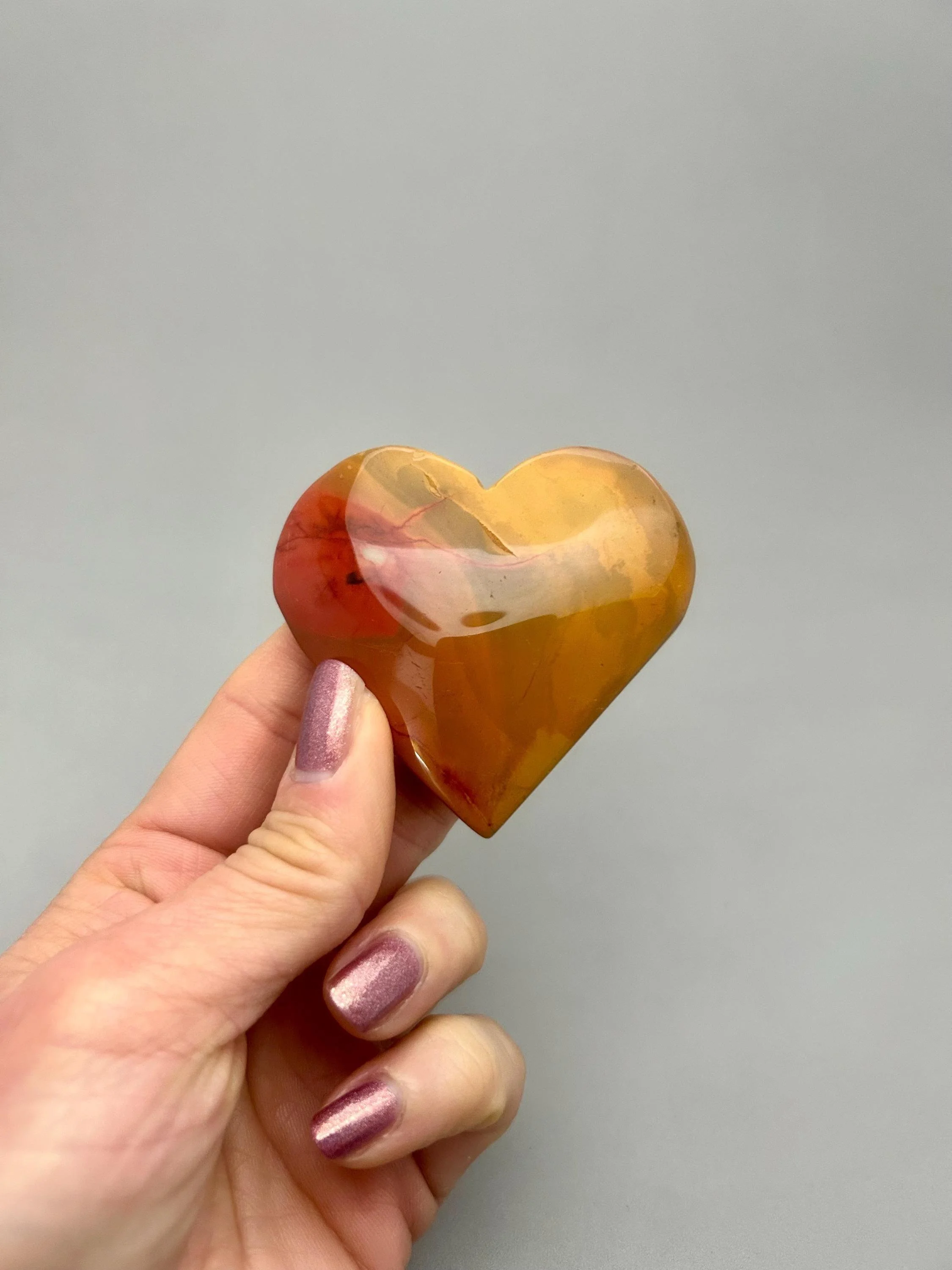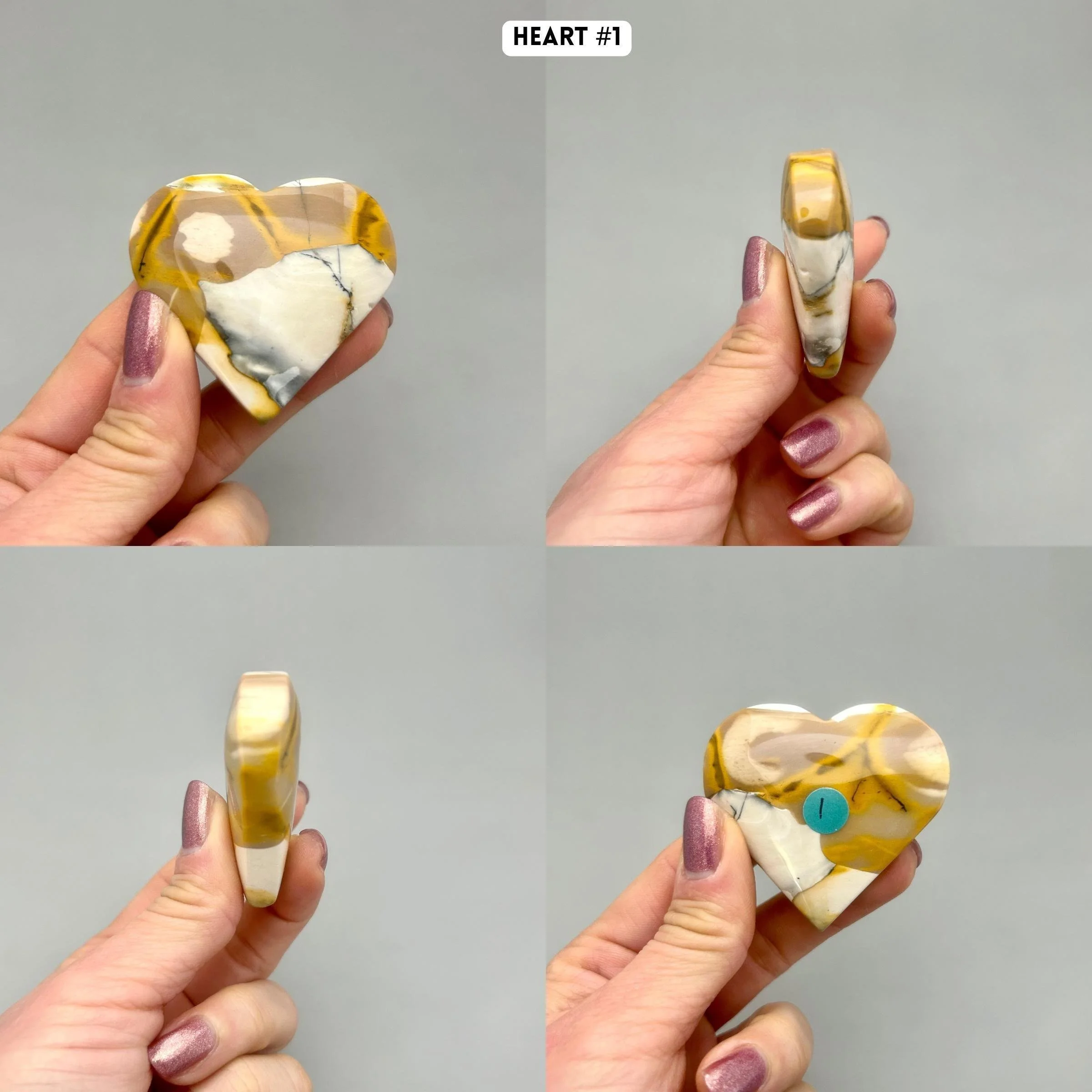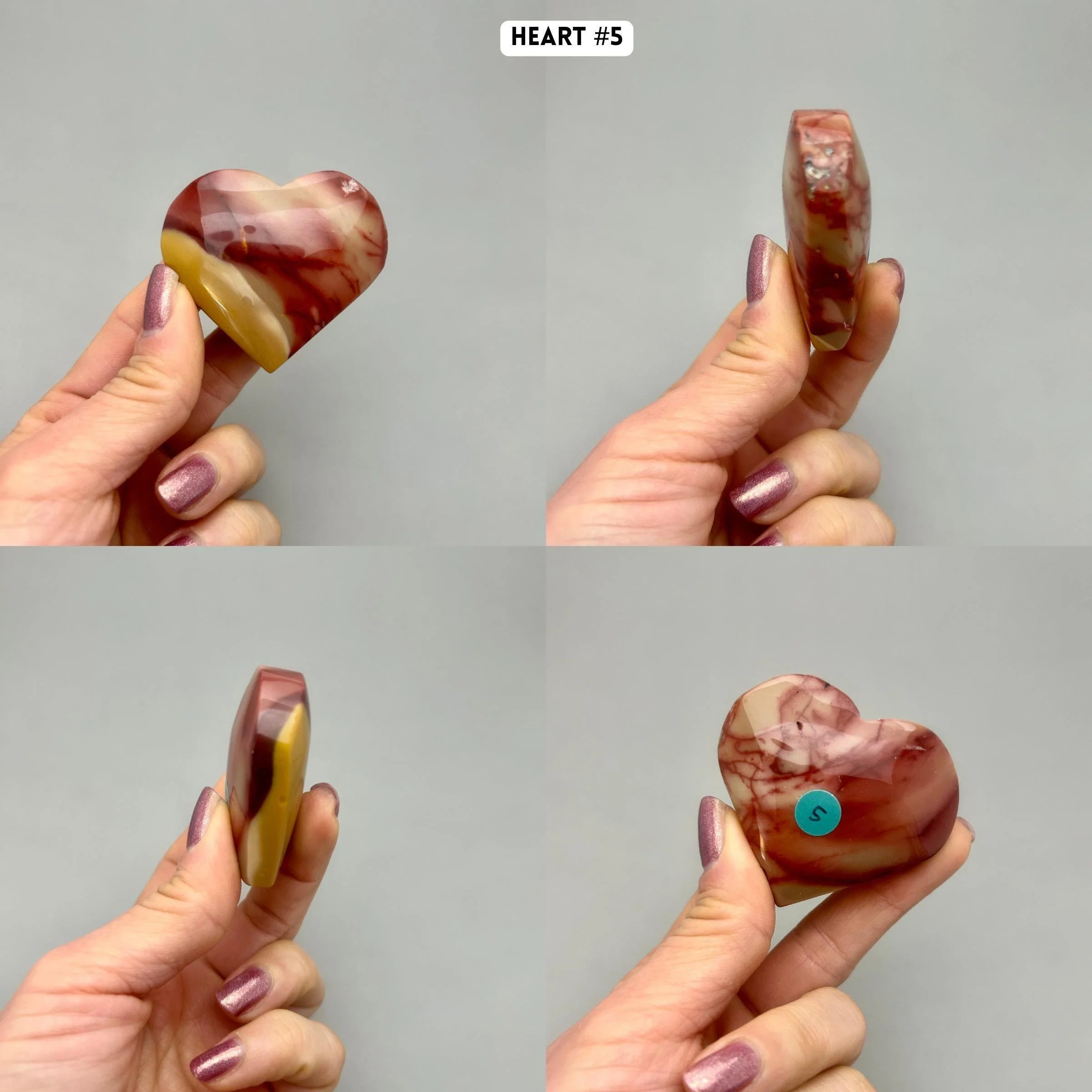 Mookaite is a type of jasper found in gorgeous mustard yellow, burgundy, cream and tan colorations. Often there is a mixing of these colors within one piece. This listing is for one mookaite heart. You'll choose your heart upon checkout. Here are more details for each piece: