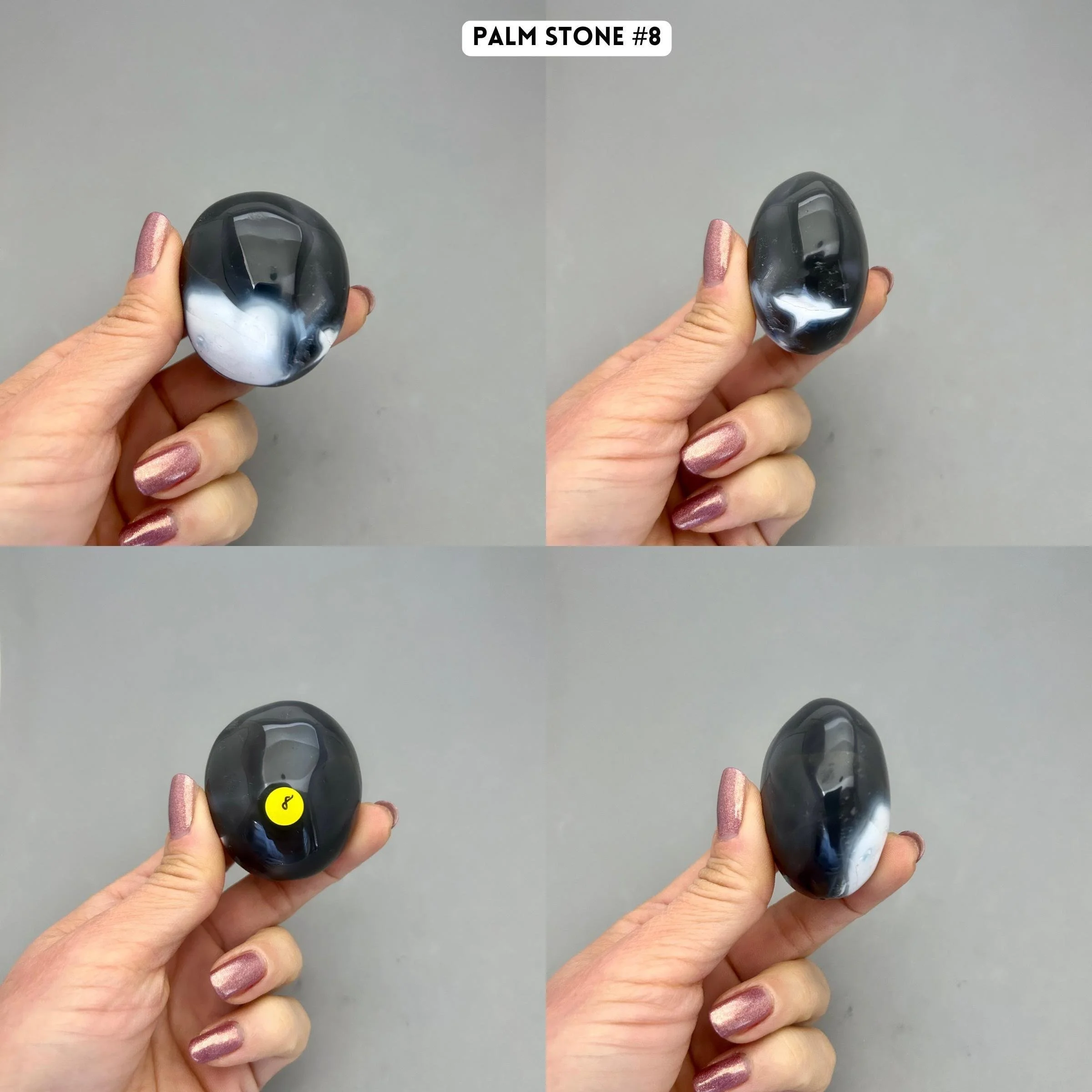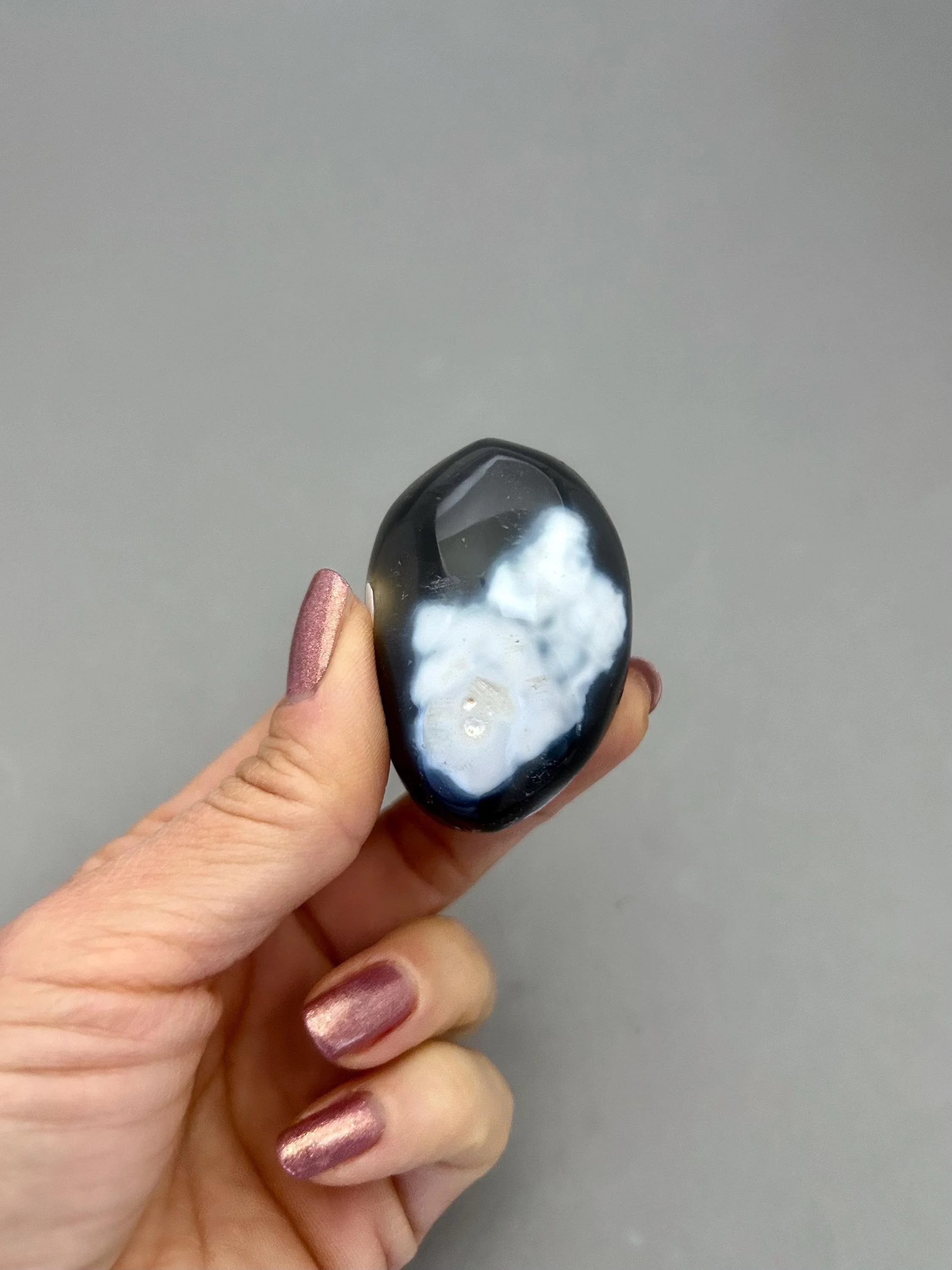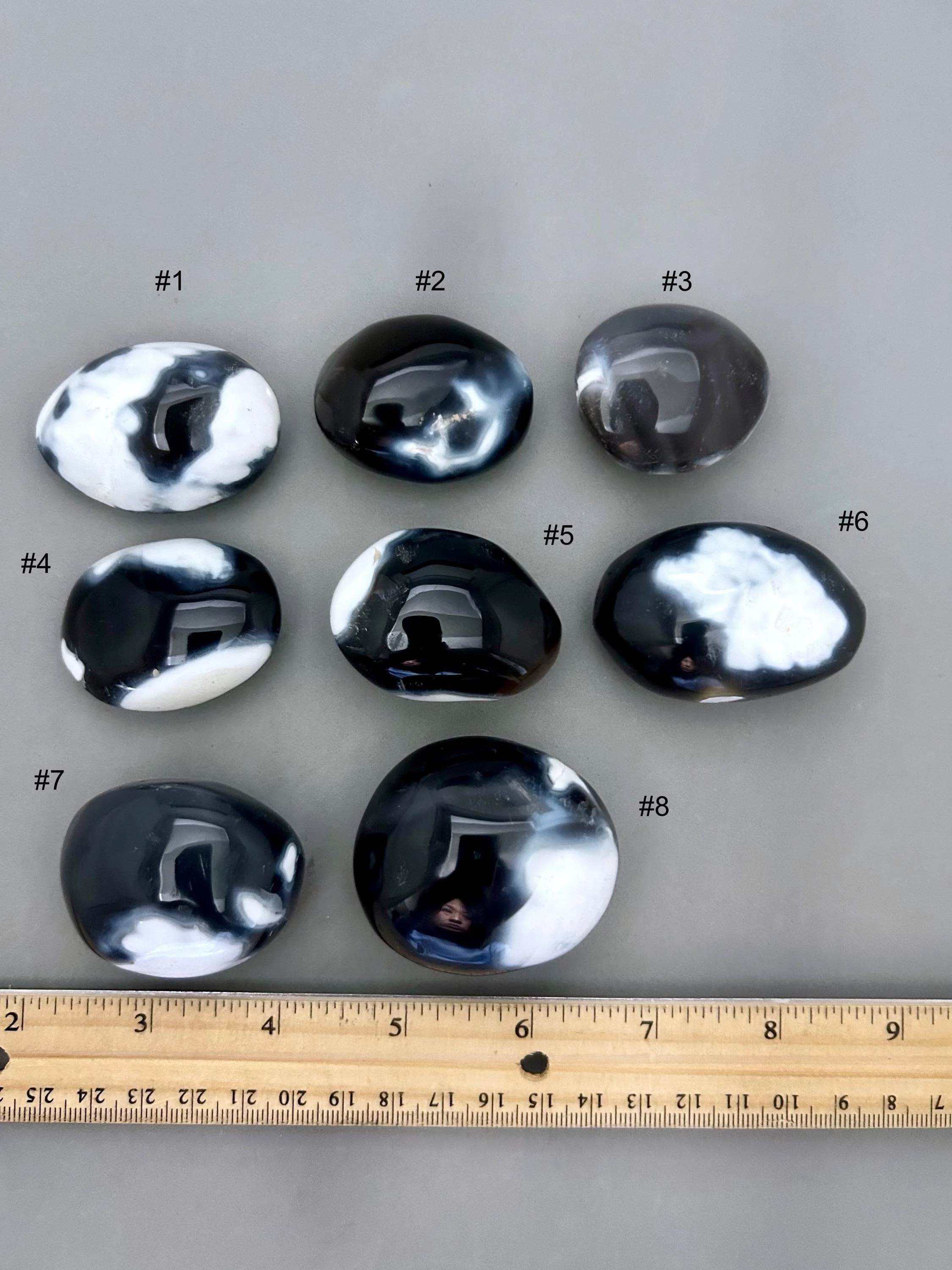 Agate comes in many wonderful forms, and colorations, but one of my favorite is orca agate, with it's glossy black and white fields of color. This listing is for one palm stone, which you'll choose upon checkout. Here are more details for each piece: