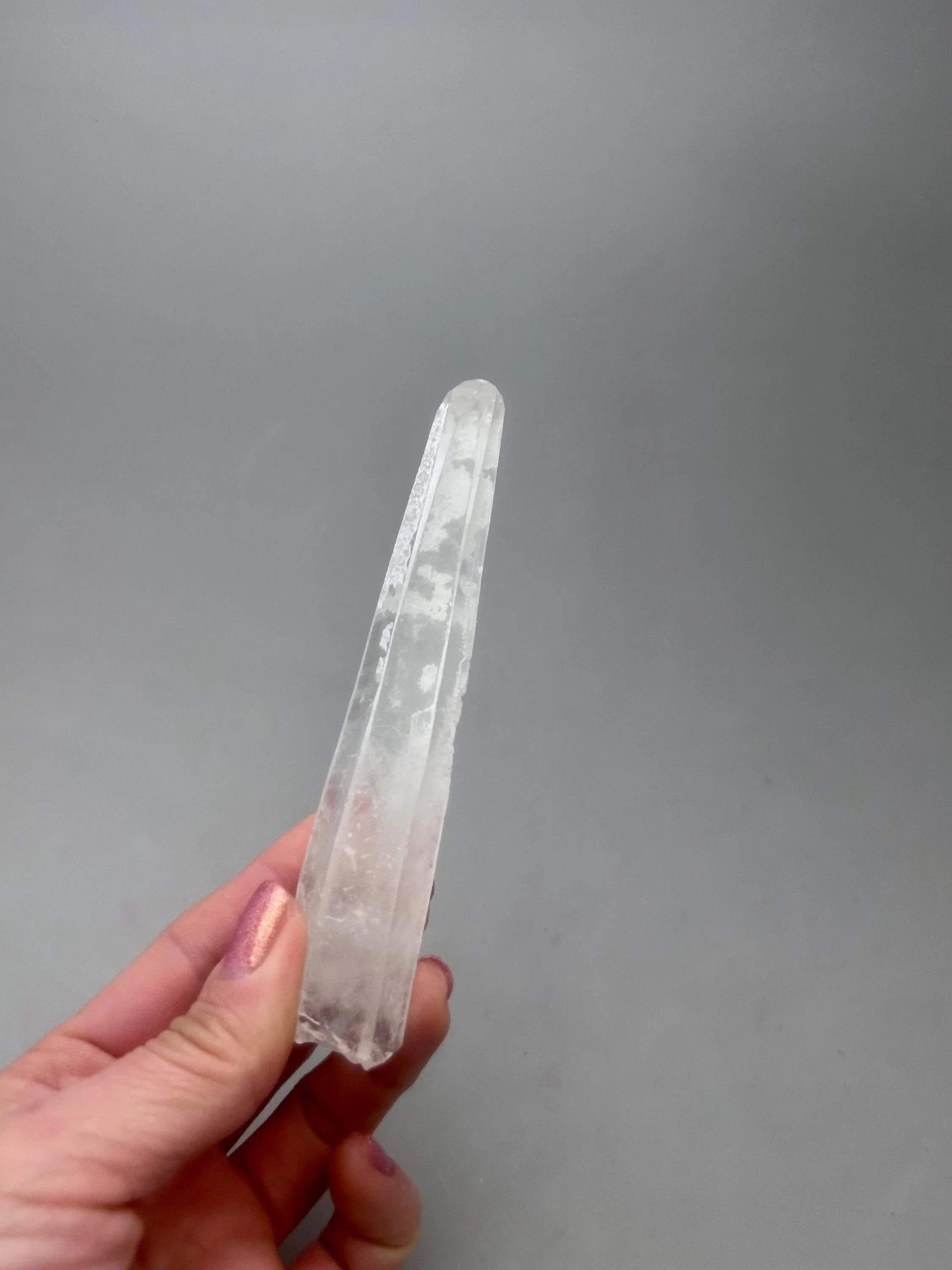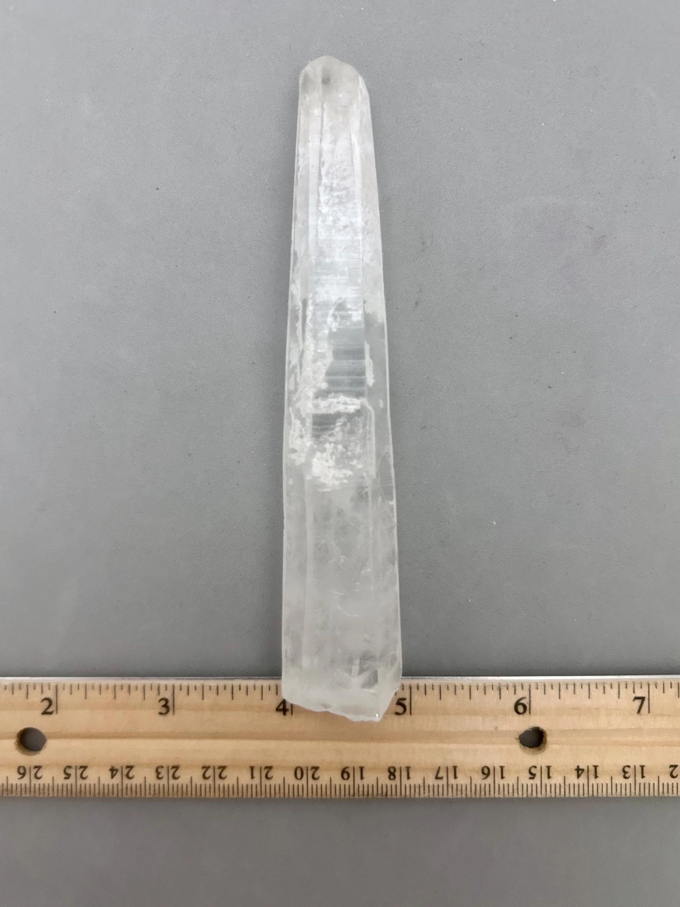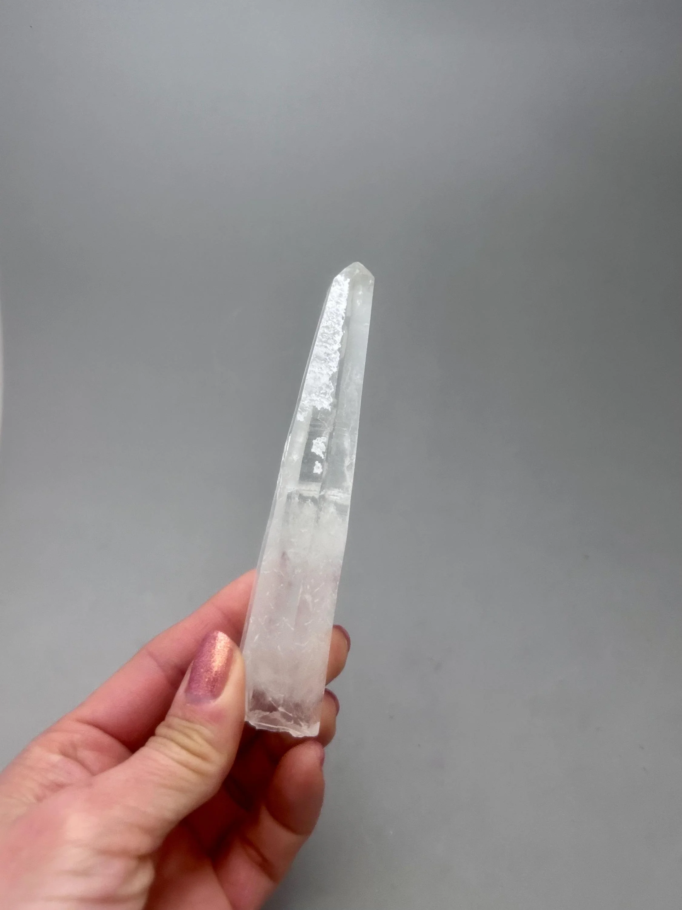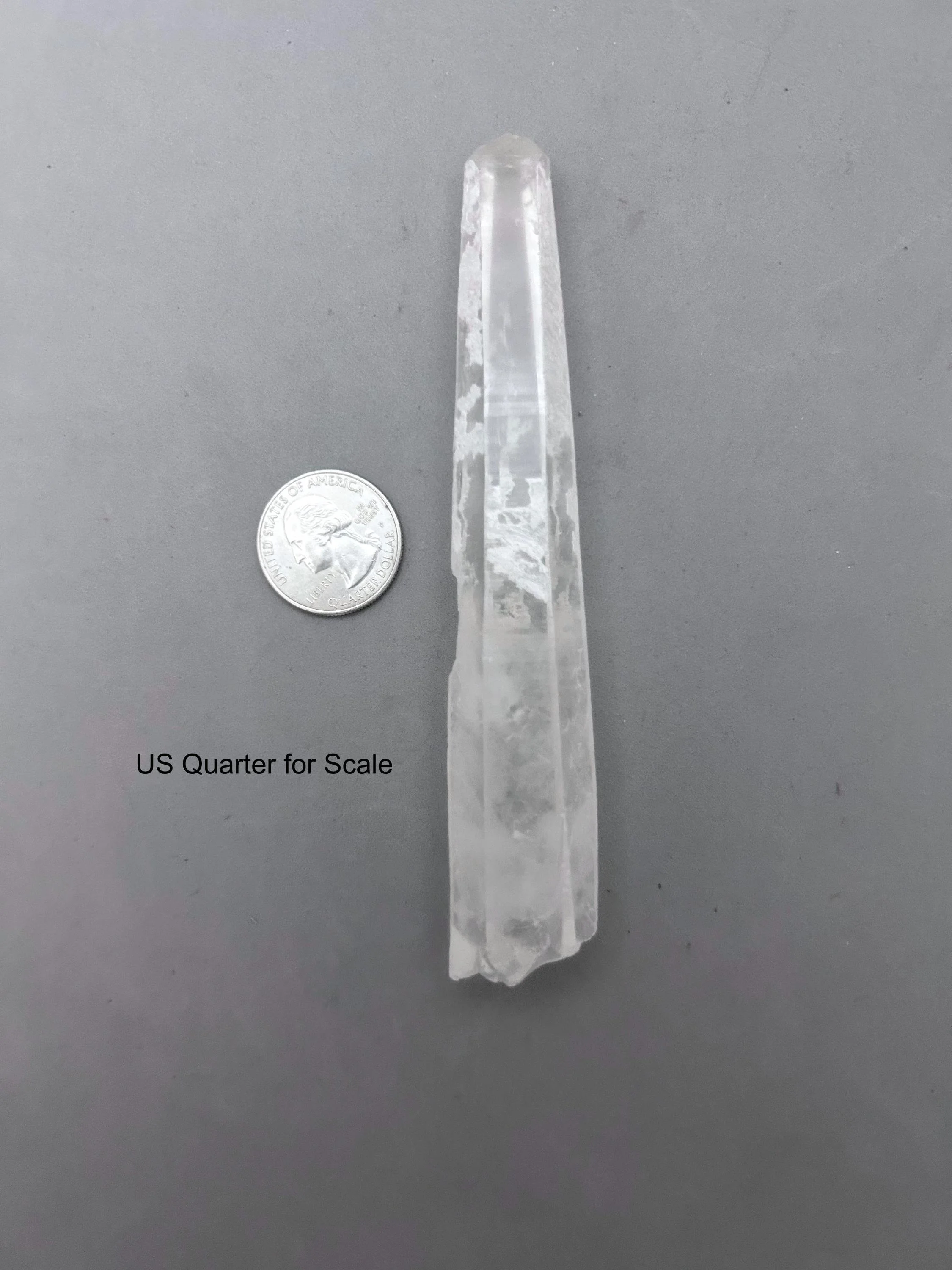 You will receive the exact piece as shown in the photos of this listing. The rough quartz point measures about 5 3/16" x 3/4" x 7/8" and weighs about 3.12 ounces. One one side of the piece is an area where another crystal could have been growing and was removed in the mining process, most likely. Many people love these little features especially to rub or place their thumb in this area.