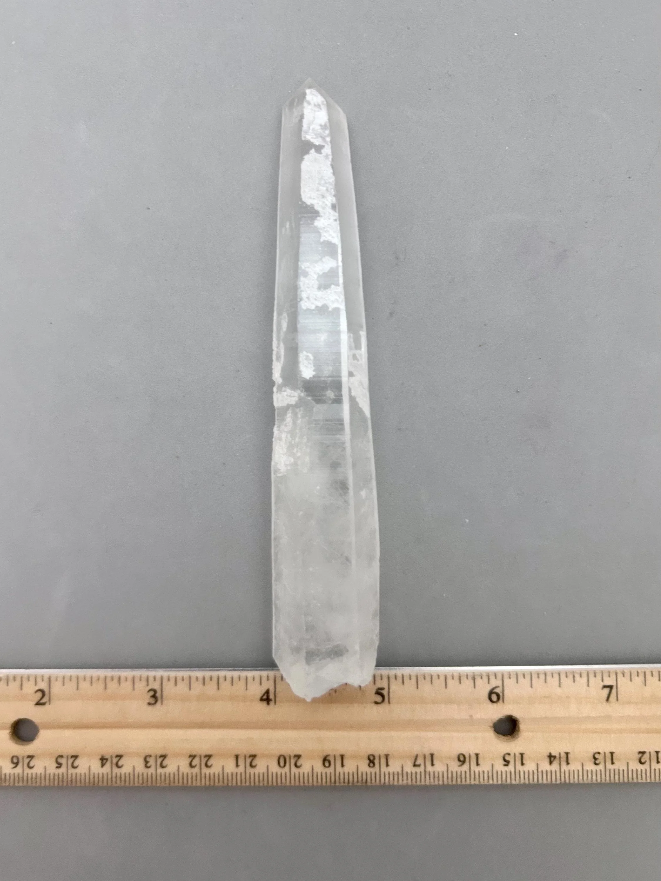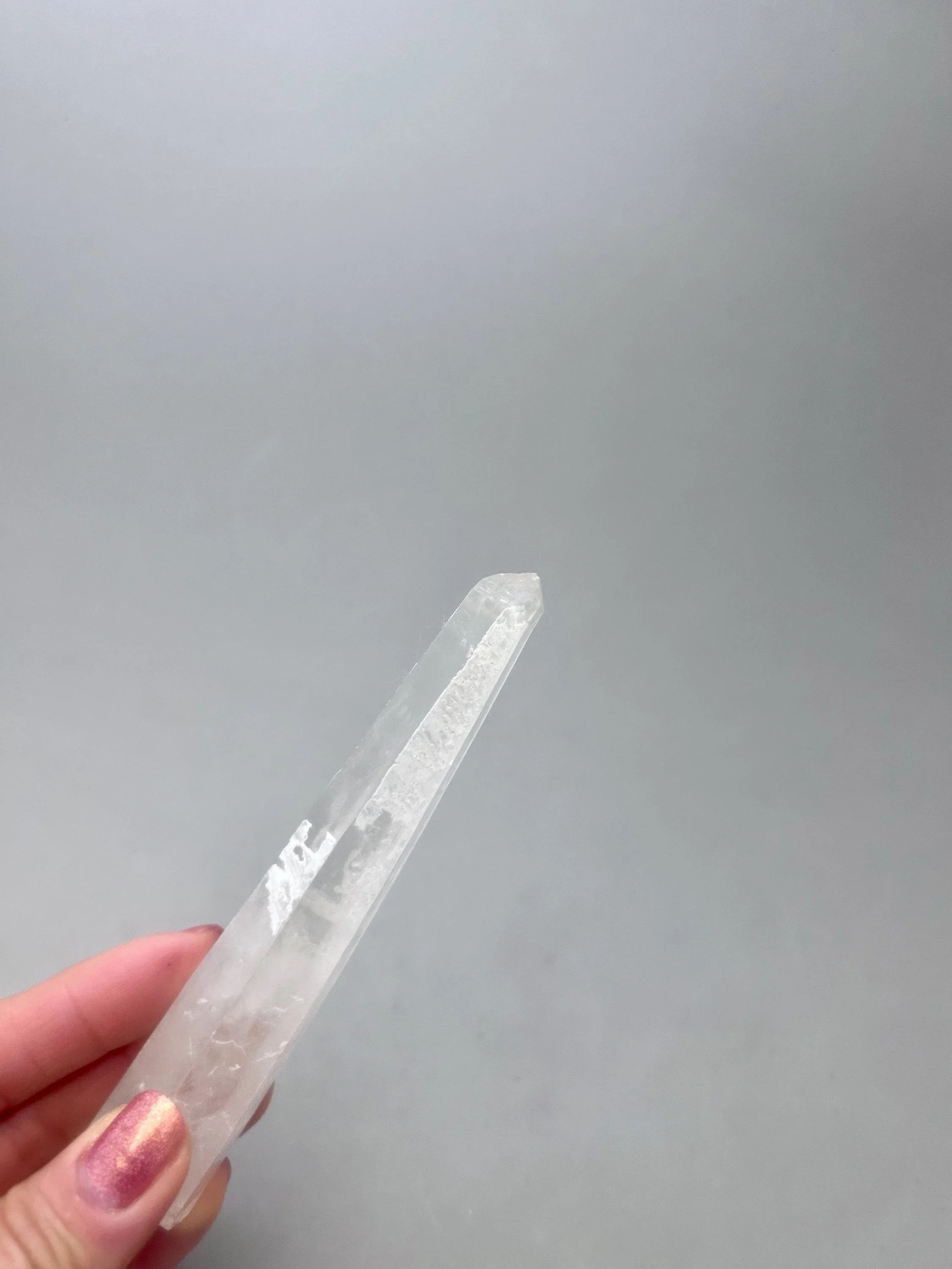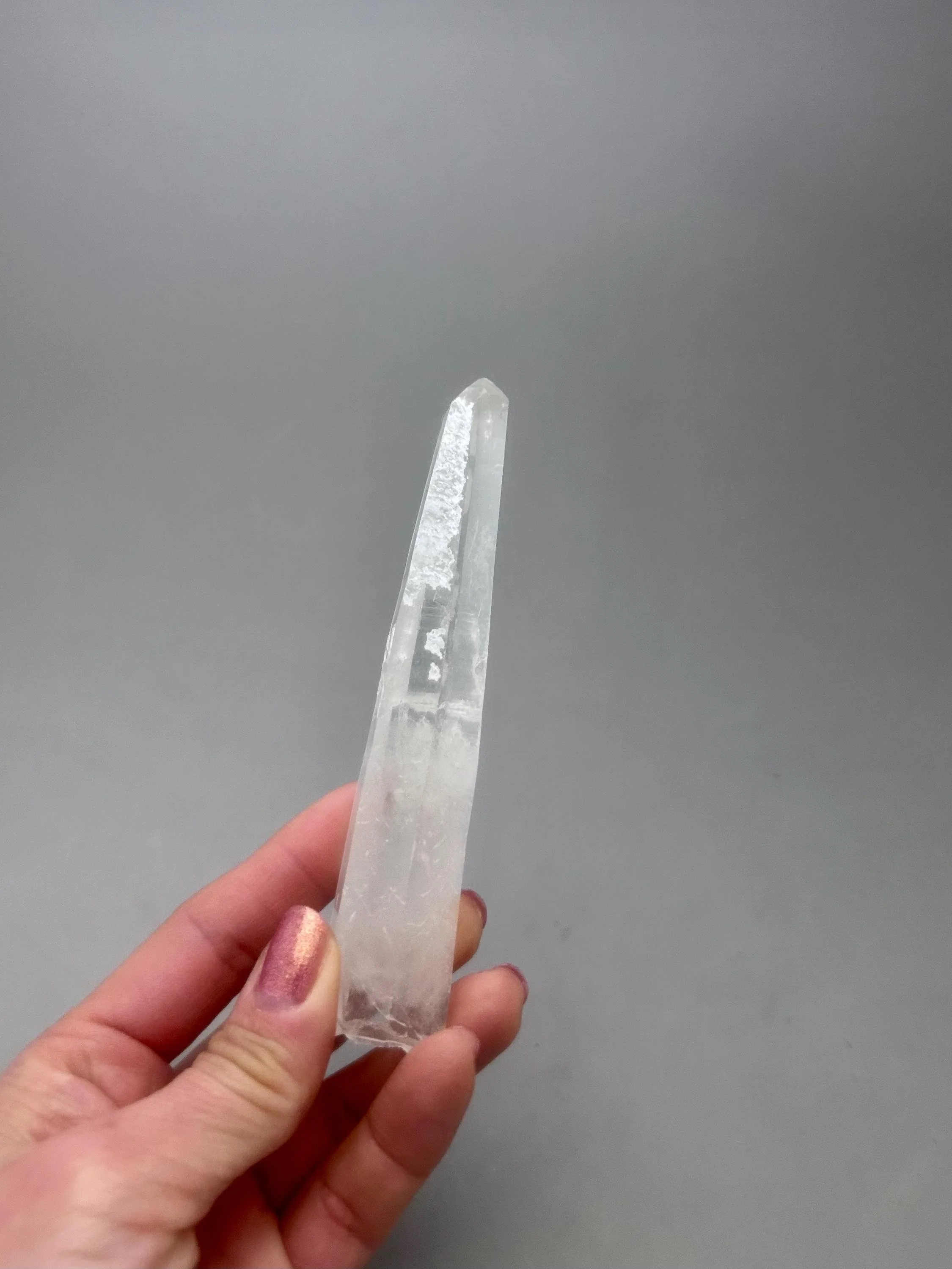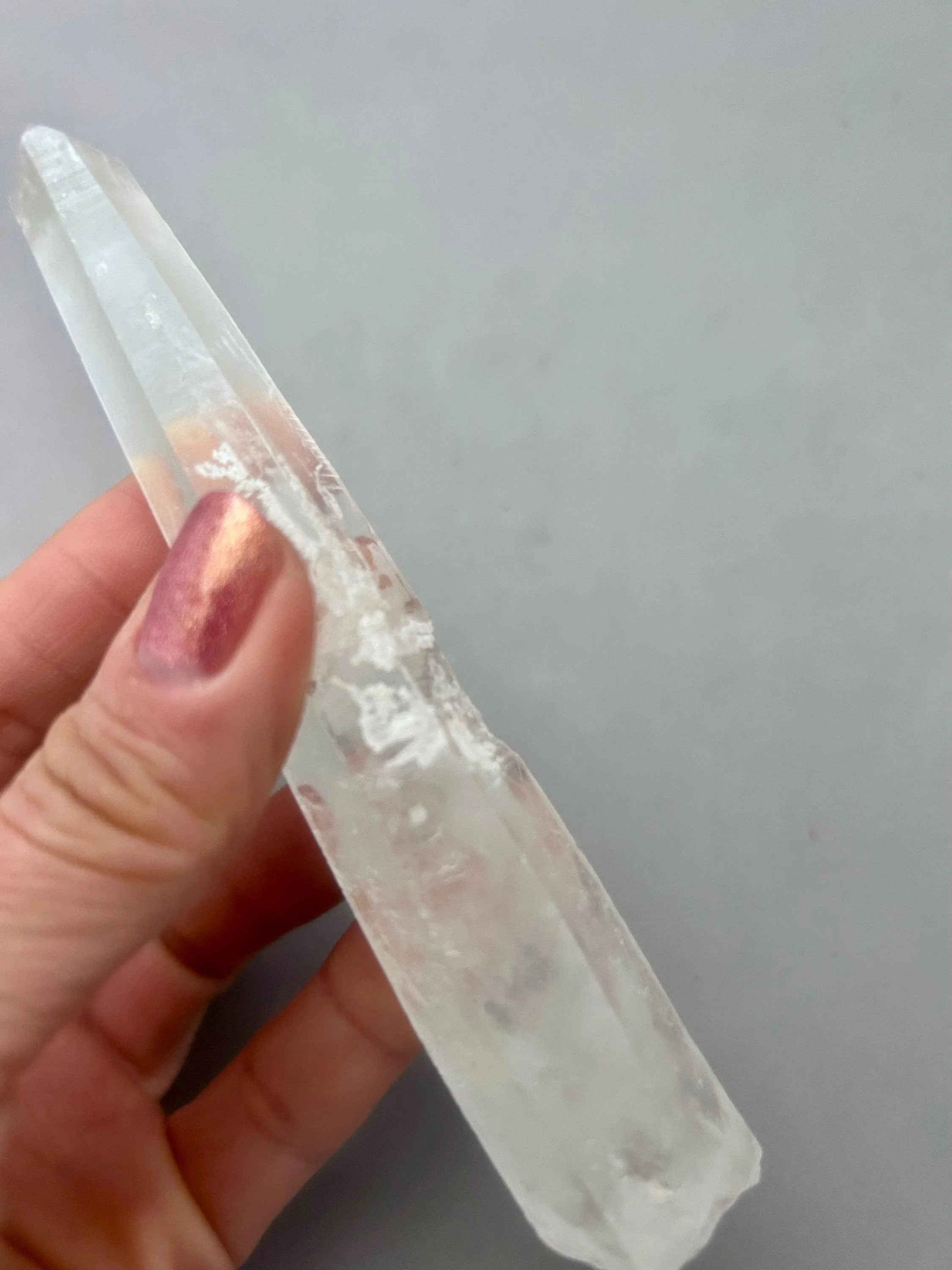 You will receive the exact piece as shown in the photos of this listing. The rough quartz point measures about 5 3/16" x 3/4" x 7/8" and weighs about 3.12 ounces. One one side of the piece is an area where another crystal could have been growing and was removed in the mining process, most likely. Many people love these little features especially to rub or place their thumb in this area.