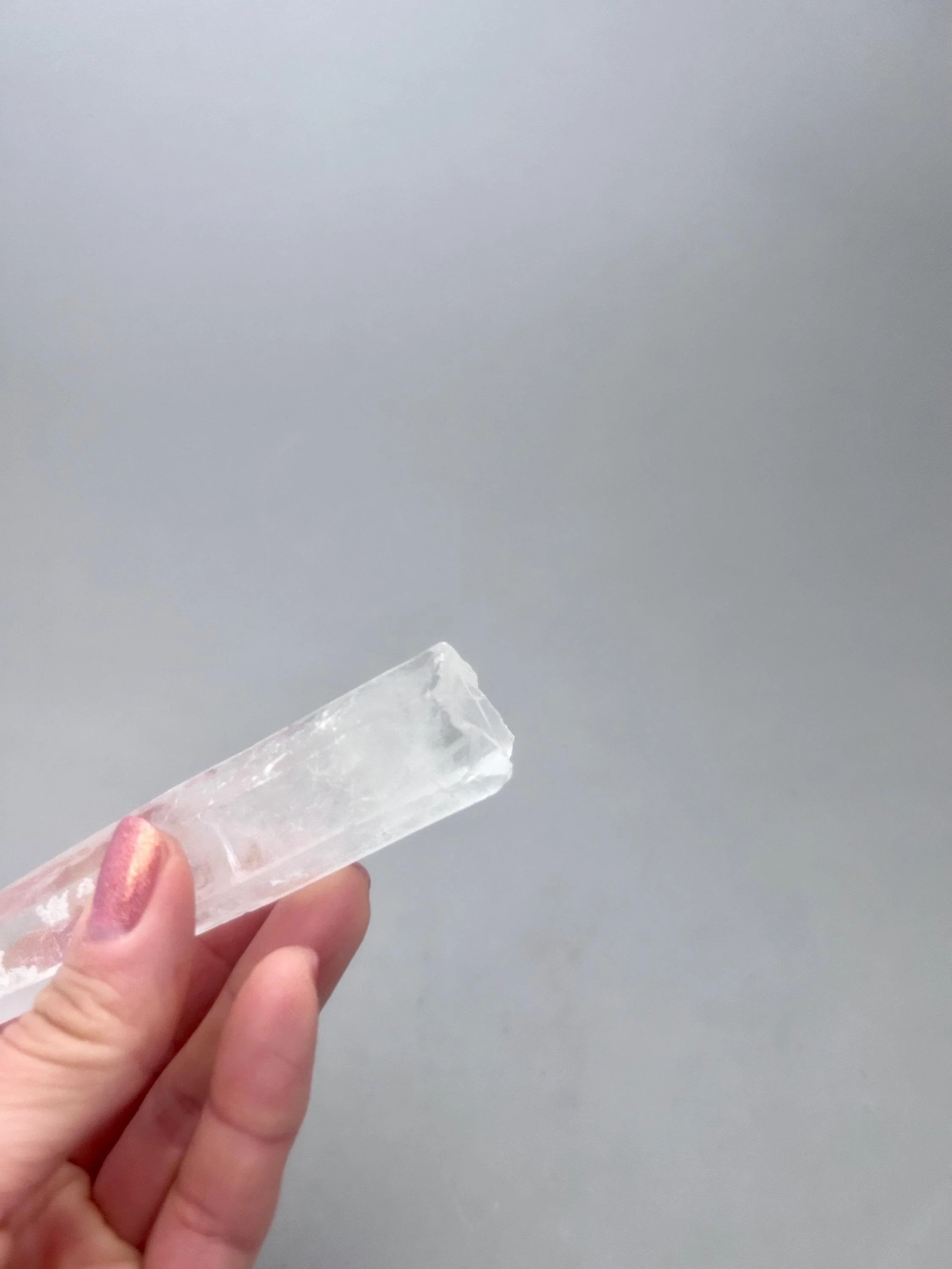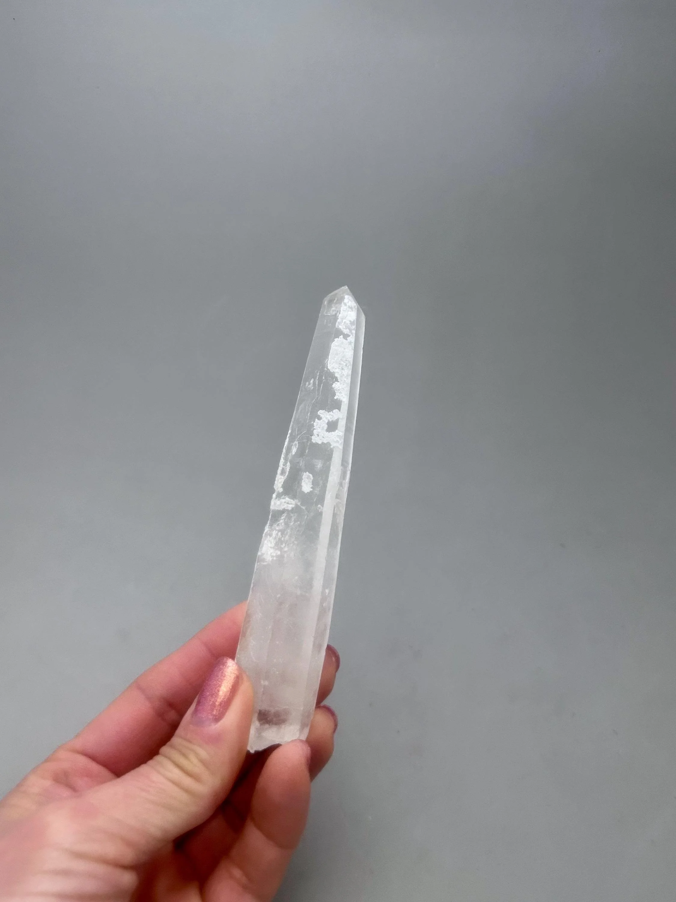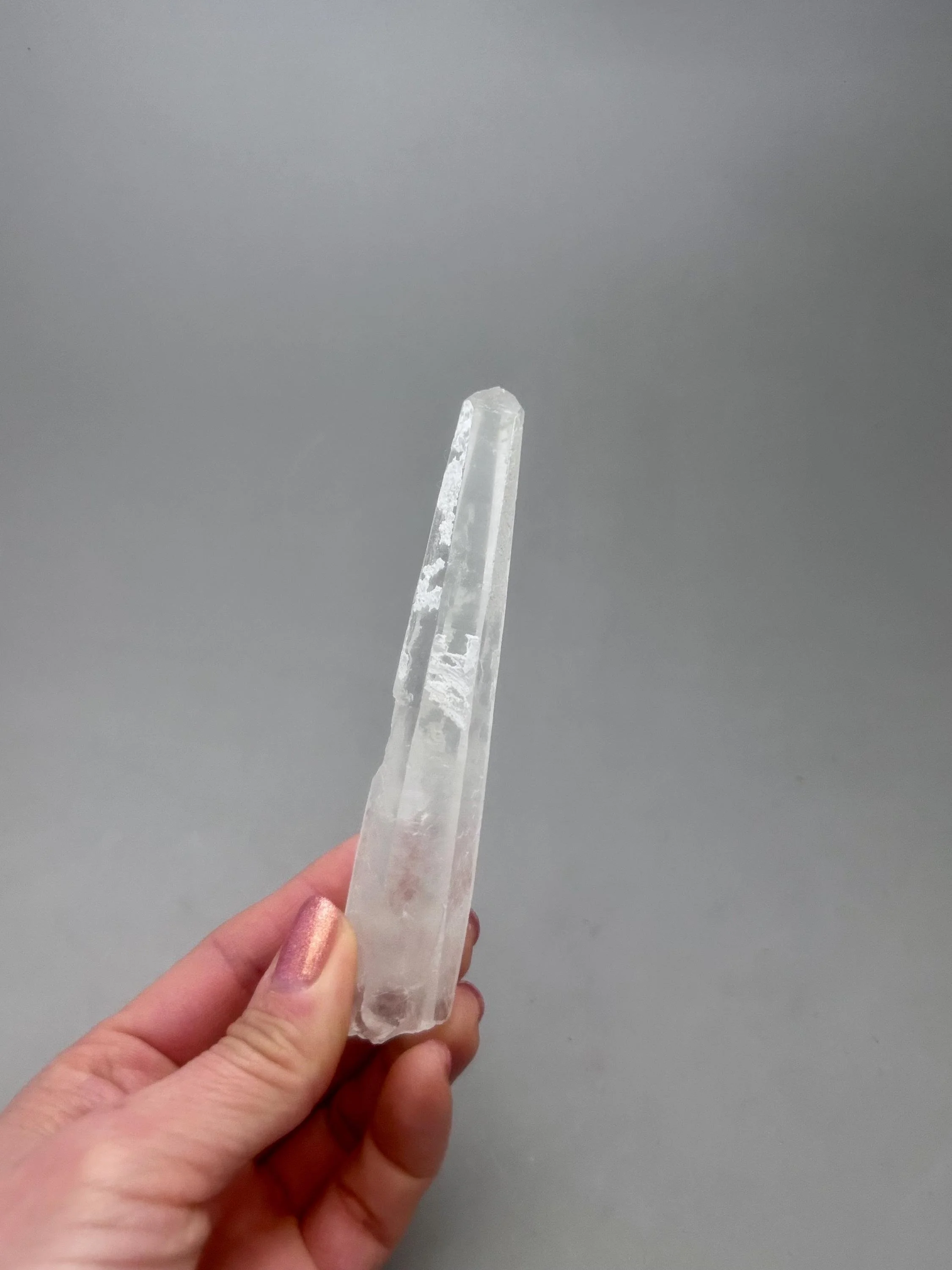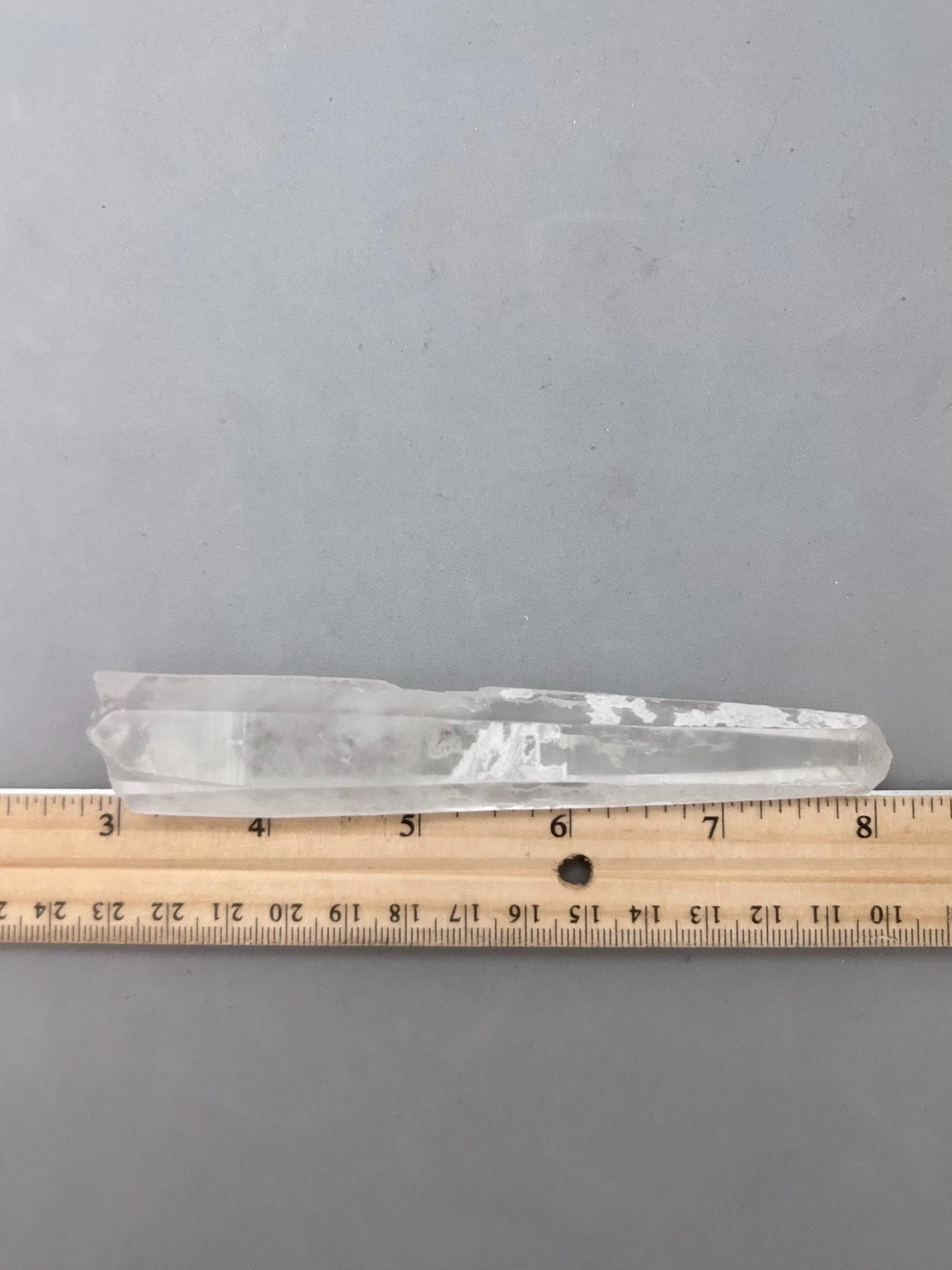 You will receive the exact piece as shown in the photos of this listing. The rough quartz point measures about 5 3/16" x 3/4" x 7/8" and weighs about 3.12 ounces. One one side of the piece is an area where another crystal could have been growing and was removed in the mining process, most likely. Many people love these little features especially to rub or place their thumb in this area.