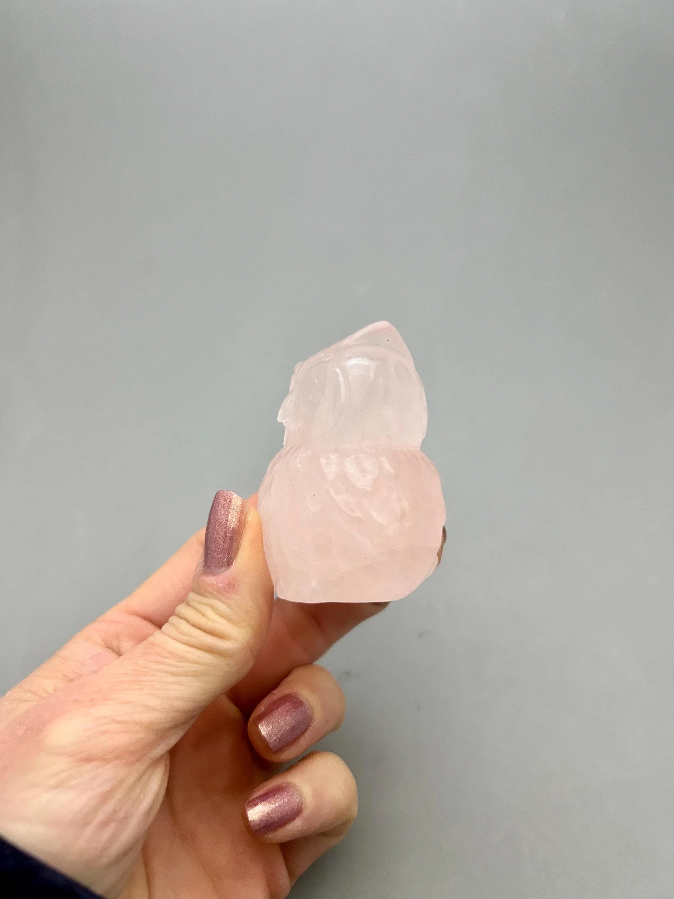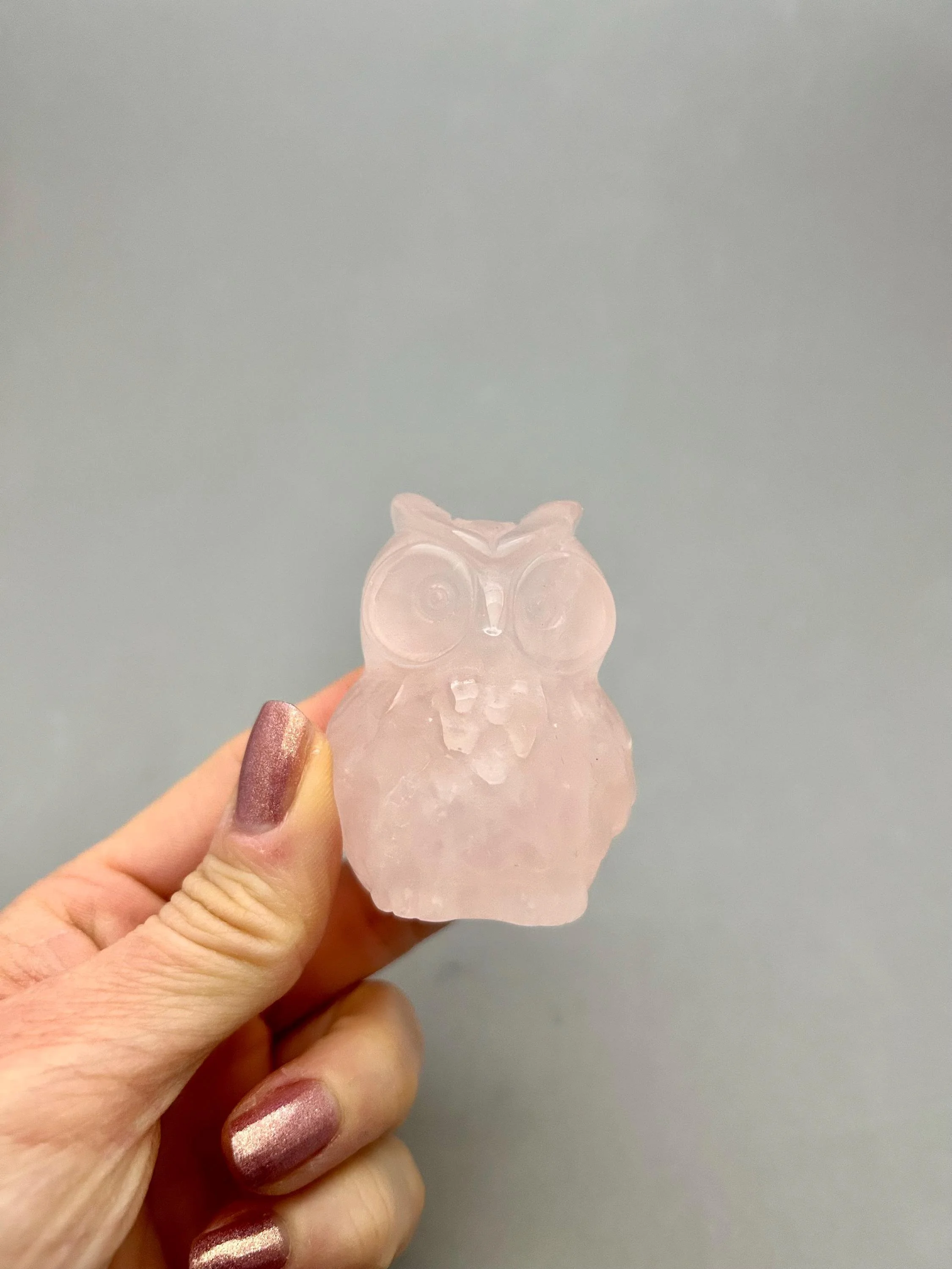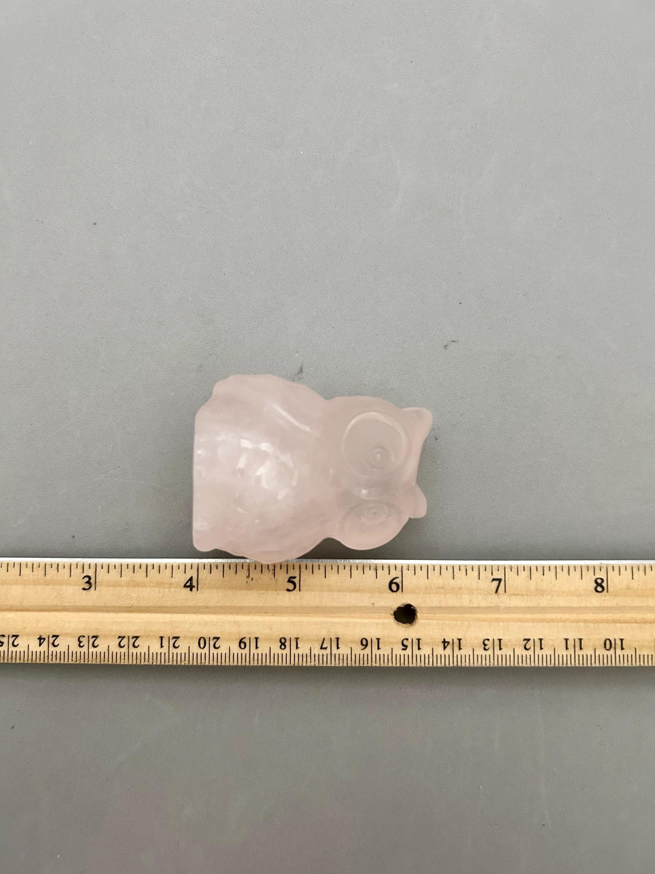 Isn't this chubby owl so cute‽ Made from rose quartz, it measures about 2 1/4" x 1 7/8" x 1 5/8" and weighs about 4.87 oz. You will receive the exact piece as shown in the photos and video of this listing.