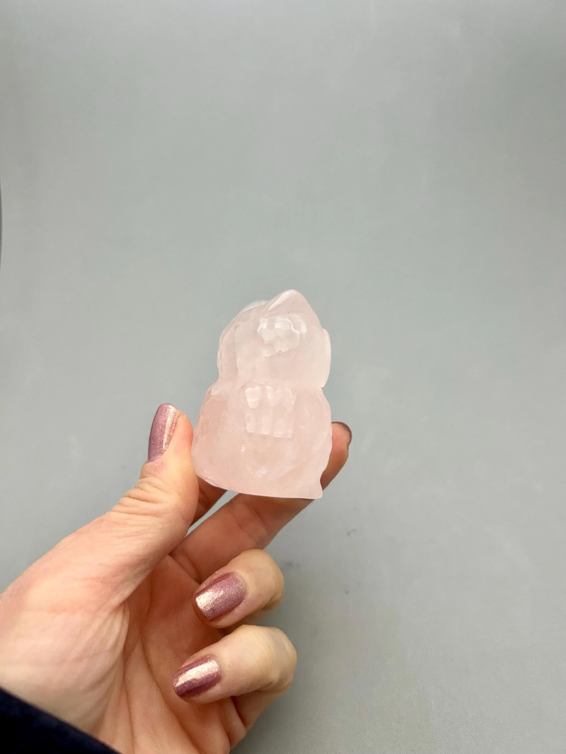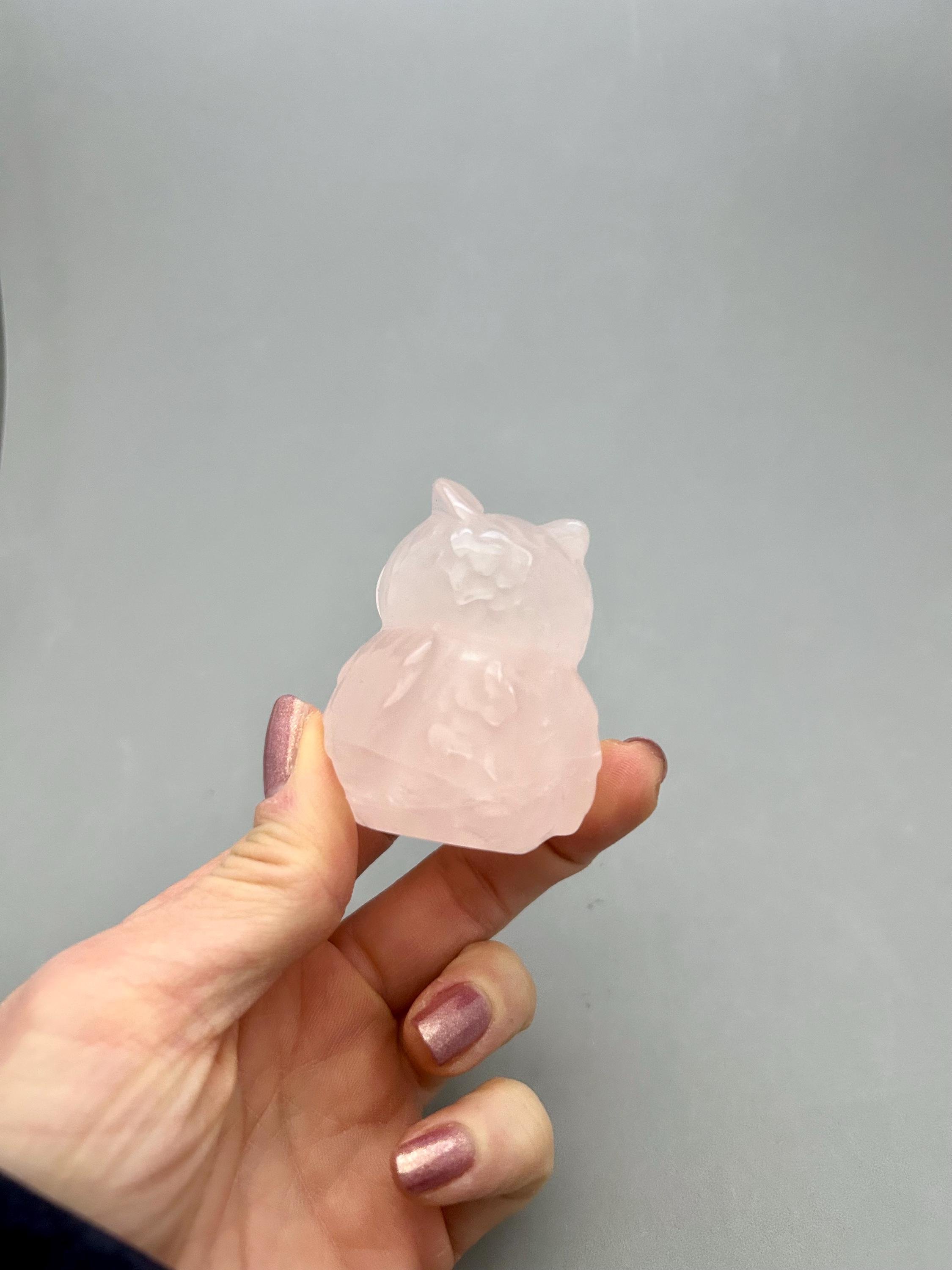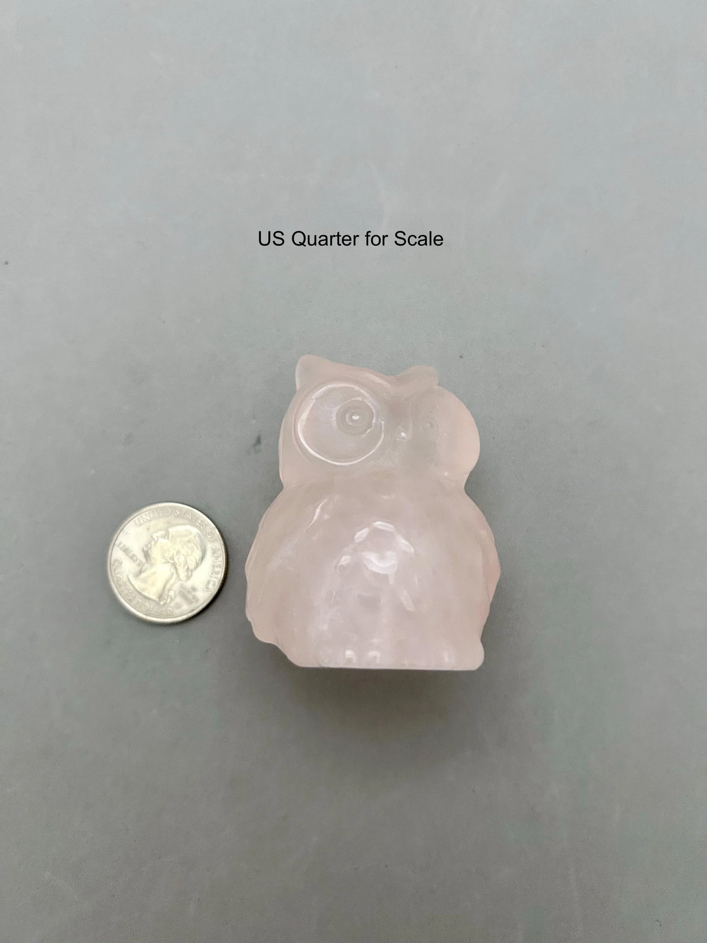 Isn't this chubby owl so cute‽ Made from rose quartz, it measures about 2 1/4" x 1 7/8" x 1 5/8" and weighs about 4.87 oz. You will receive the exact piece as shown in the photos and video of this listing.