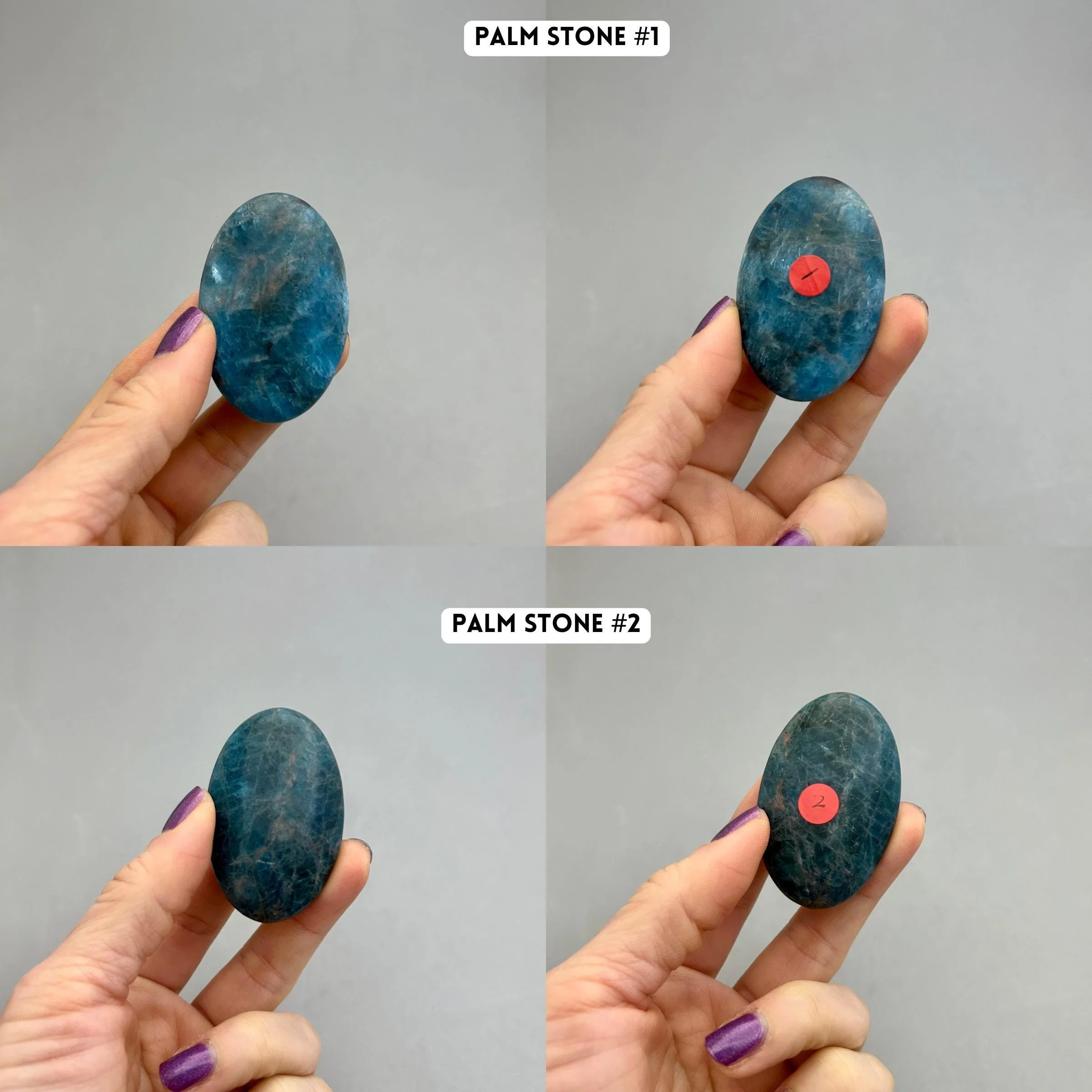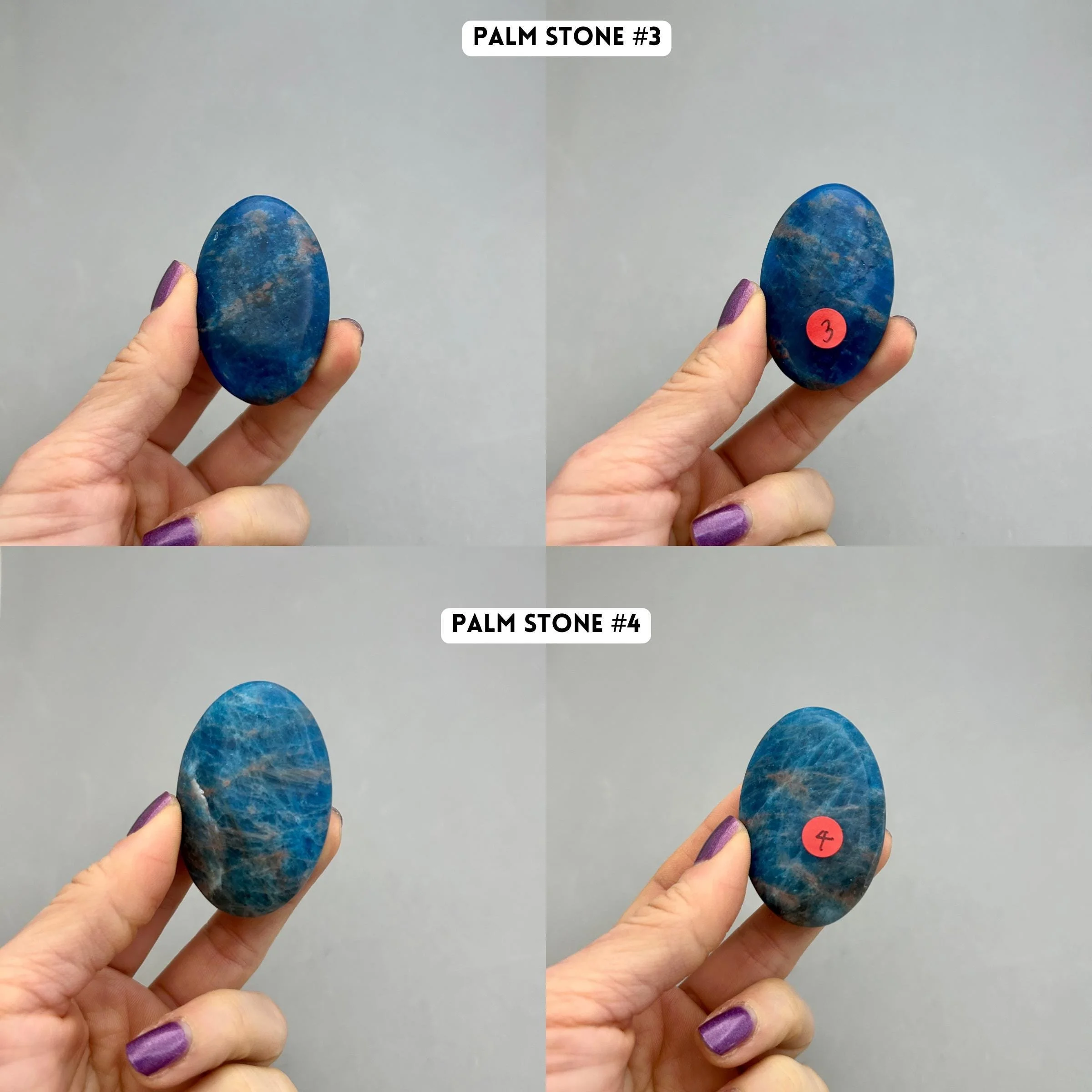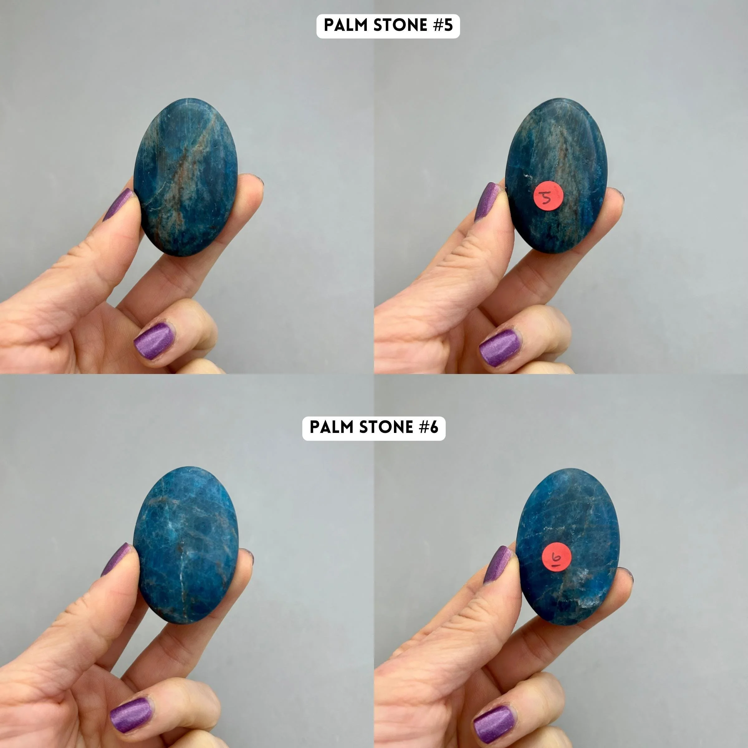 Blue apatite is one of my favorite blue stones based on color alone. These palm stones are a beautiful quality in color and the most consistent in shape and size that I’ve seen in a while, which makes them great if you like to work with them in pairs. You will choose your palm stone upon checkout. Here’s more information for each piece: