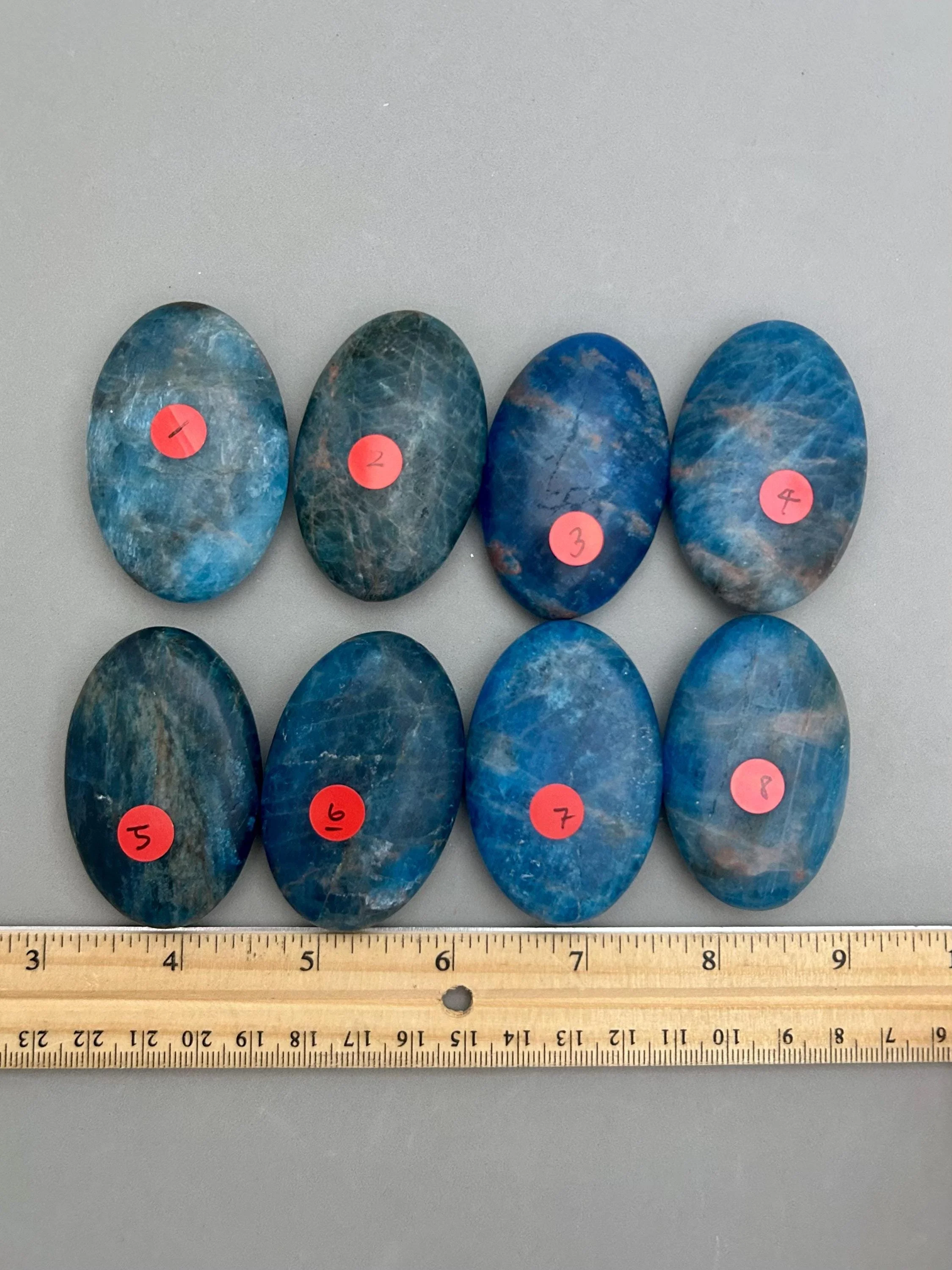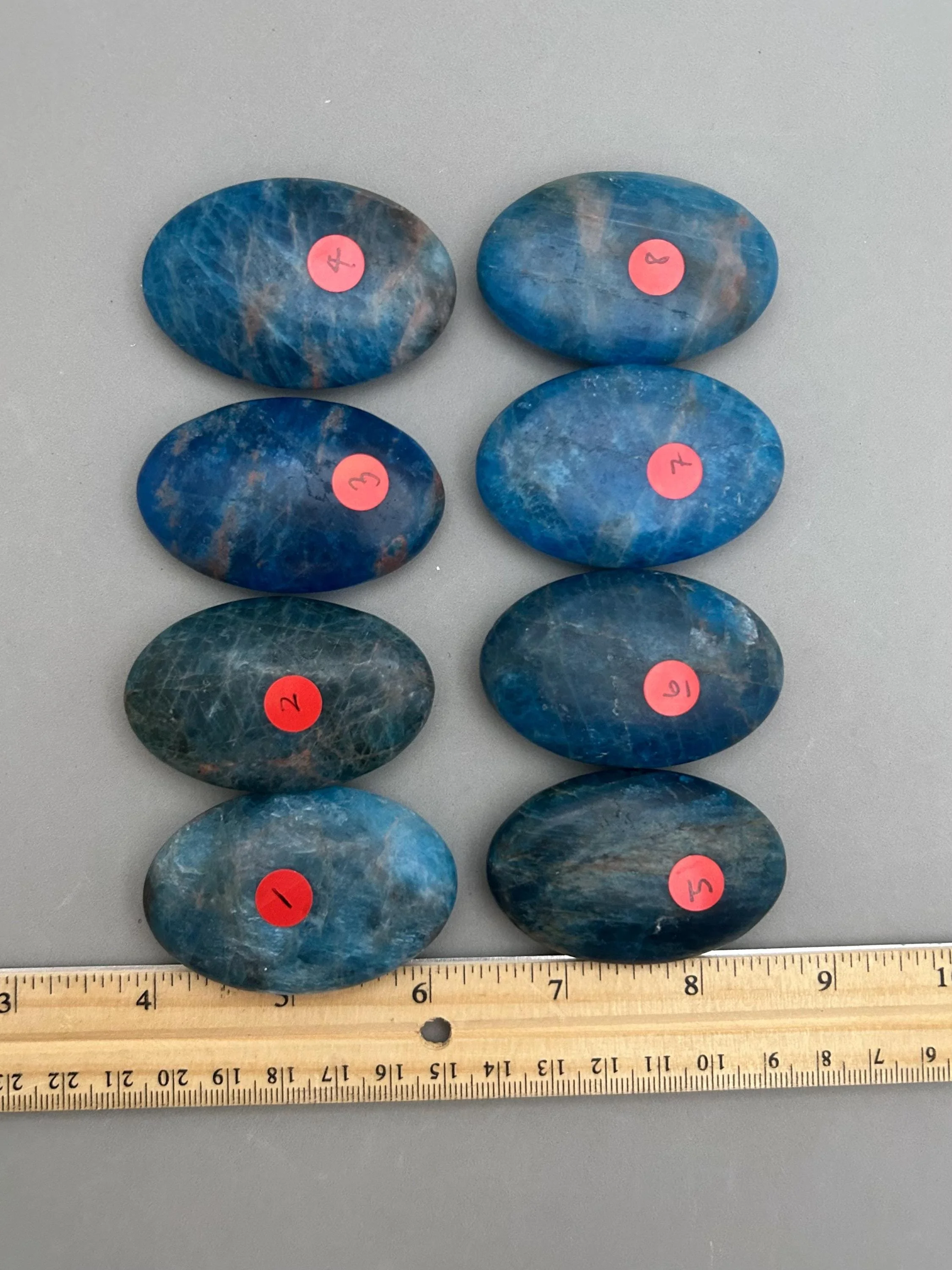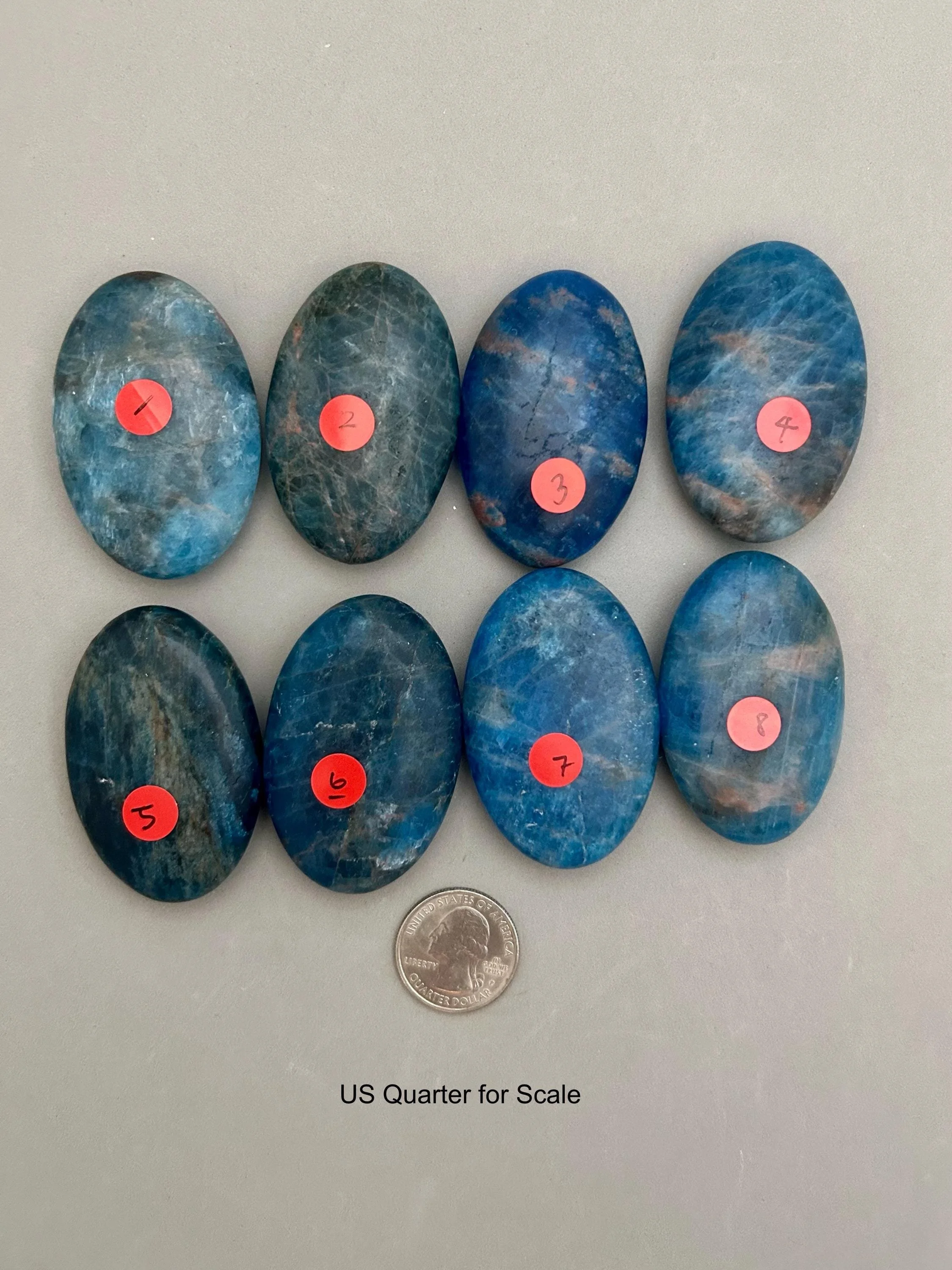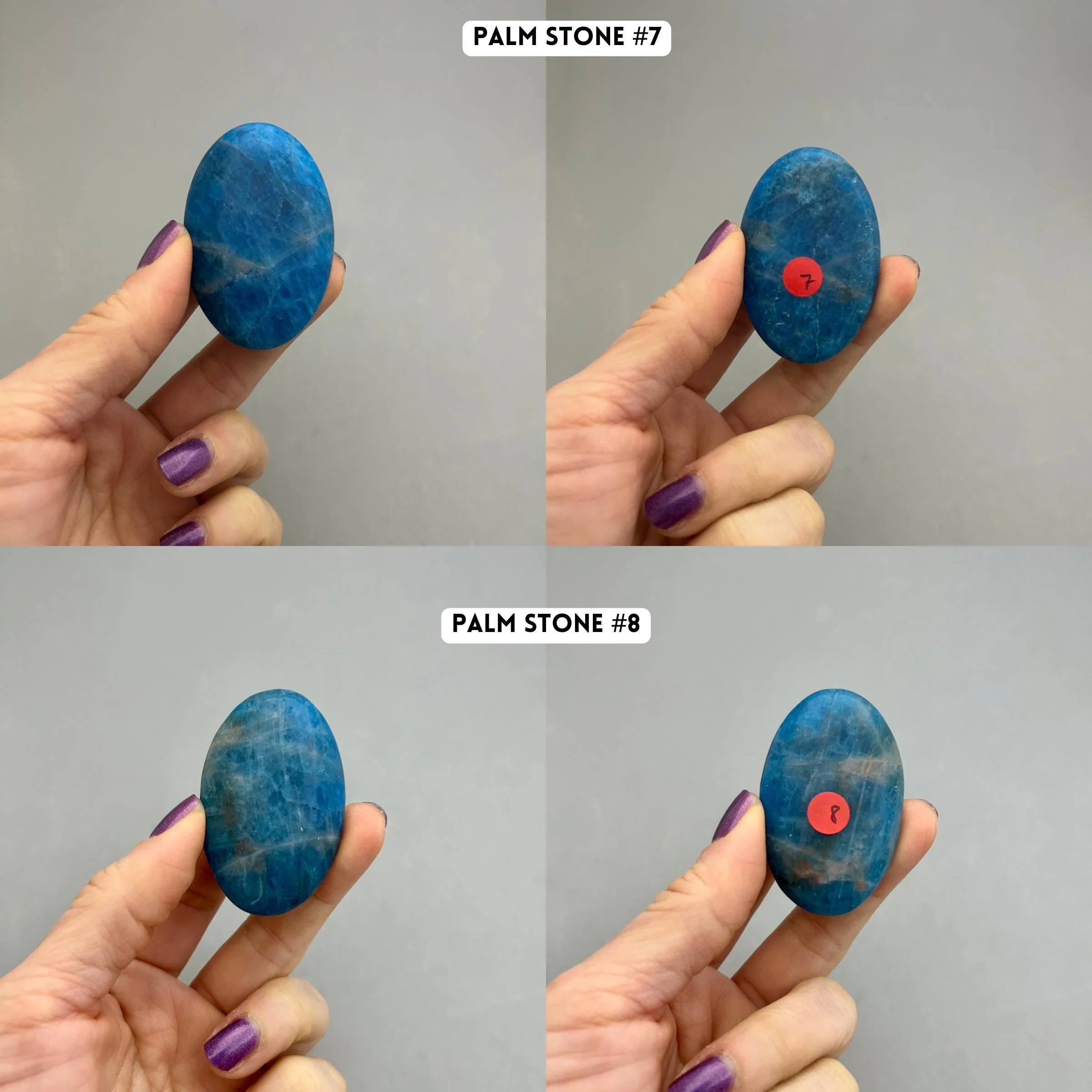 Blue apatite is one of my favorite blue stones based on color alone. These palm stones are a beautiful quality in color and the most consistent in shape and size that I’ve seen in a while, which makes them great if you like to work with them in pairs. You will choose your palm stone upon checkout. Here’s more information for each piece: