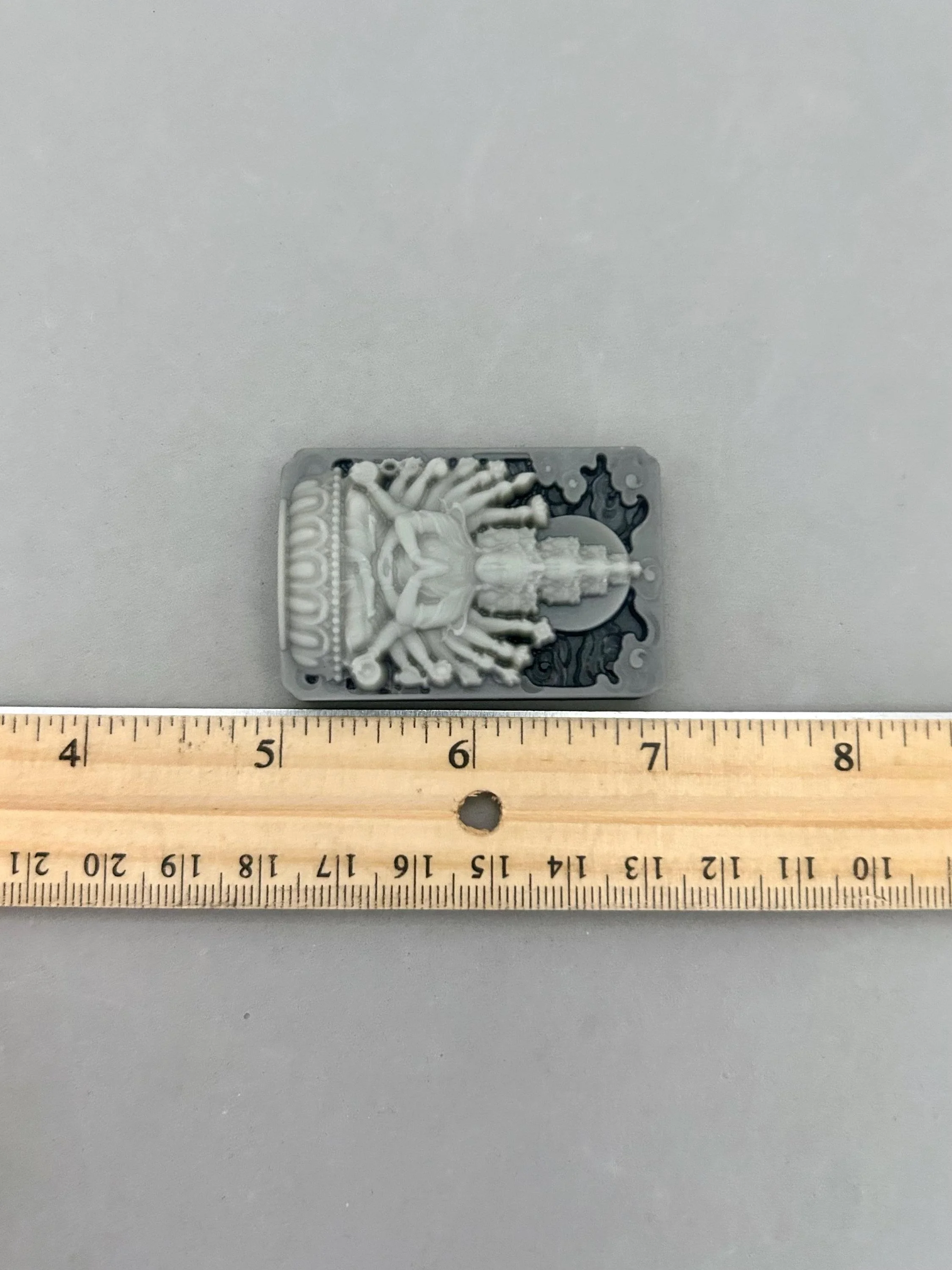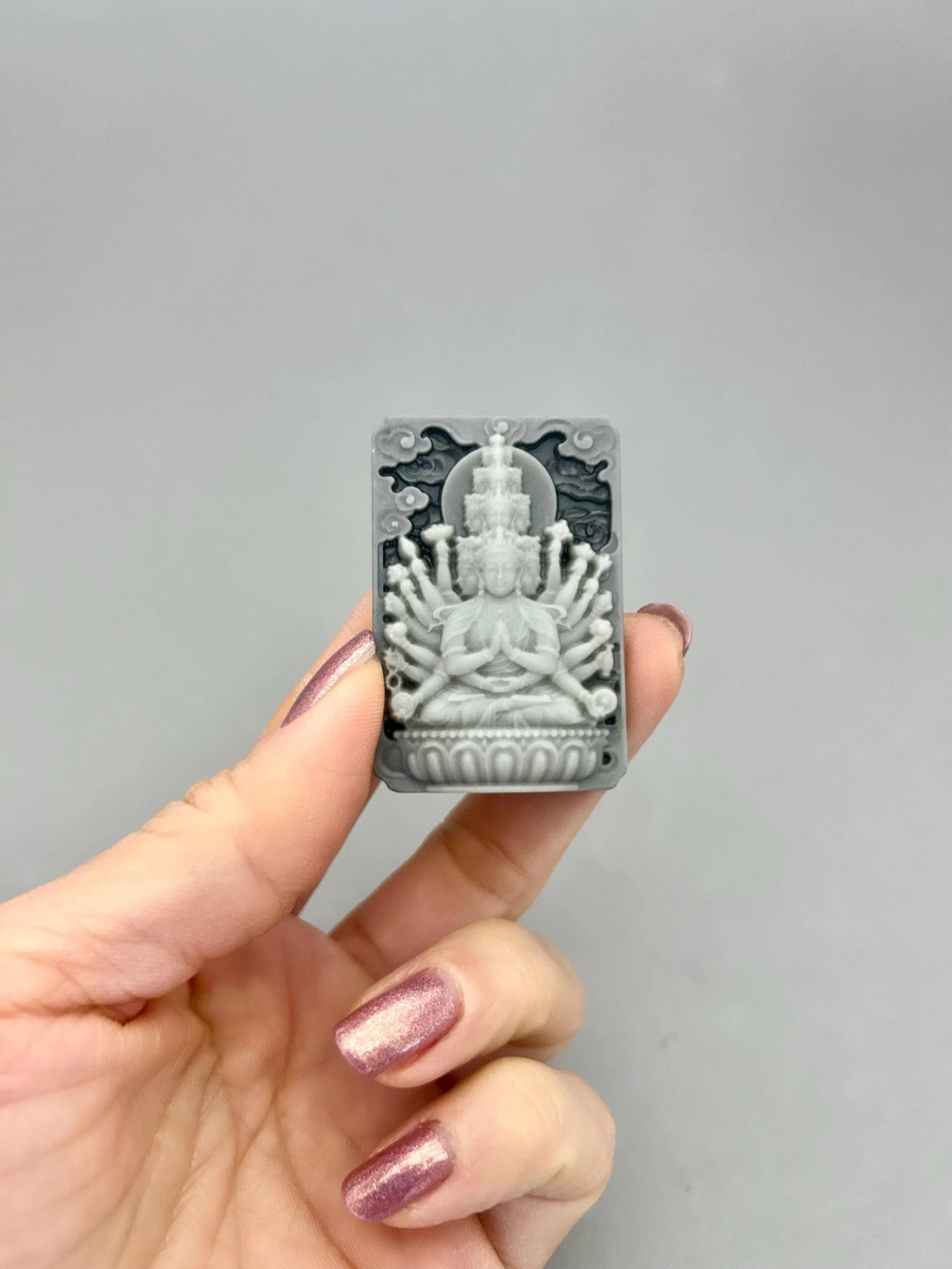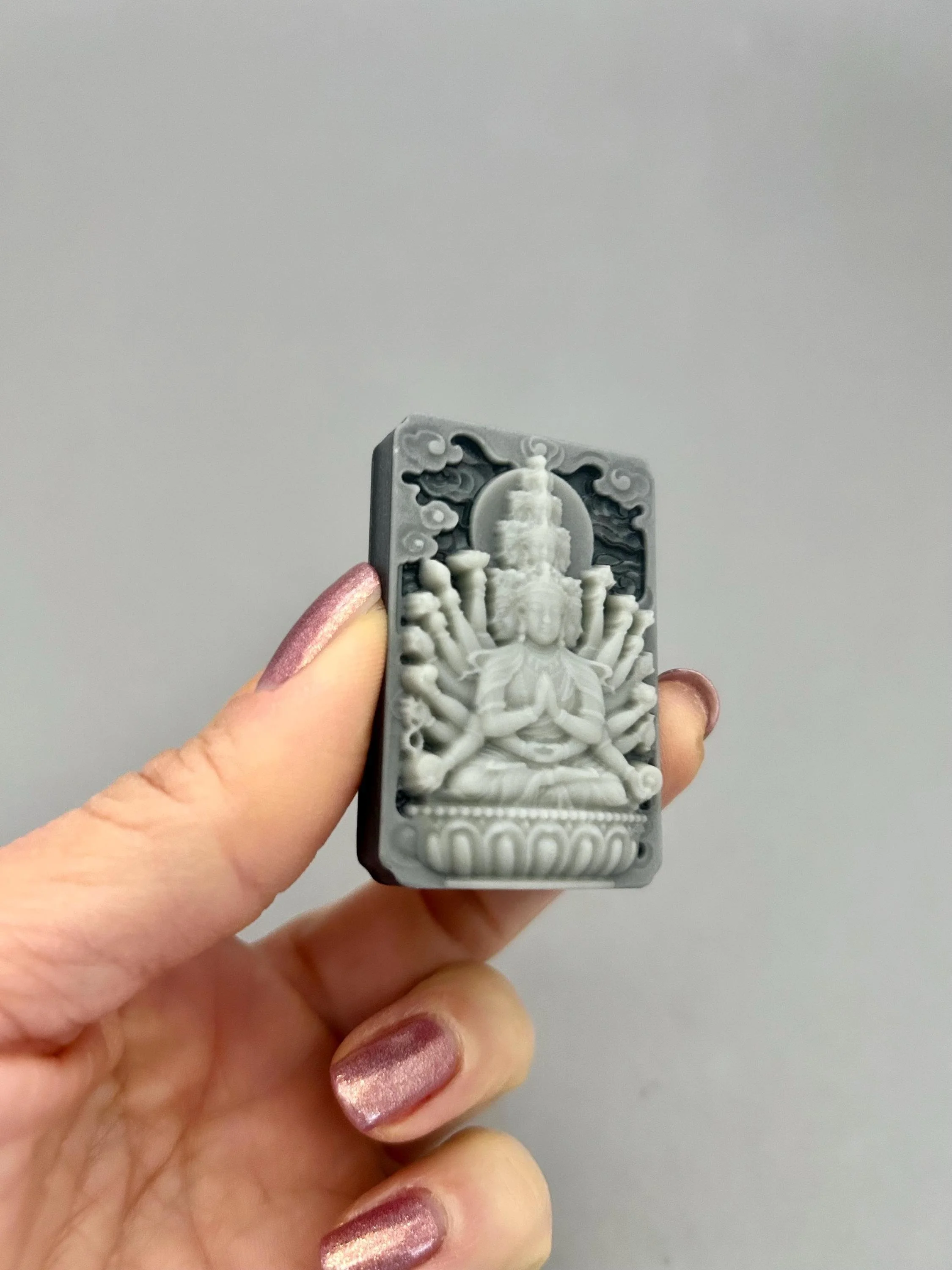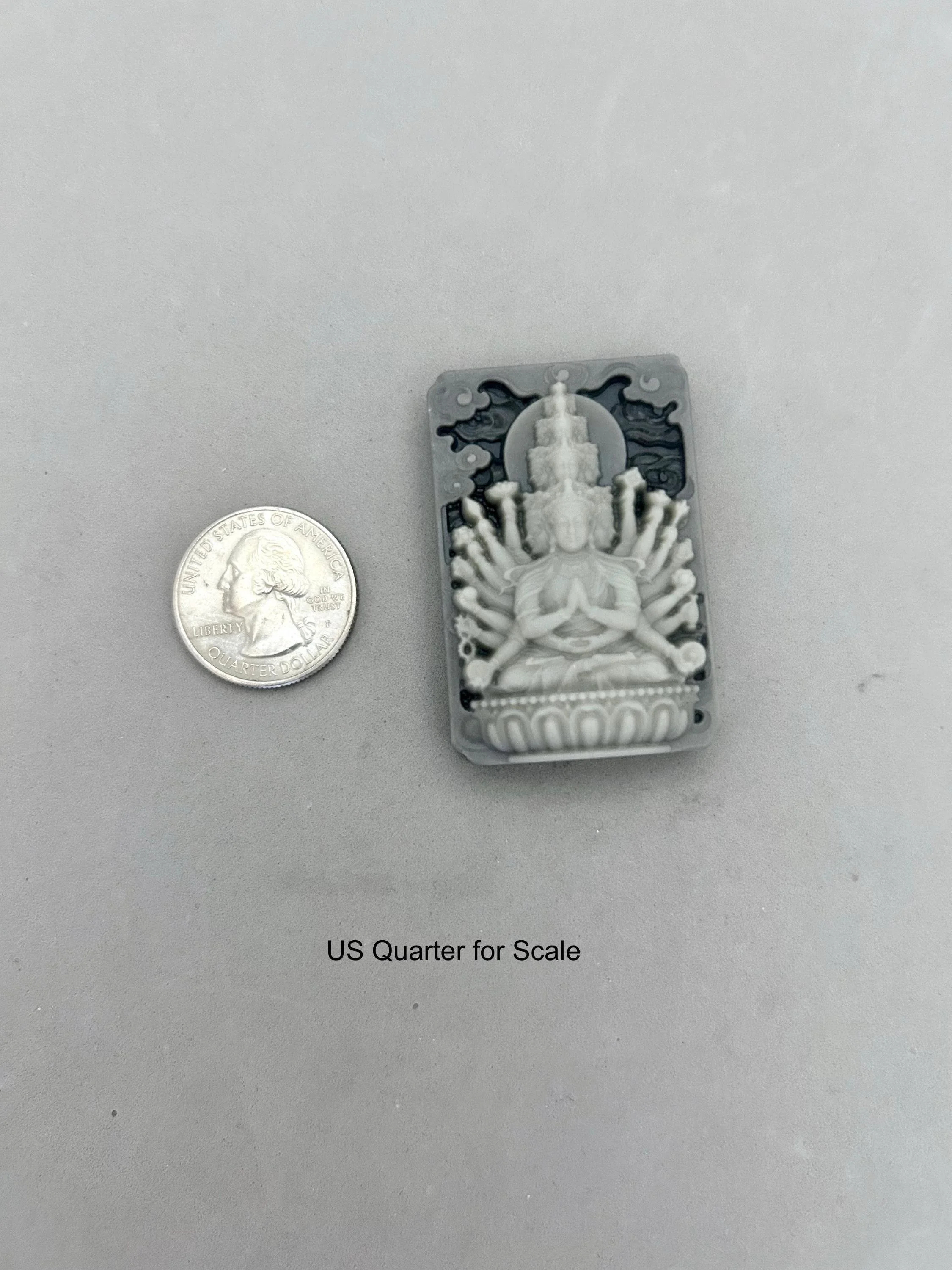 Kwan Yin, or Guan Yin, is a bodhisattva, known for providing compassion for humanity. Legend says she foregone nirvana and vowed to help humanity, and is sometimes described as the Mother of Compassion or She Who Hears All Cries. Many people bring their worries, concerns and fears to Kwan Yin to transmute. This carving depicts a version of Kwan yin featuring multiple arms and faces. This version represents that she is here for all. Sometimes this version is known as the thousand arm Kwan yin, but of course, does not depict 1,000 arms.