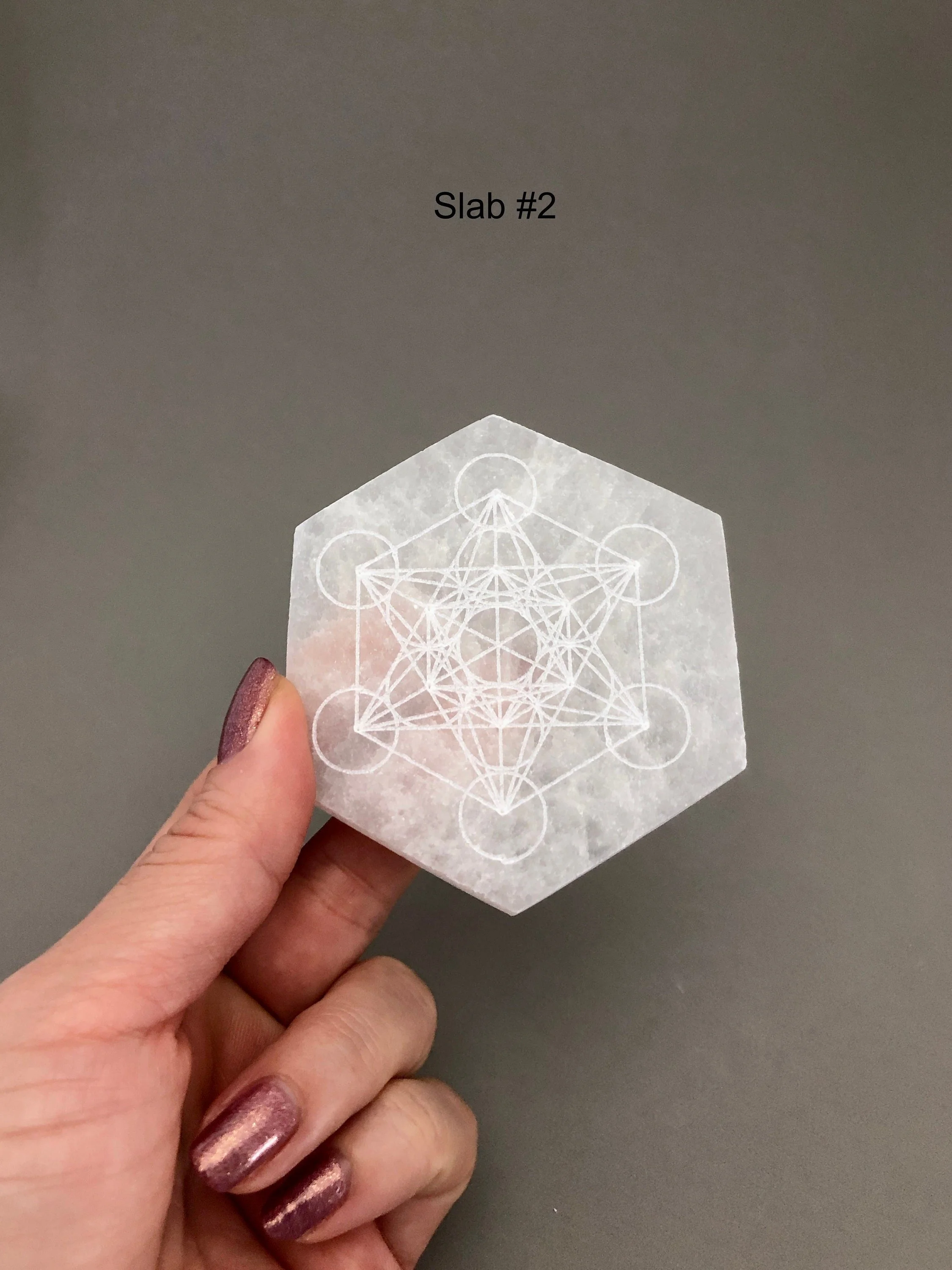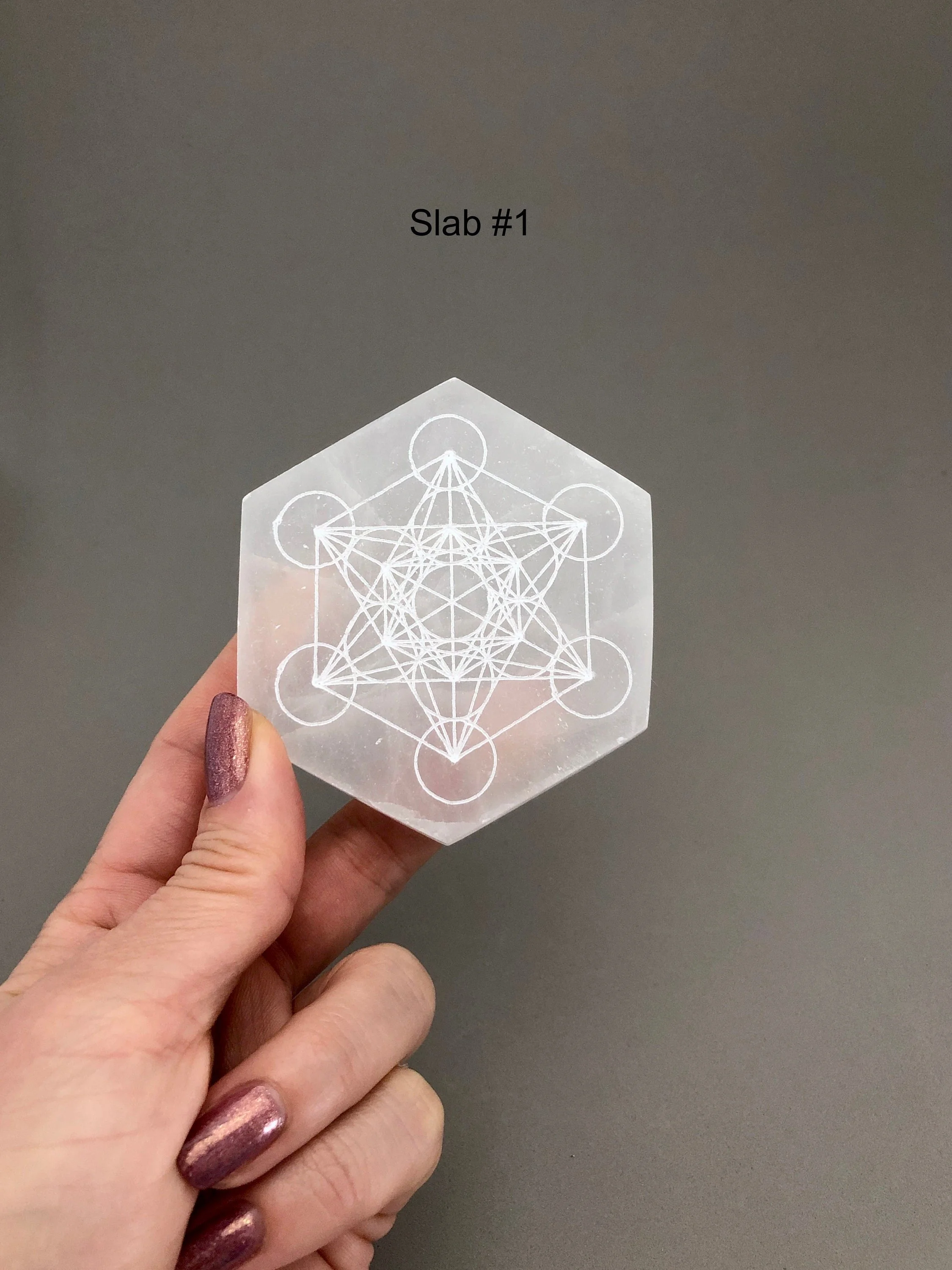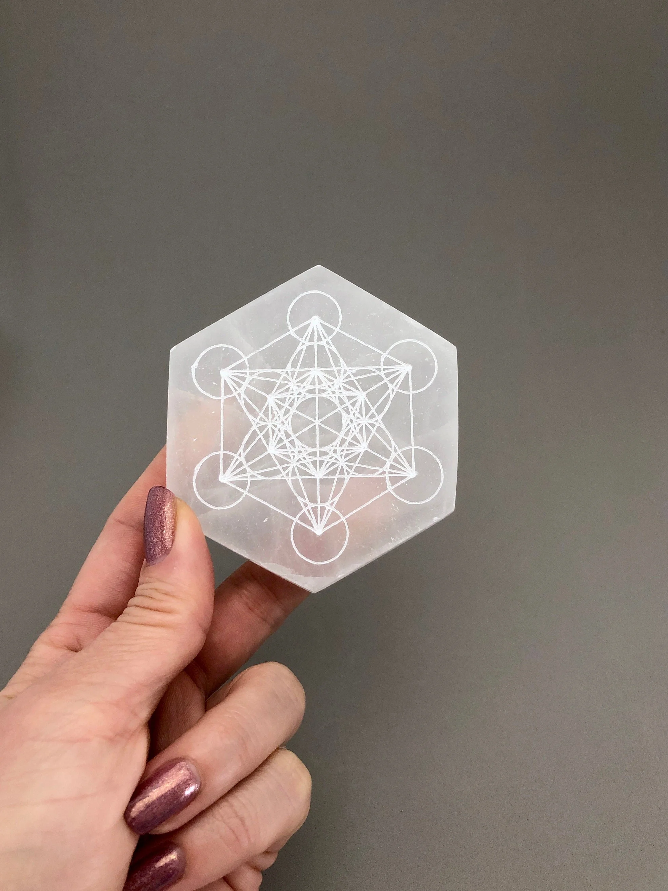 Want to add an extra boost of energy to your crystal grids, jewelry and more? How about this selenite slab featuring Metatron's cube on one side. Metatron's cube is a popular part of sacred geometry. It is said to contain all the geometry, shapes and math in the universe, which makes them the building blocks of energy in our physical and non physical worlds. This energy is akin to the Magician of the tarot deck. You will choose your preferred piece upon checkout. Here are some more details: