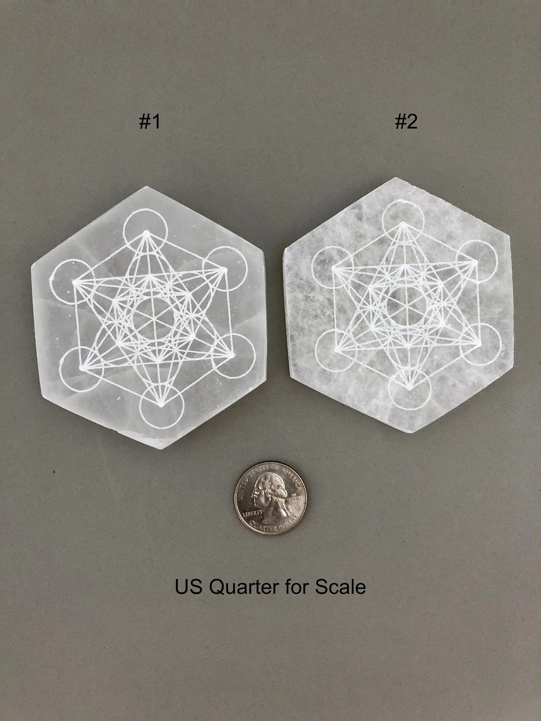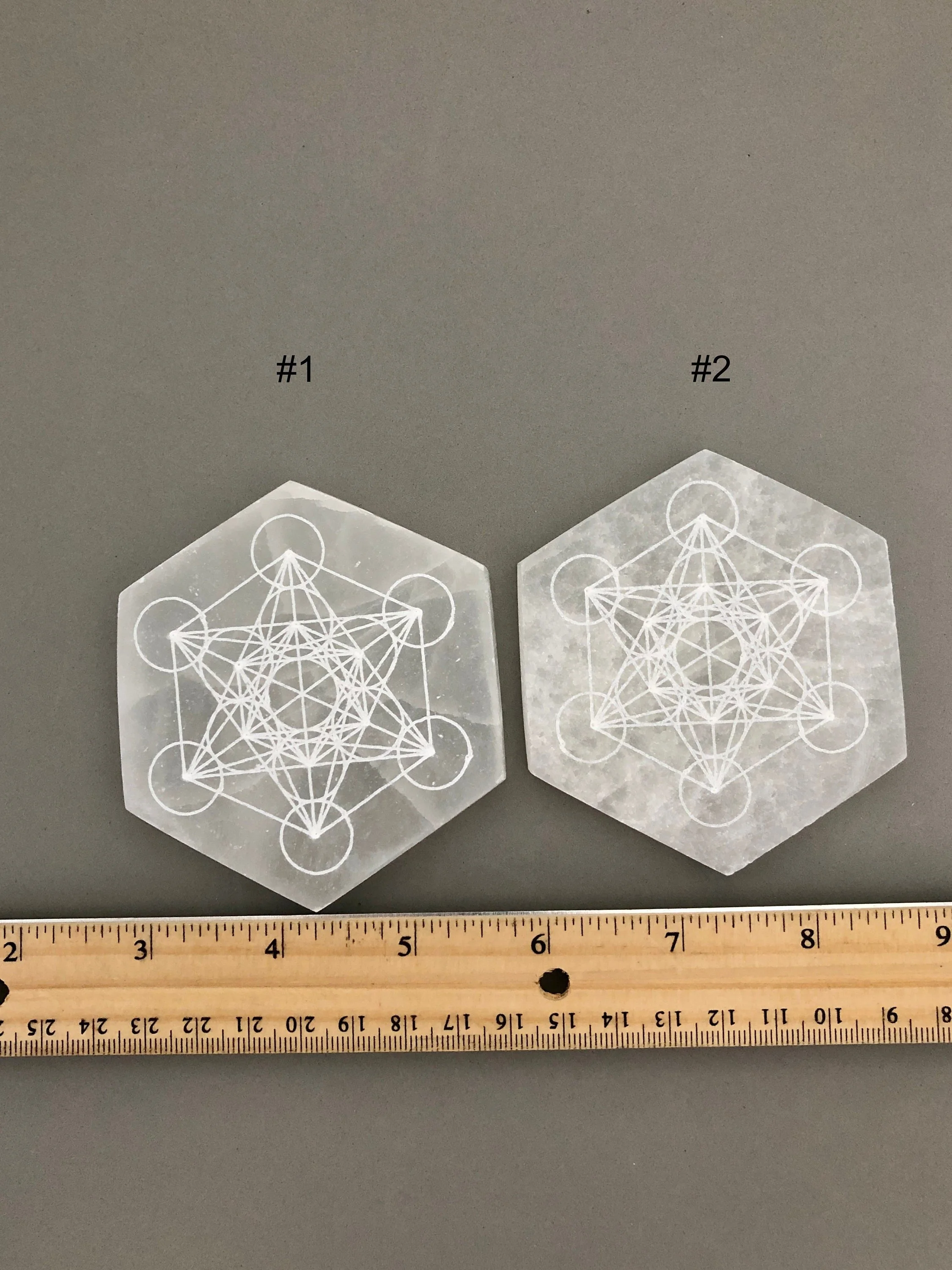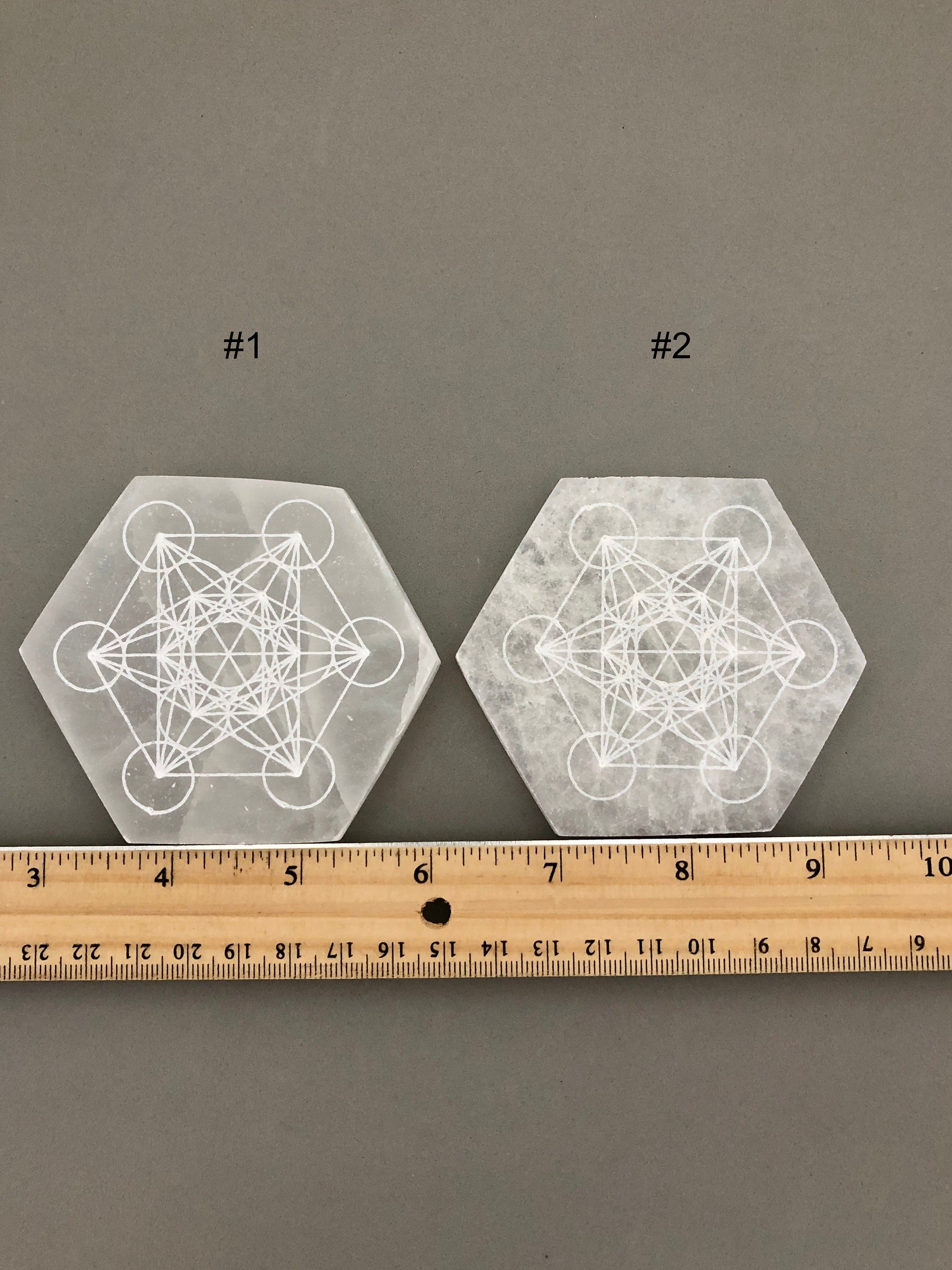Want to add an extra boost of energy to your crystal grids, jewelry and more? How about this selenite slab featuring Metatron's cube on one side. Metatron's cube is a popular part of sacred geometry. It is said to contain all the geometry, shapes and math in the universe, which makes them the building blocks of energy in our physical and non physical worlds. This energy is akin to the Magician of the tarot deck. You will choose your preferred piece upon checkout. Here are some more details: